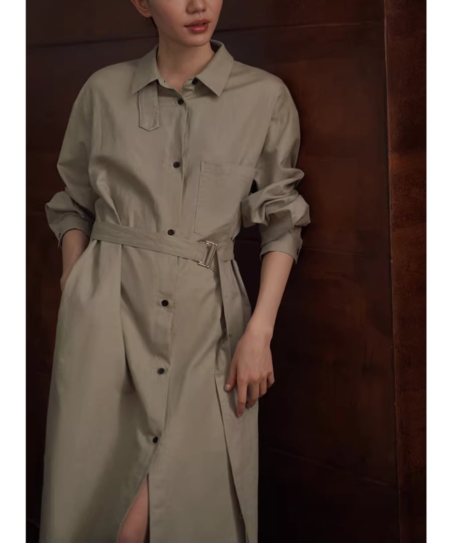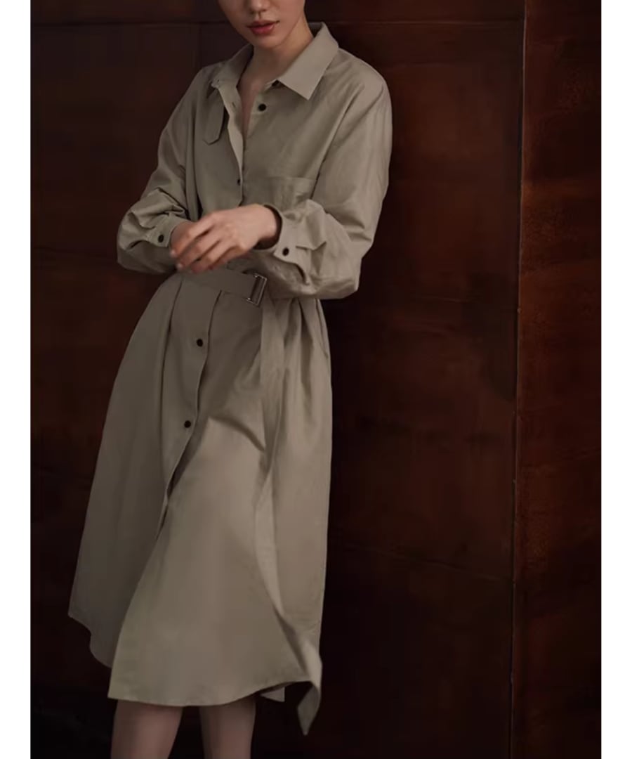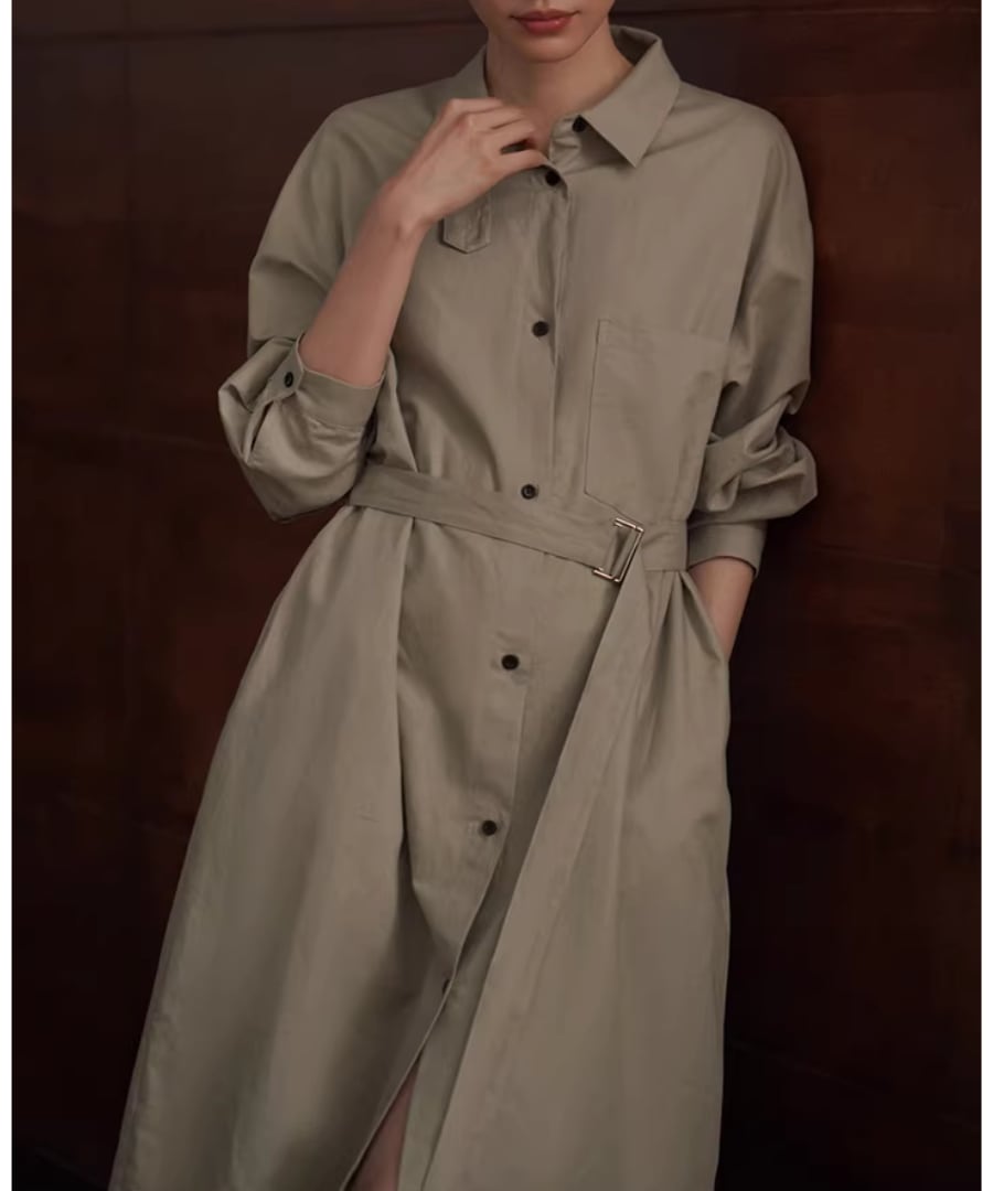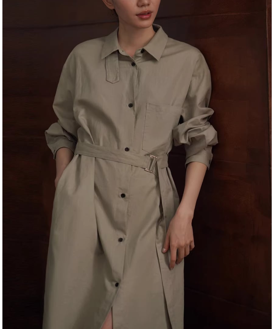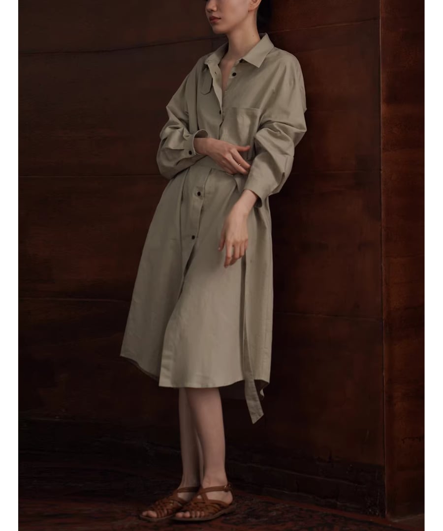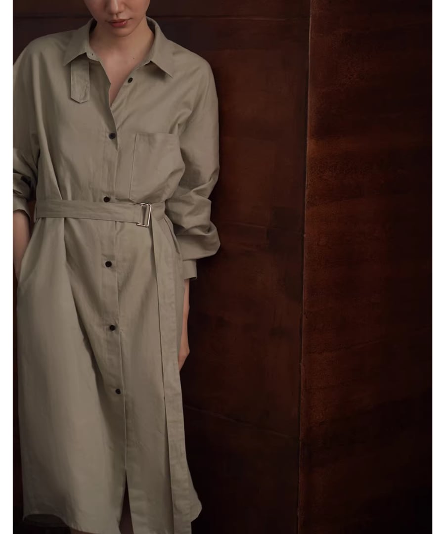 リネンコットン混紡シャツカラーのゆったりHラインベルト付きワンピースです。