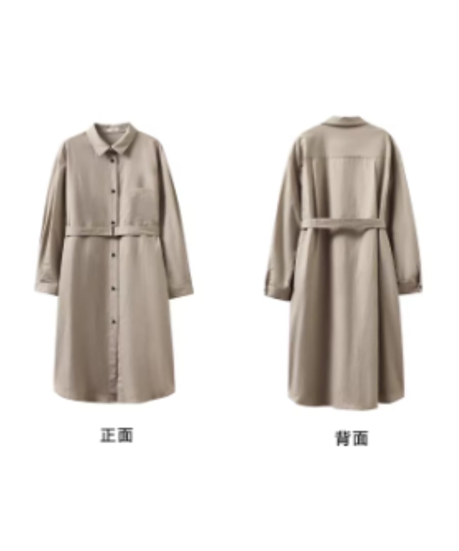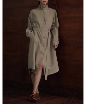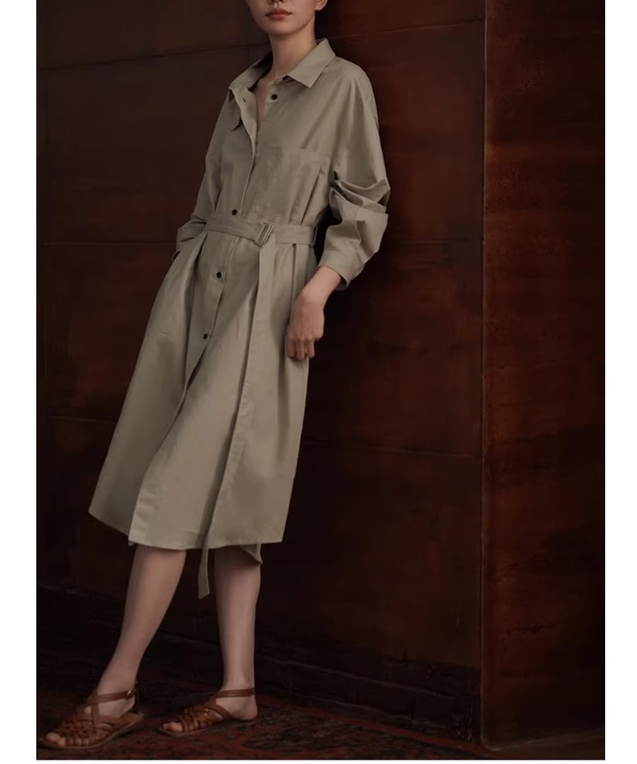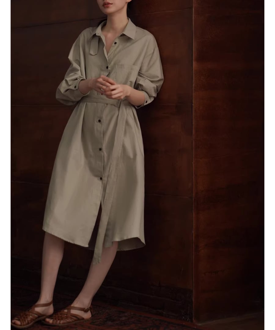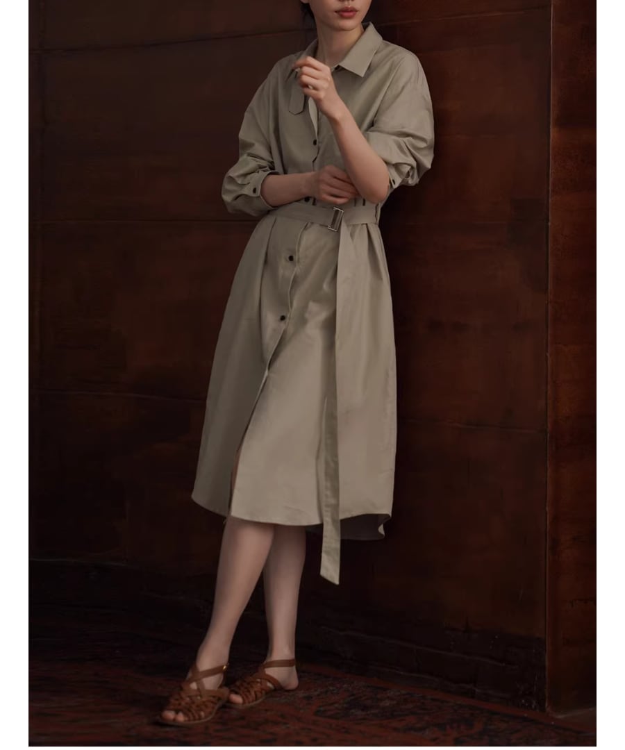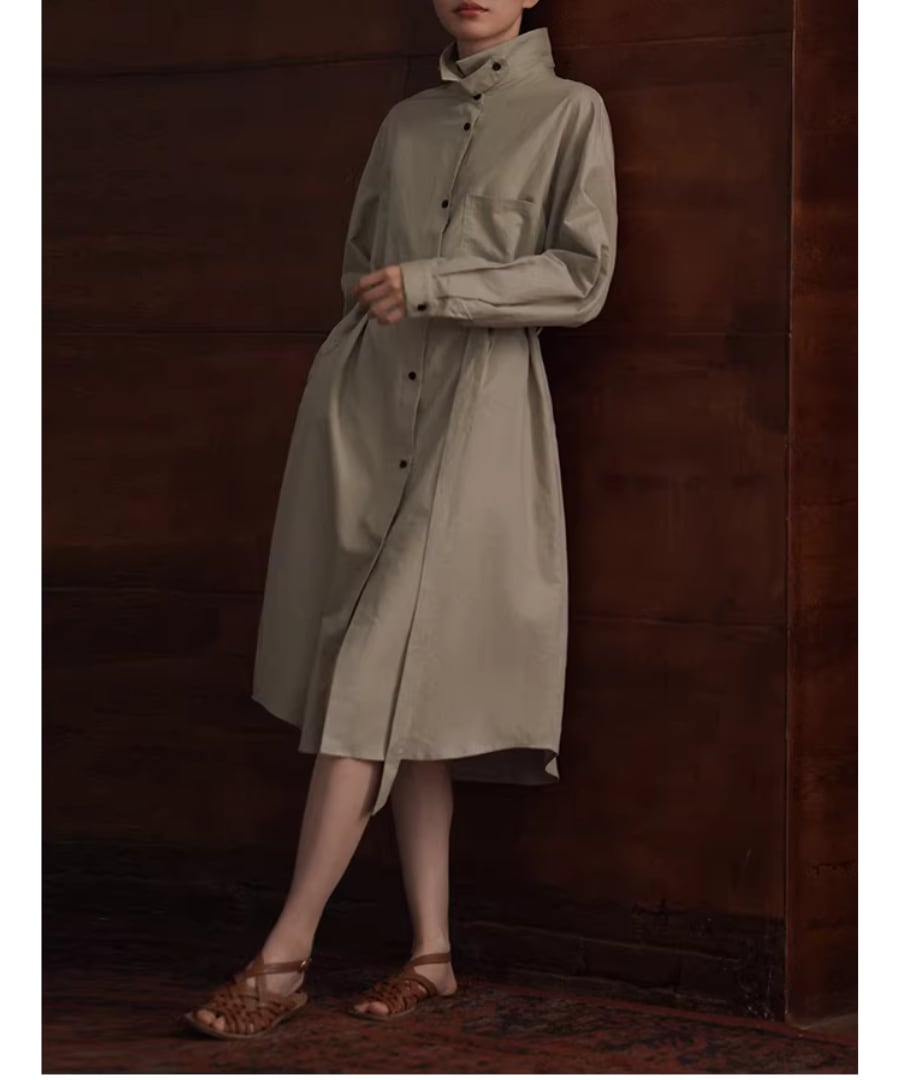 リネンコットン混紡シャツカラーのゆったりHラインベルト付きワンピースです。