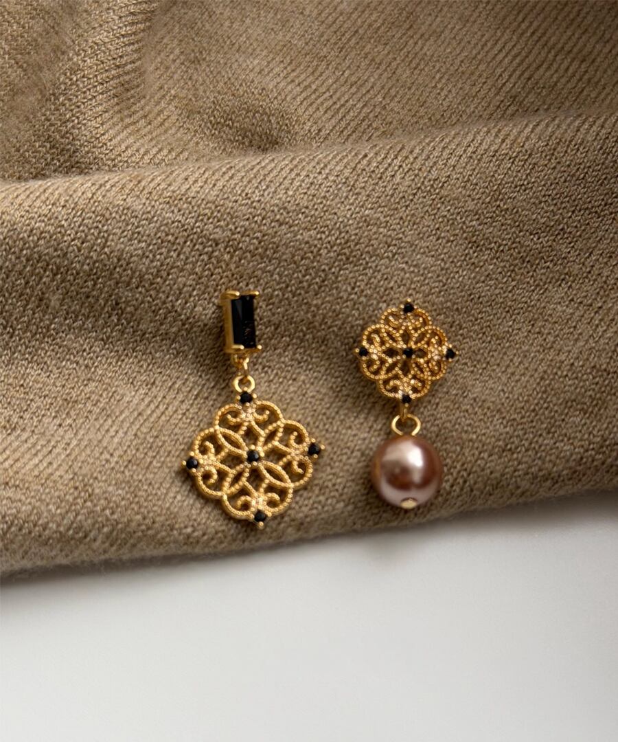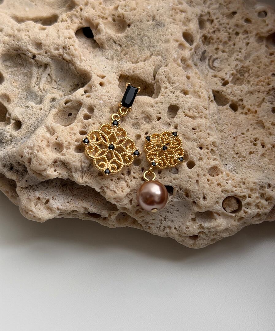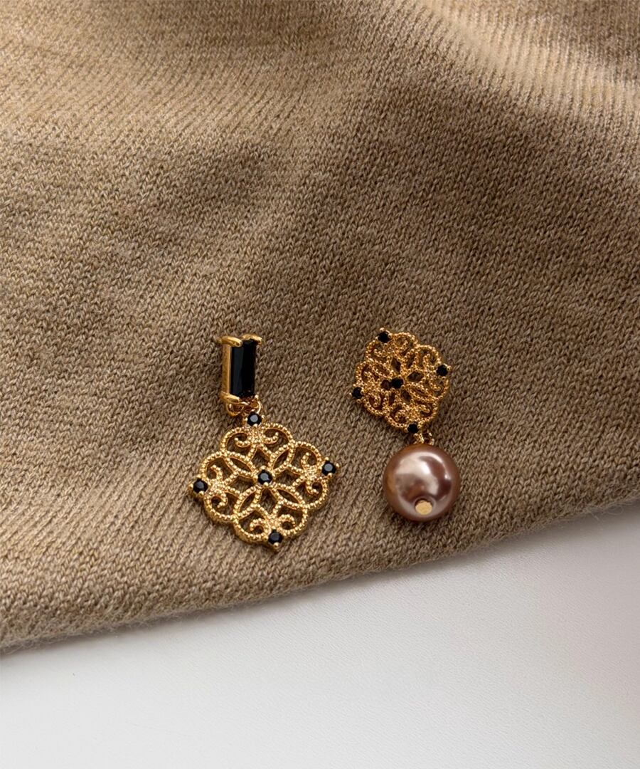 レース花柄イヤリング◆ブラッククリスタル&ブラウンパールピアス【e-70992】