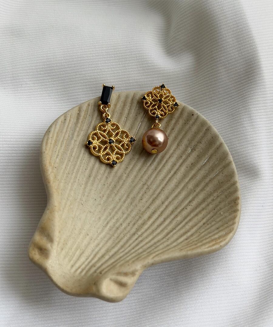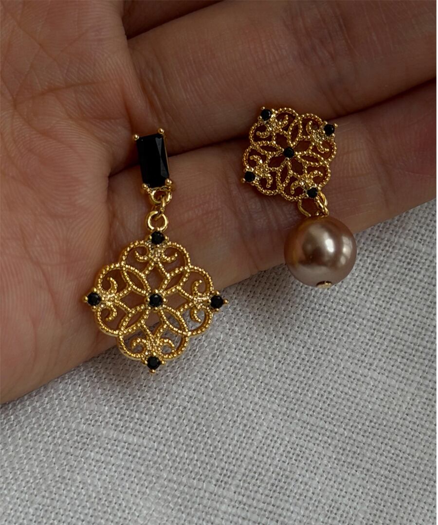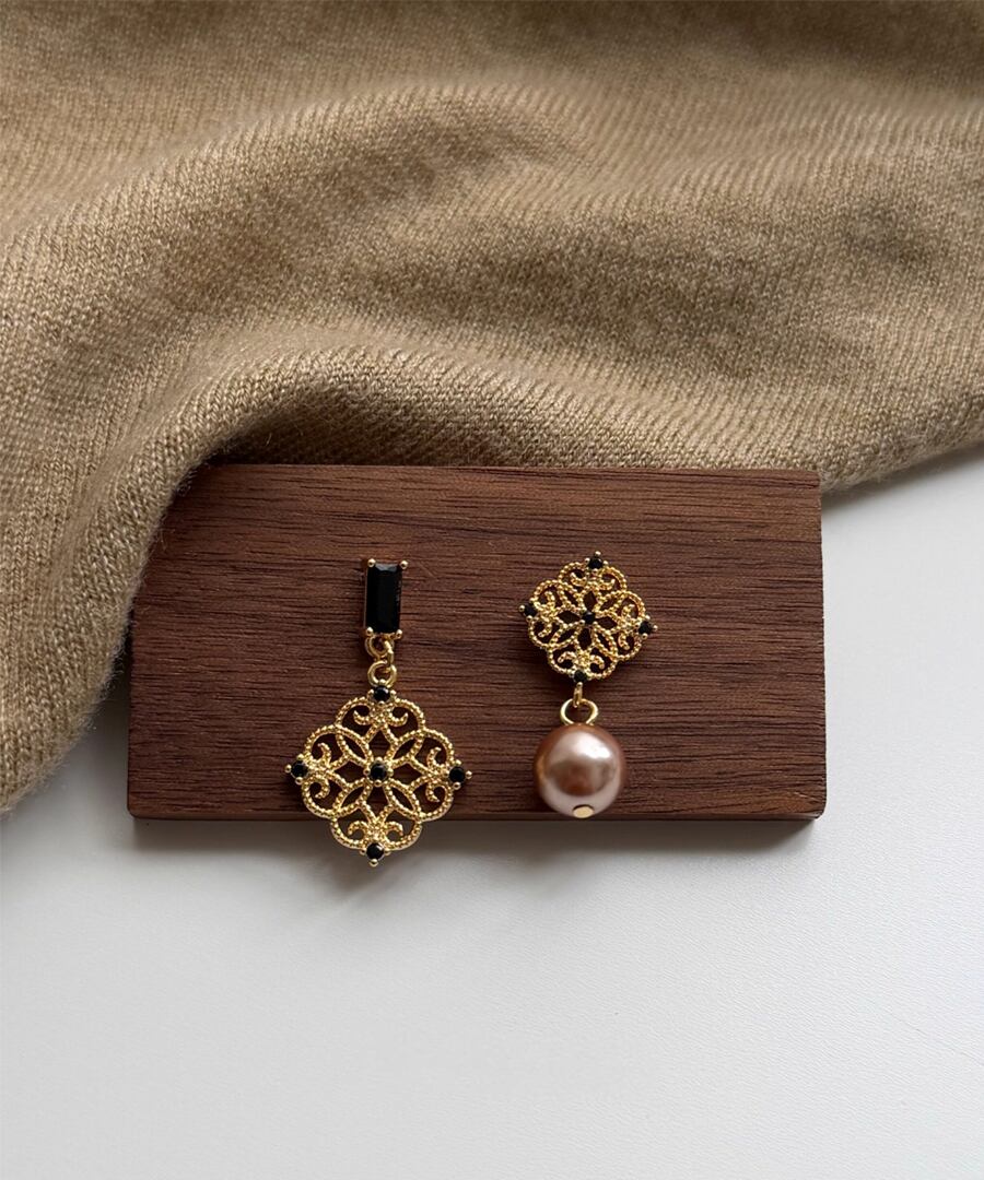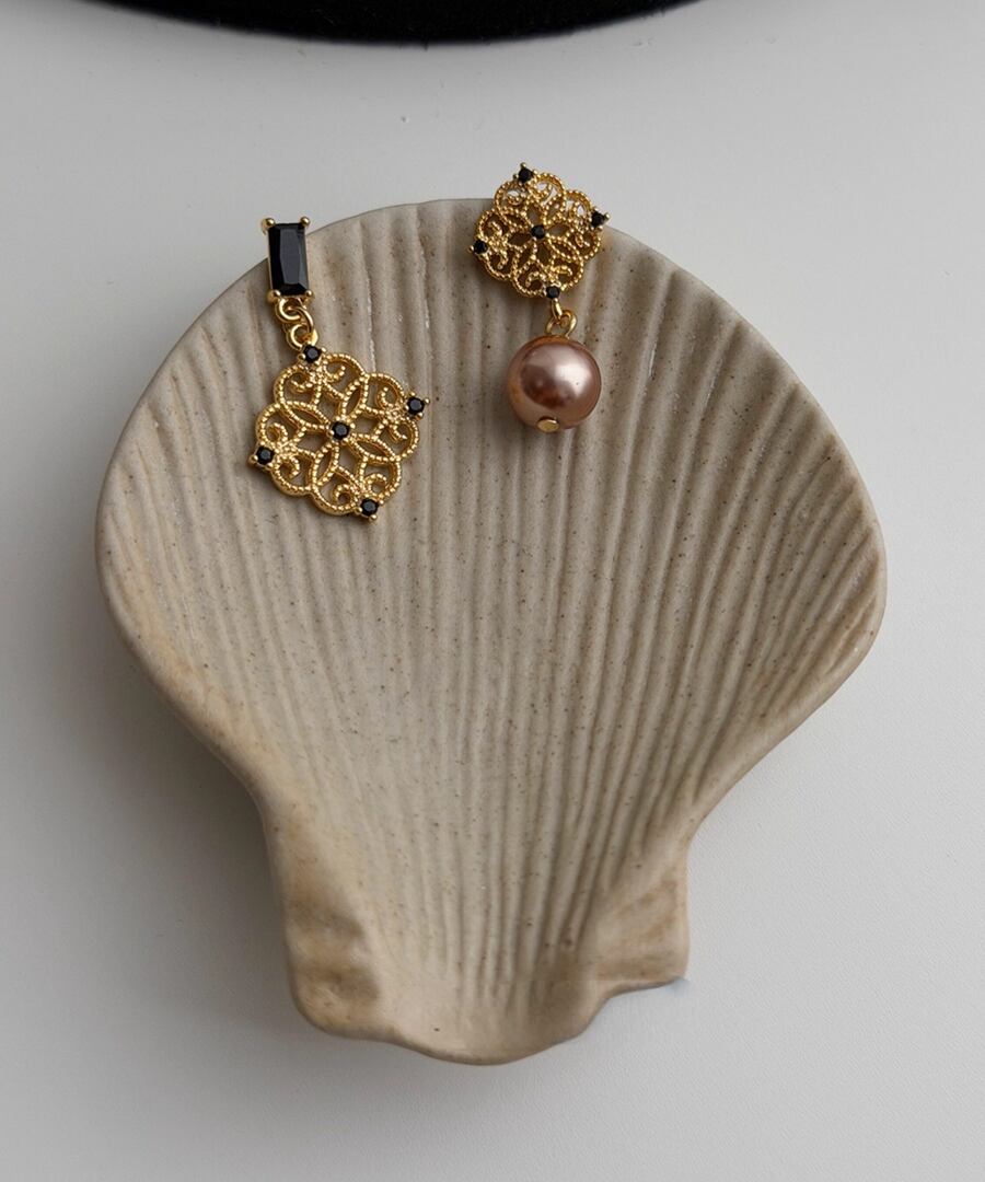 レース花柄イヤリング◆ブラッククリスタル&ブラウンパールピアス【e-70992】