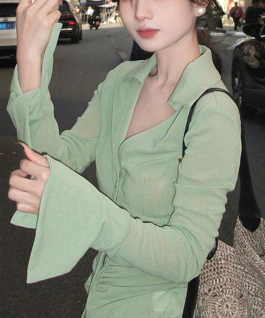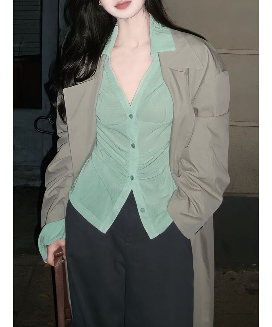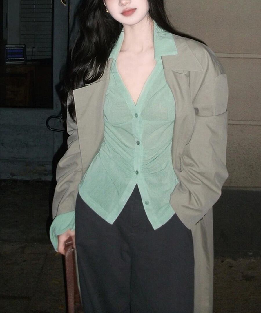 個性的でスタイリッシュなグリーンのシャツブラウス。