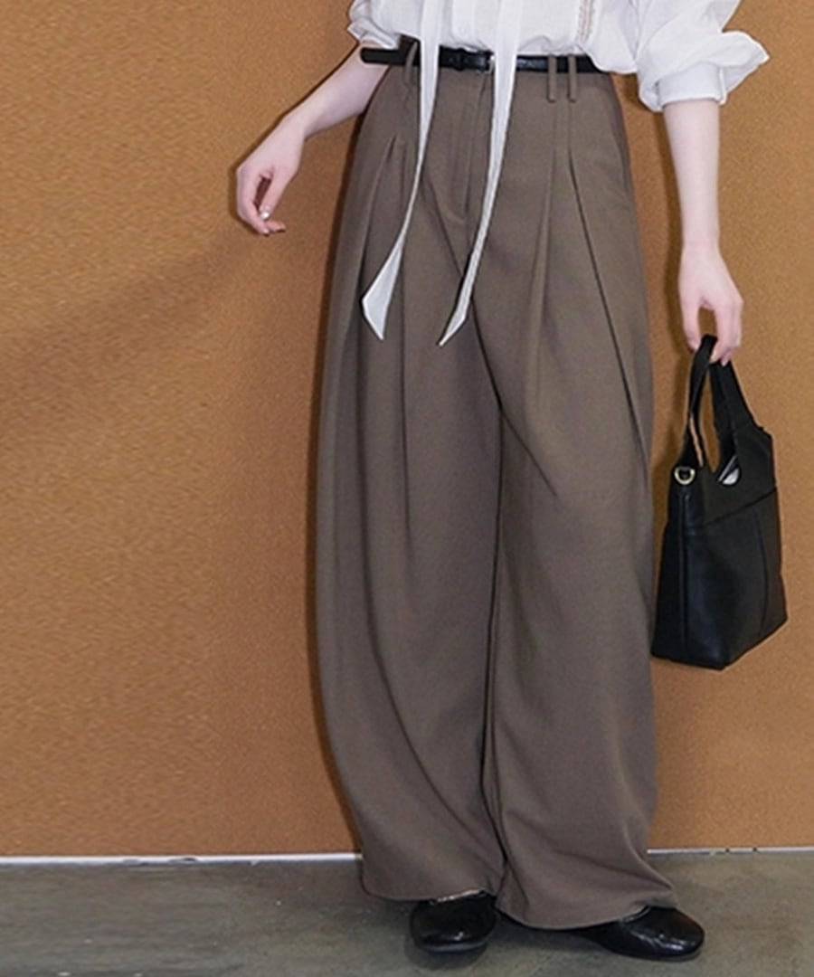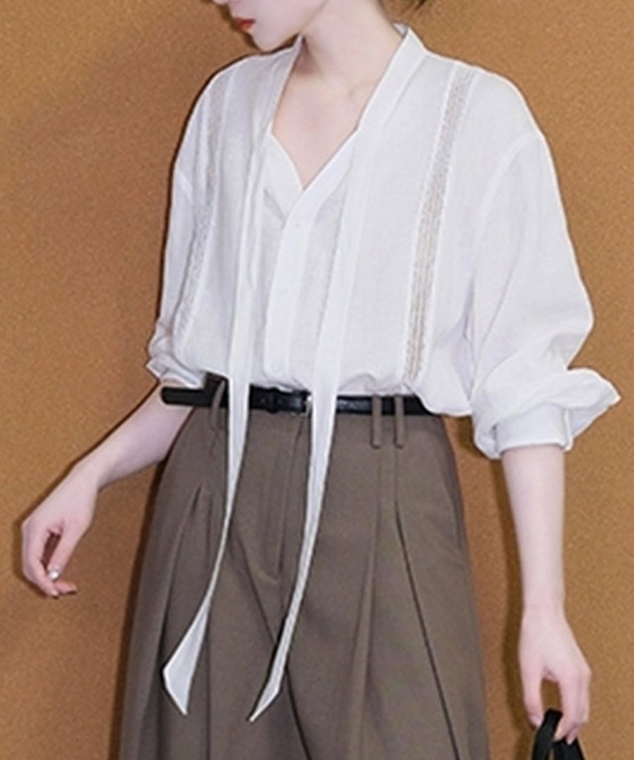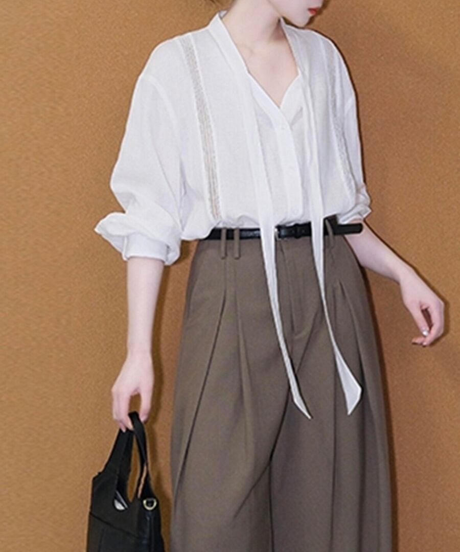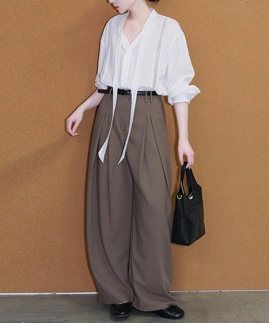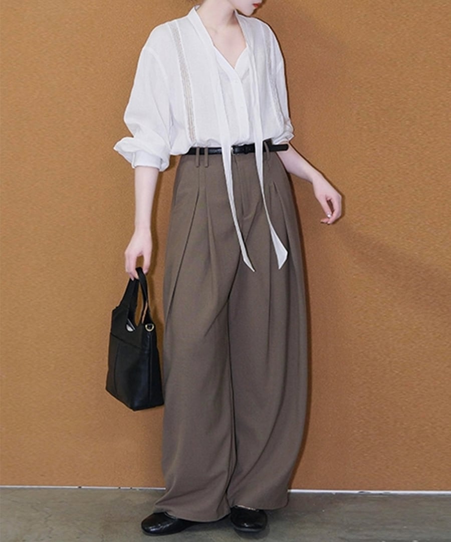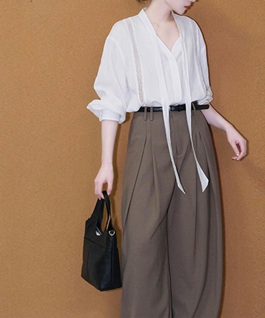白いVネックタイブラウスとワイドレッグパンツが絶妙に組み合わさり、デイリーユースにピッタリ。