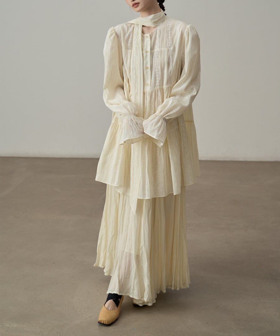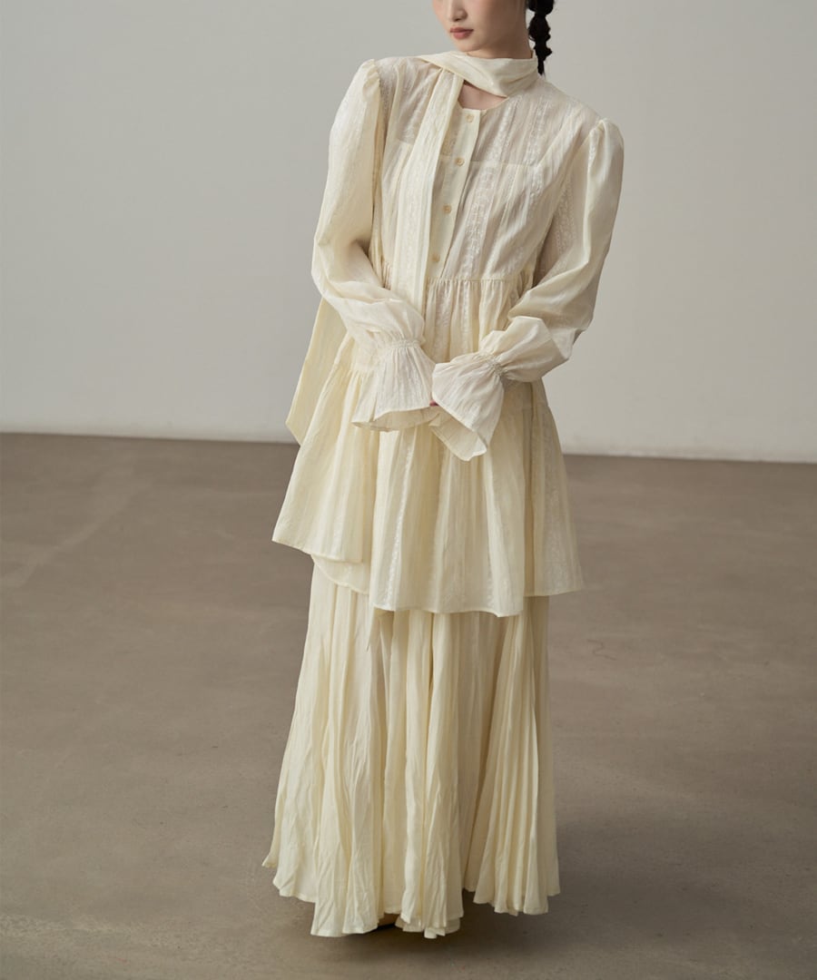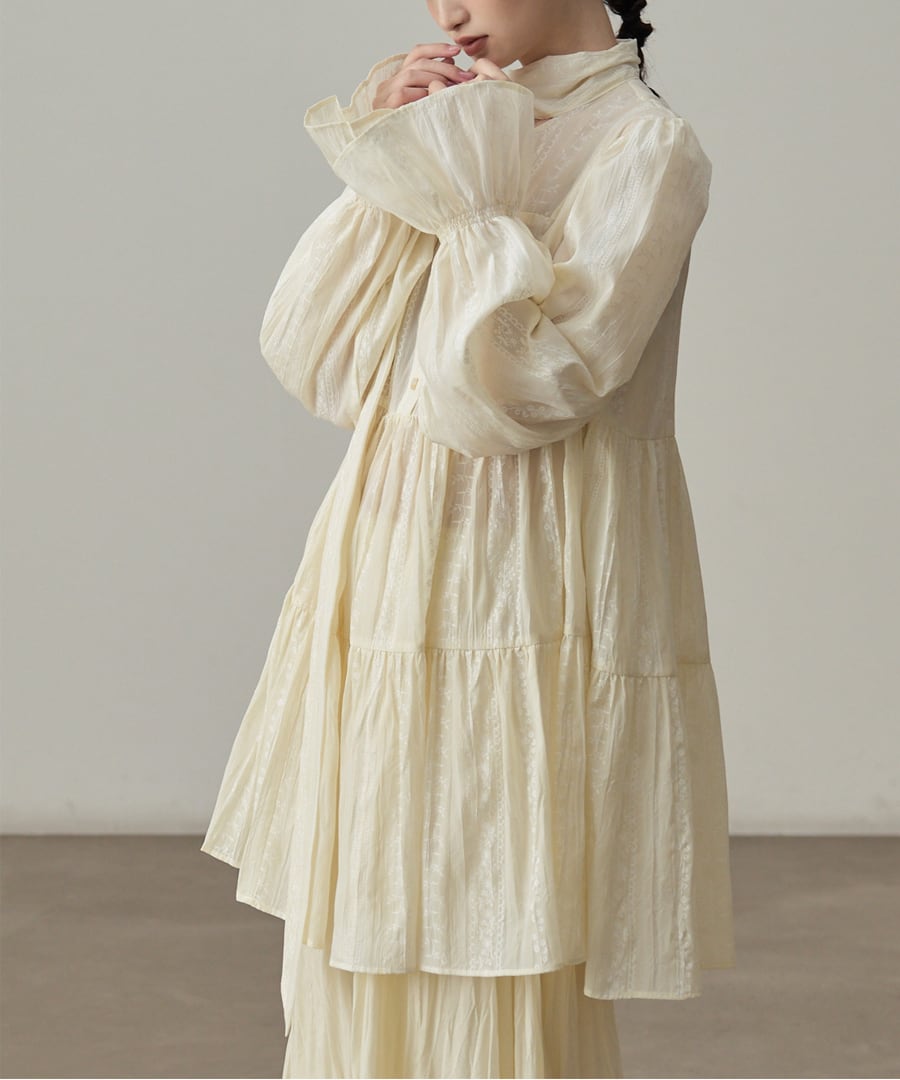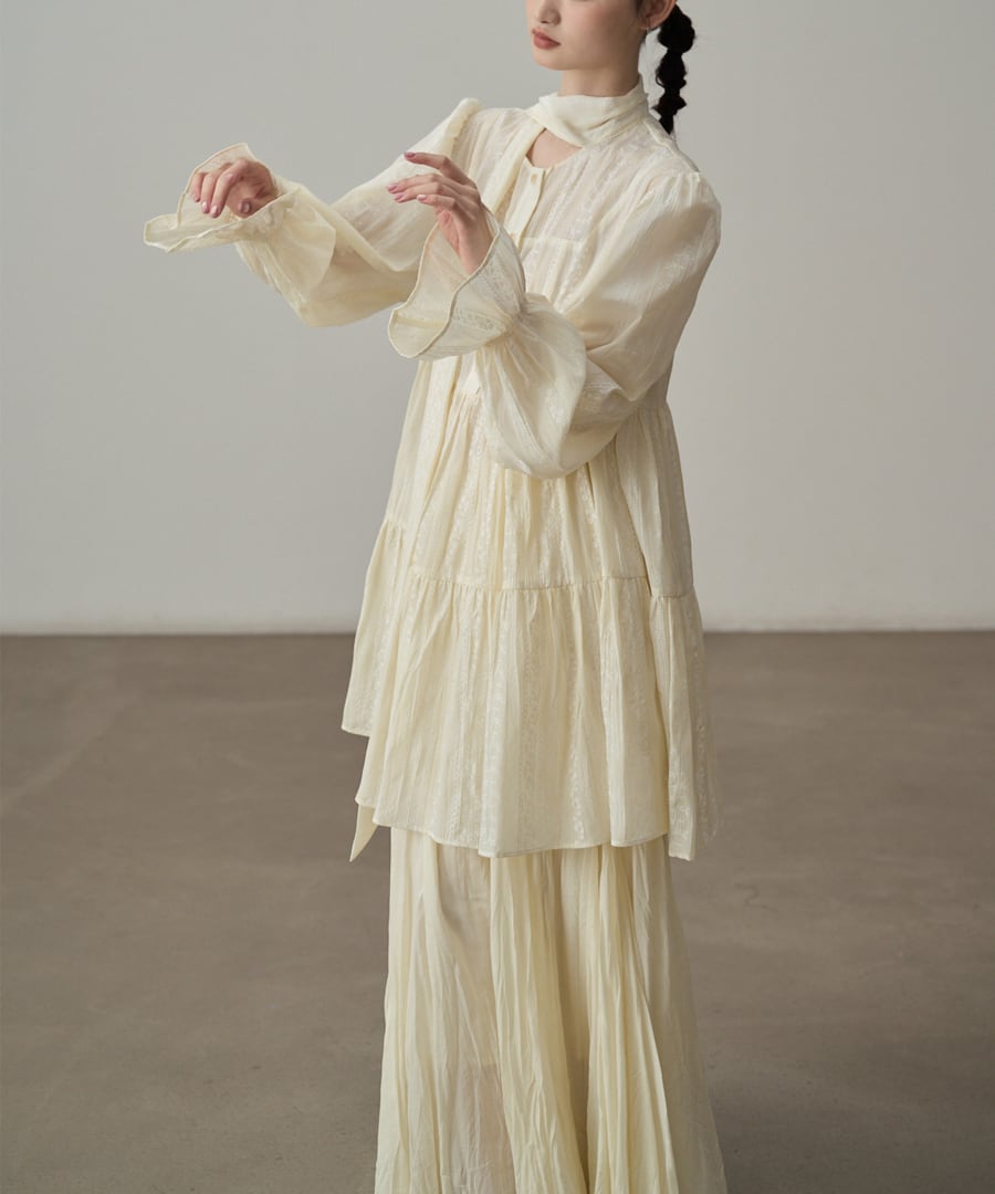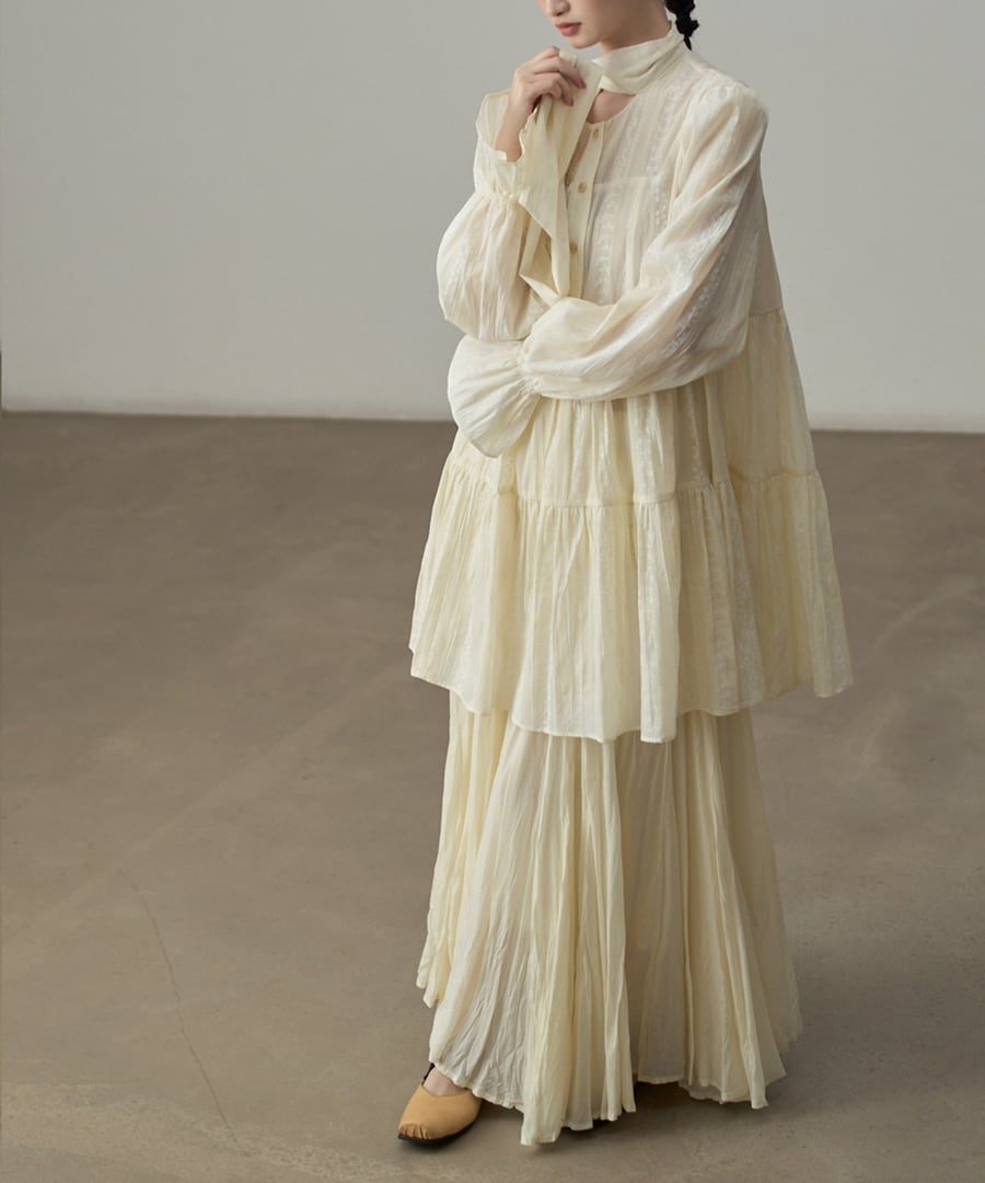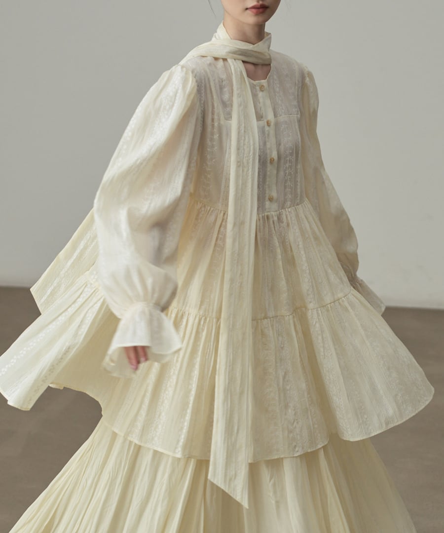 春のバケーション気分を盛り上げる、ゆったりとしたベビードール風長袖トップスです。