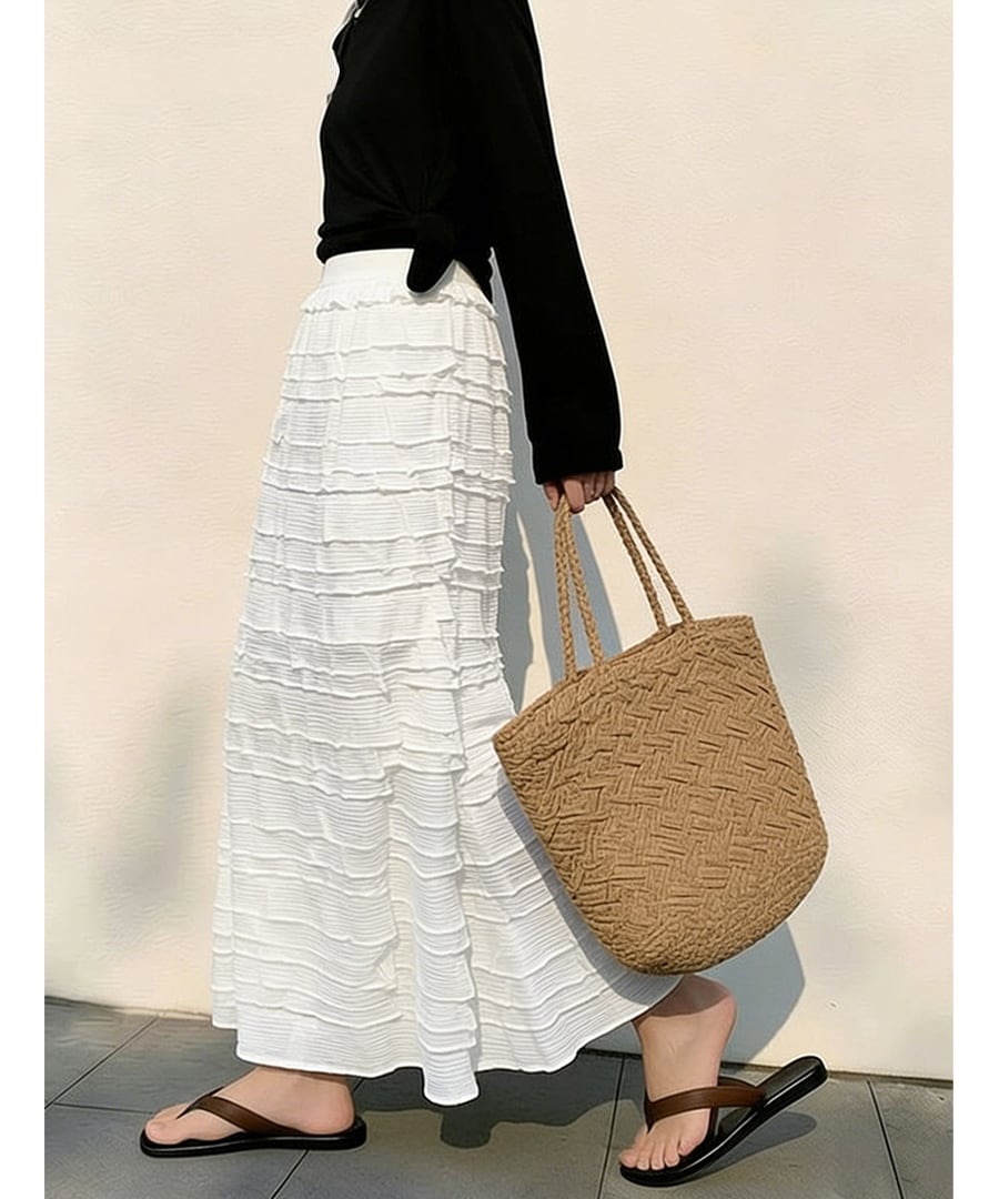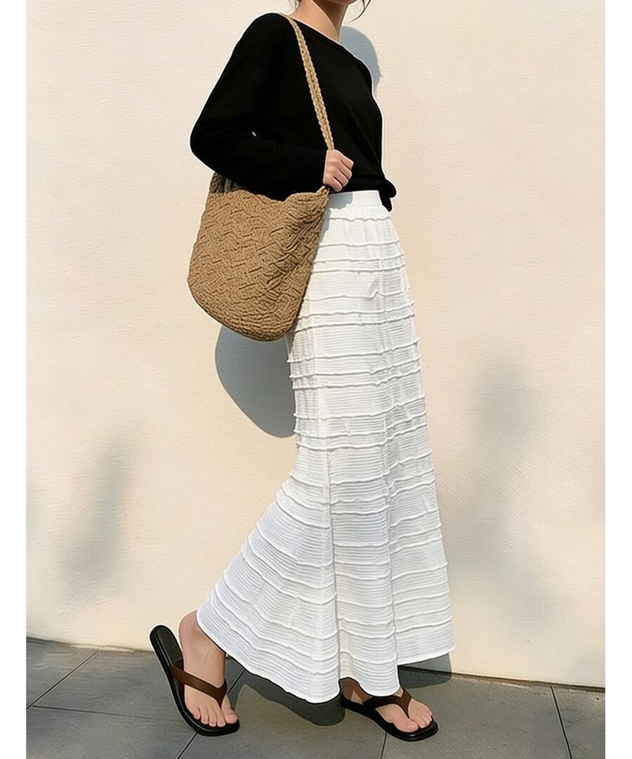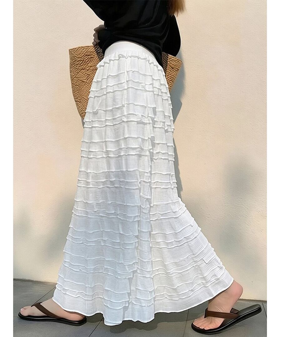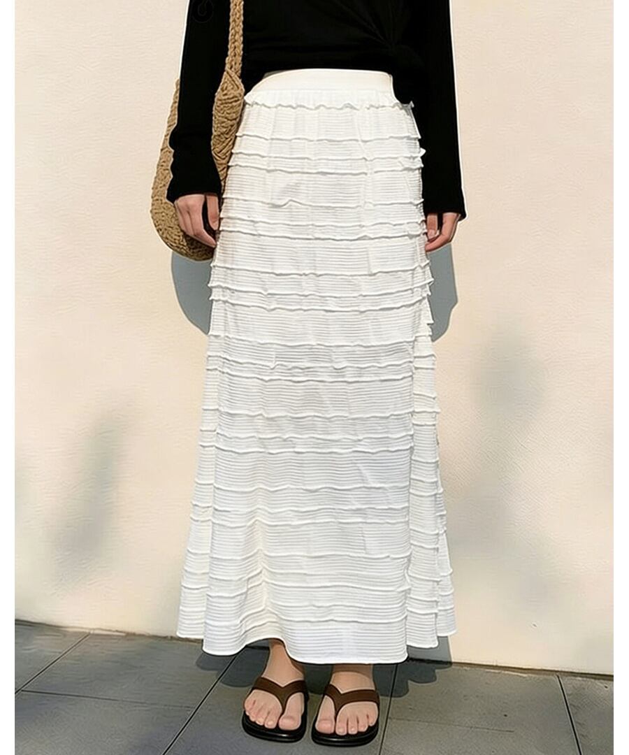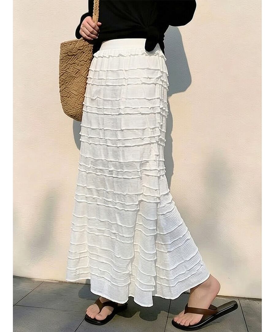 フレンチシックな白いティアードプリーツデザインが特徴で、女性らしいシルエットを演出します。