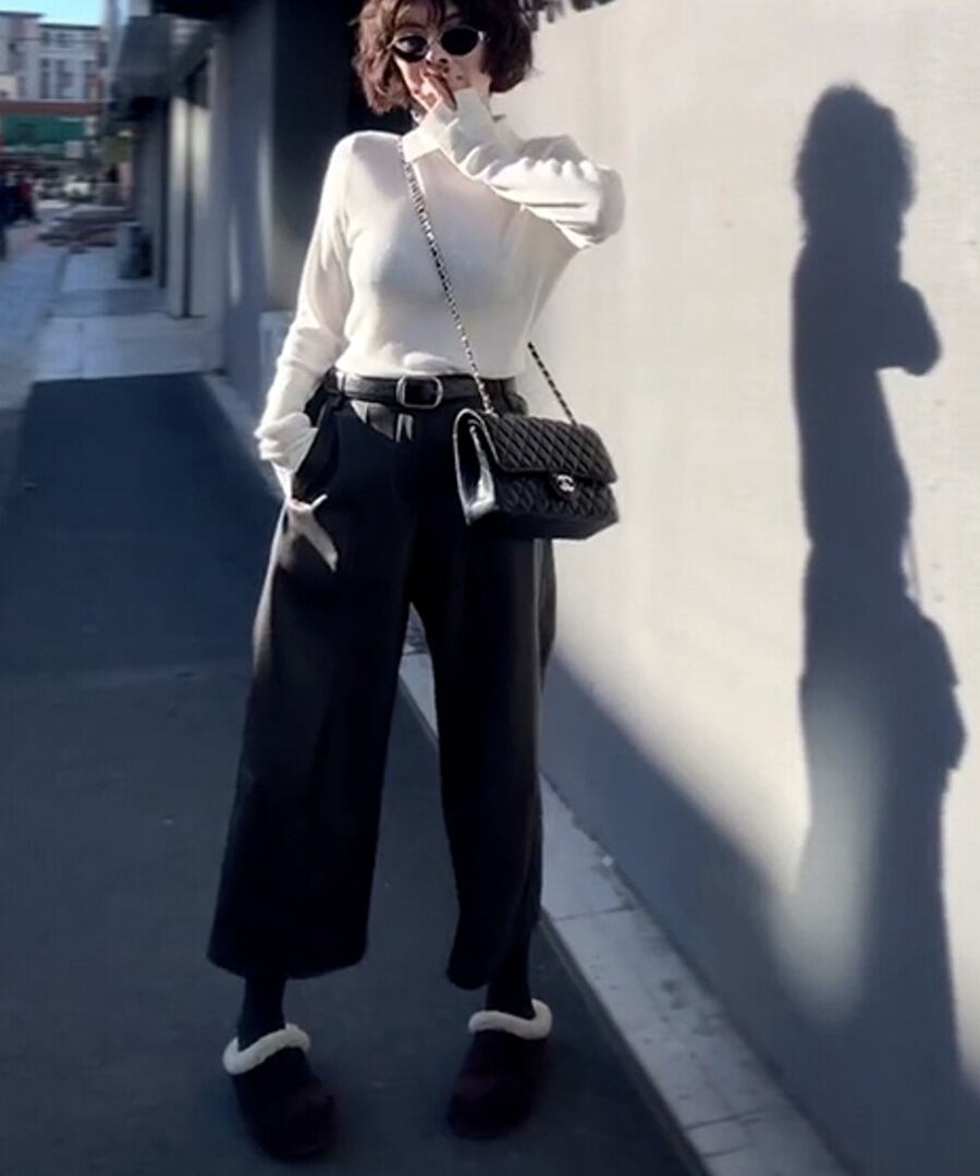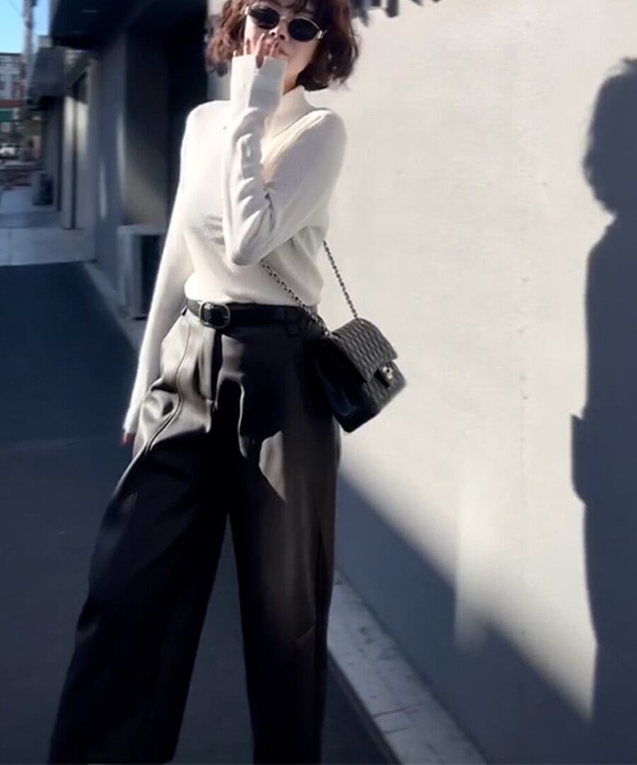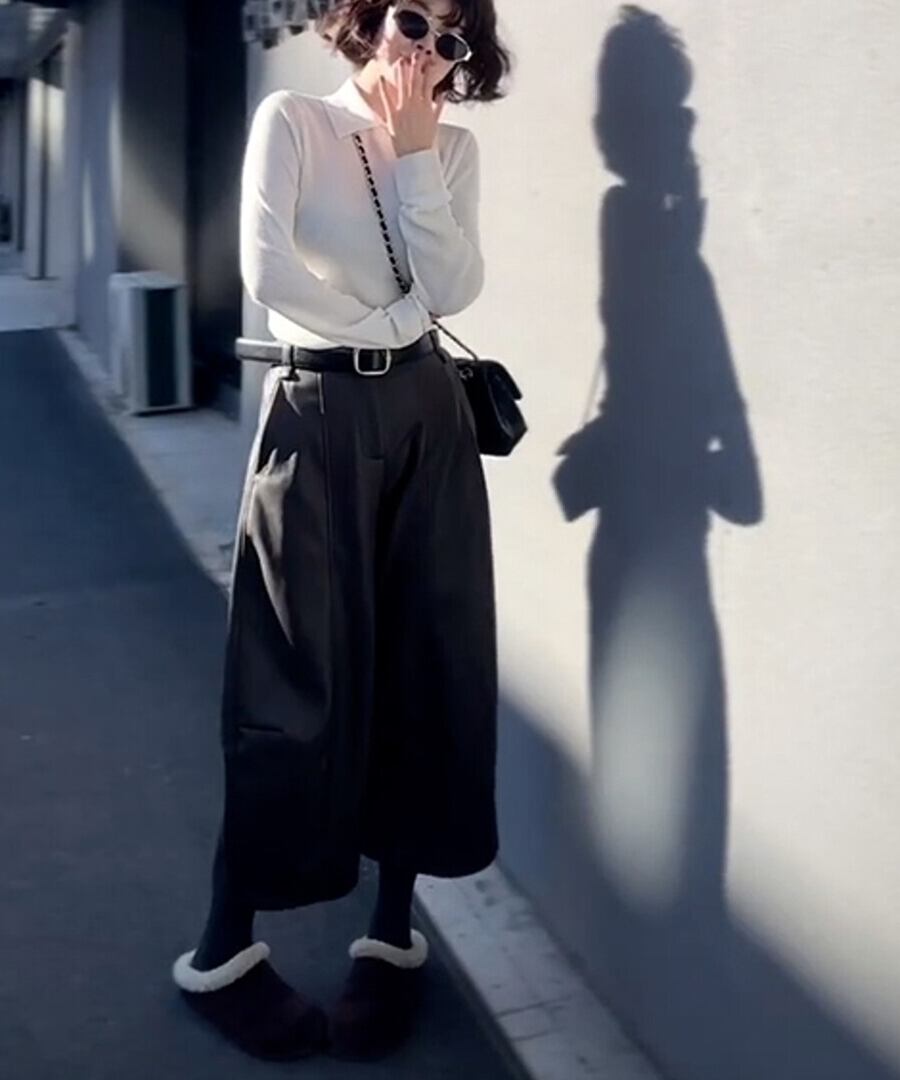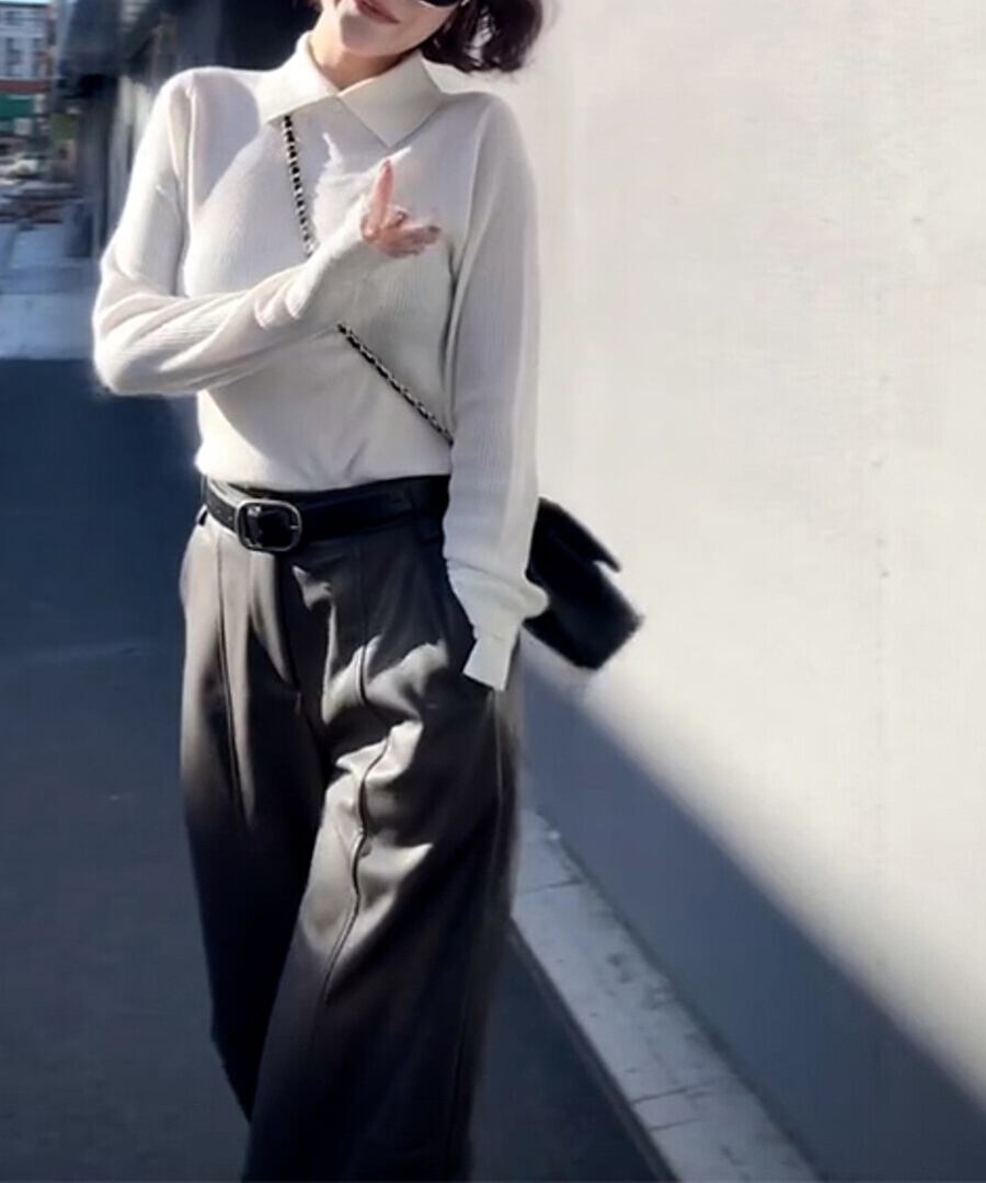 白い襟付きニットトップス。