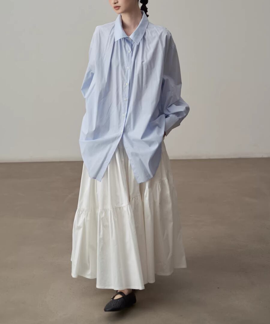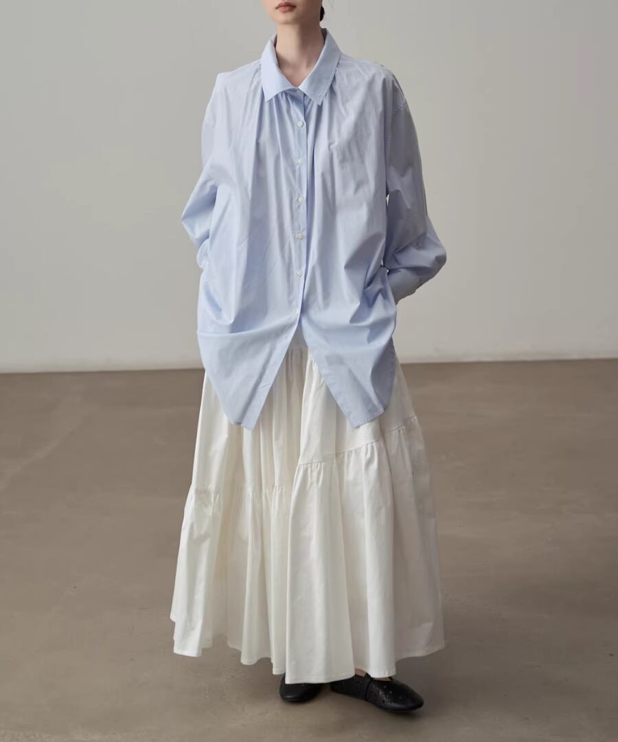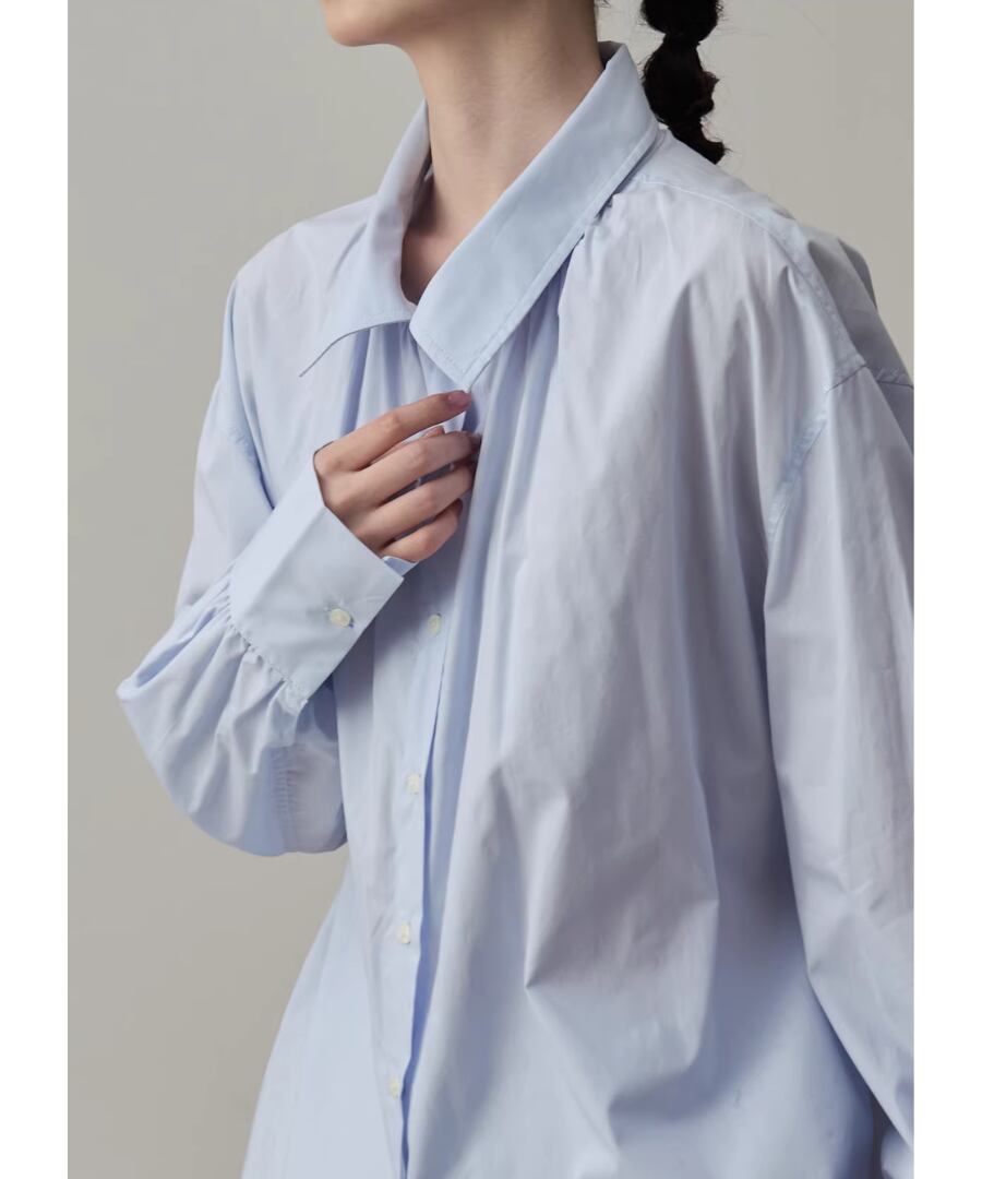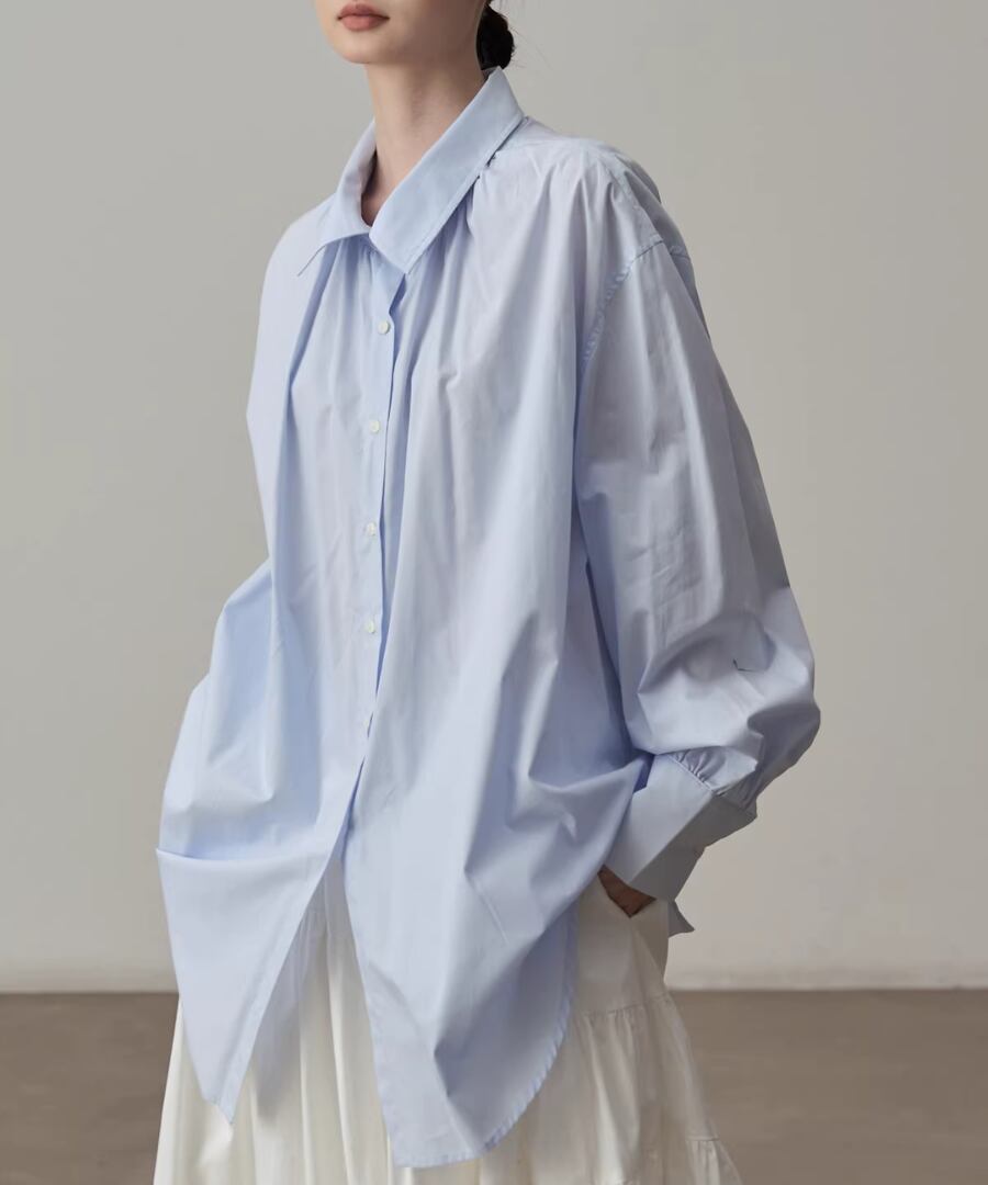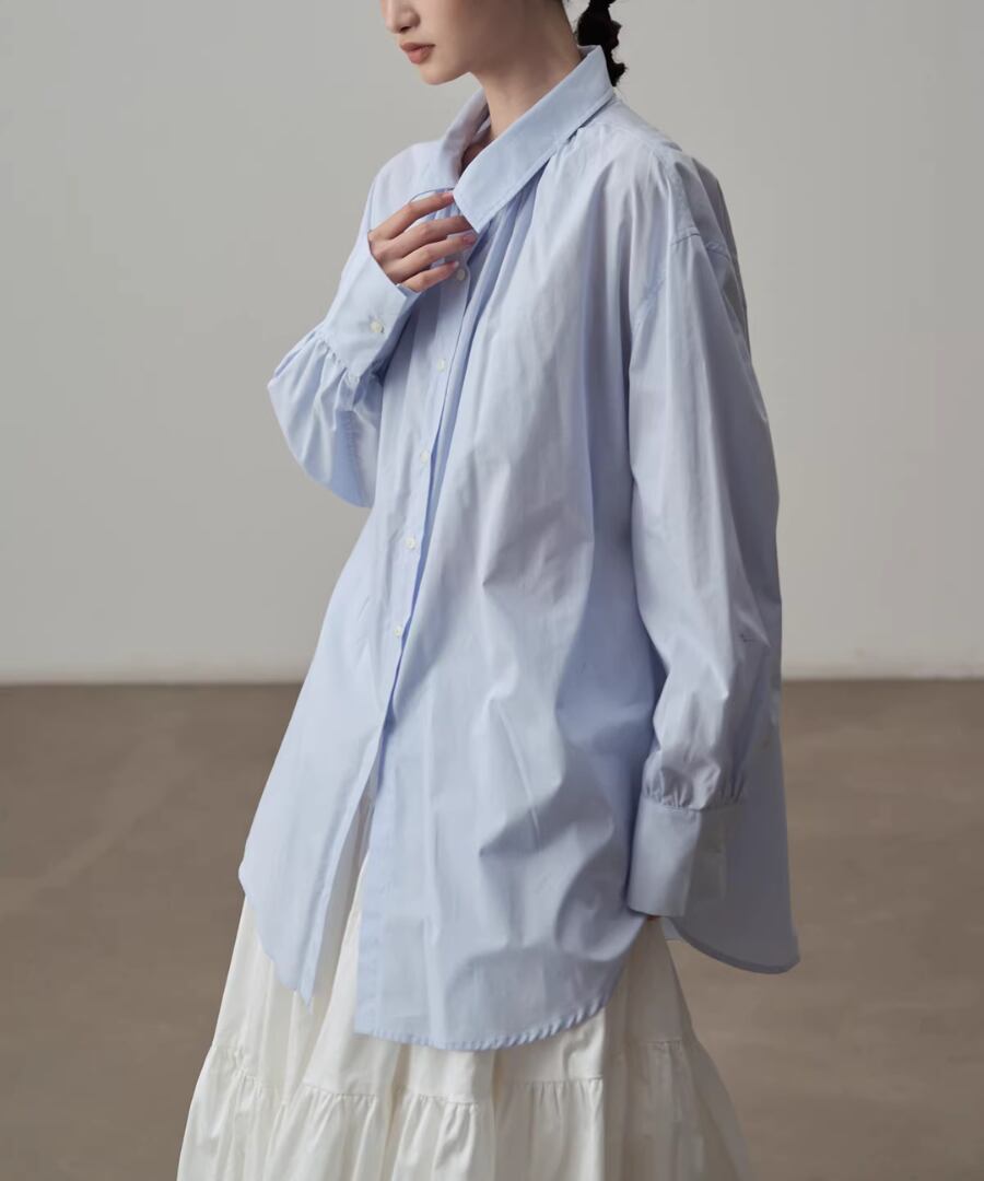 シンプルなシルエットのブルーシャツ。