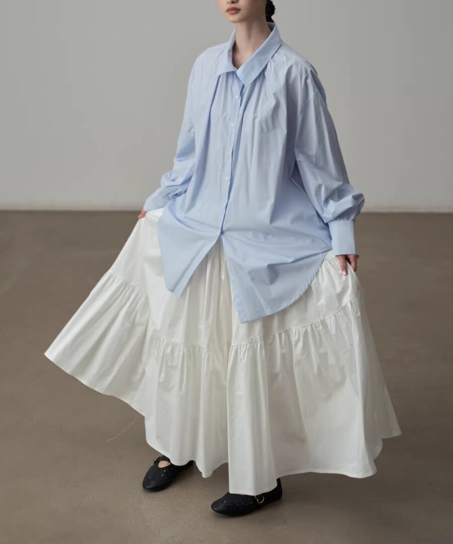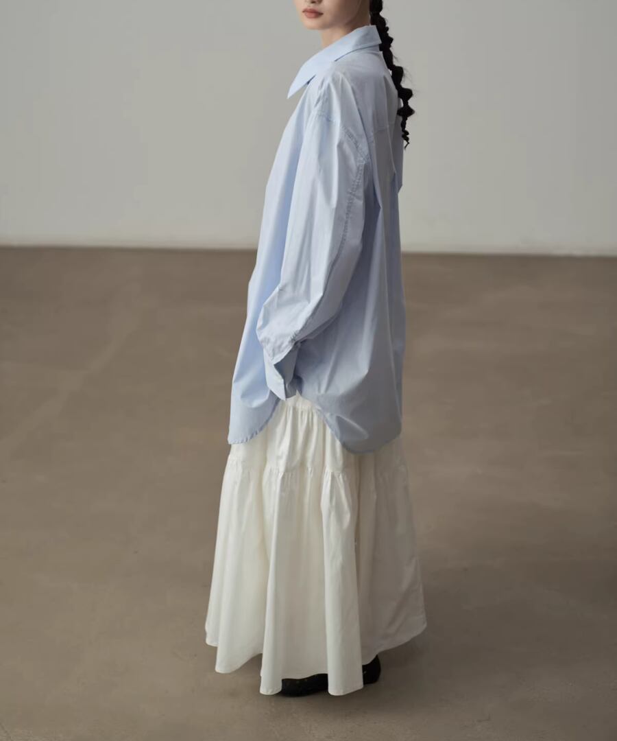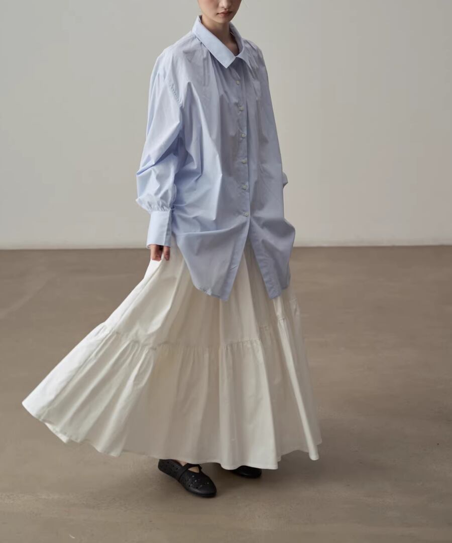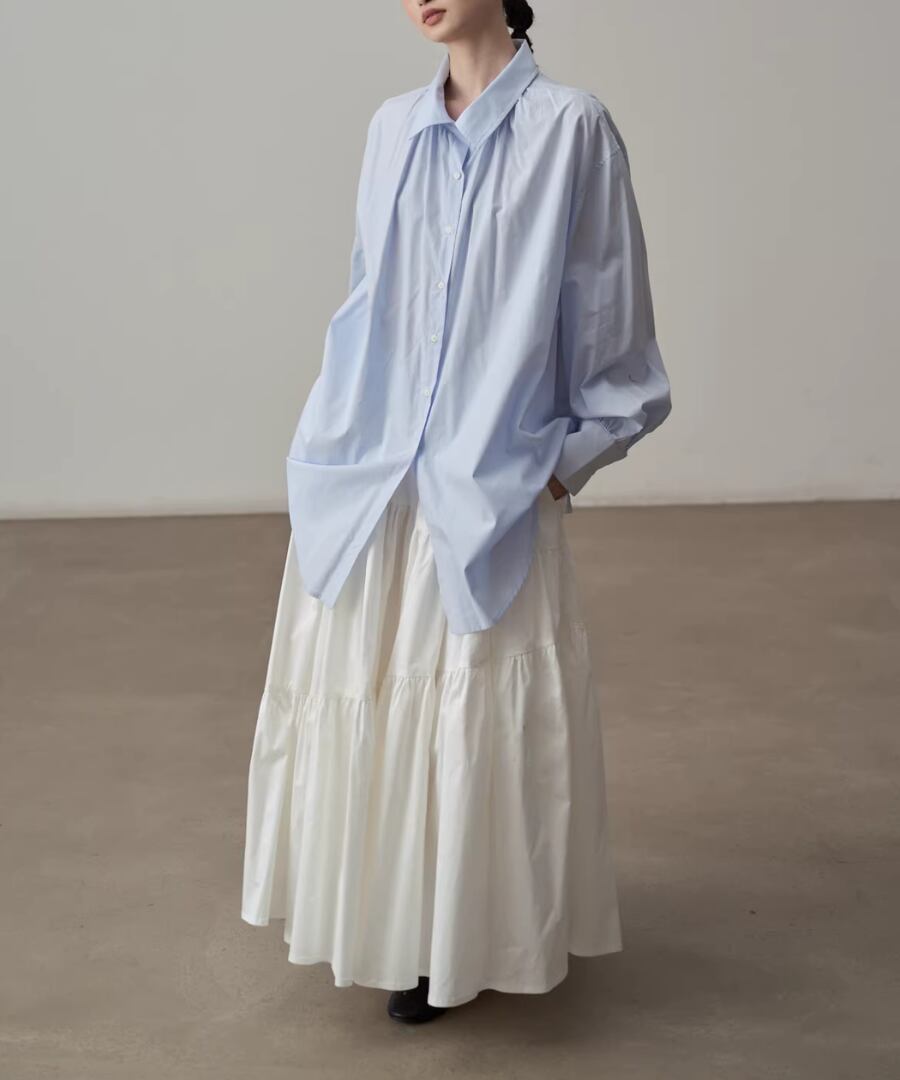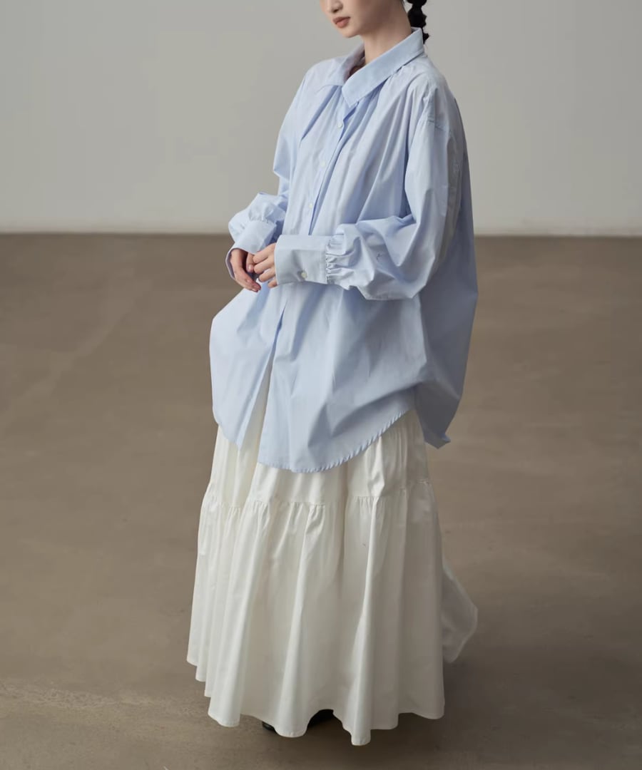 シンプルなシルエットのブルーシャツ。