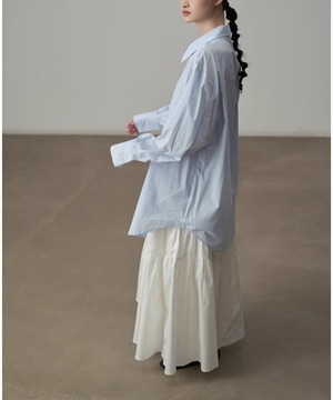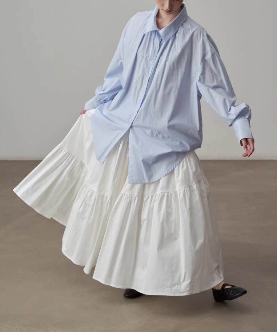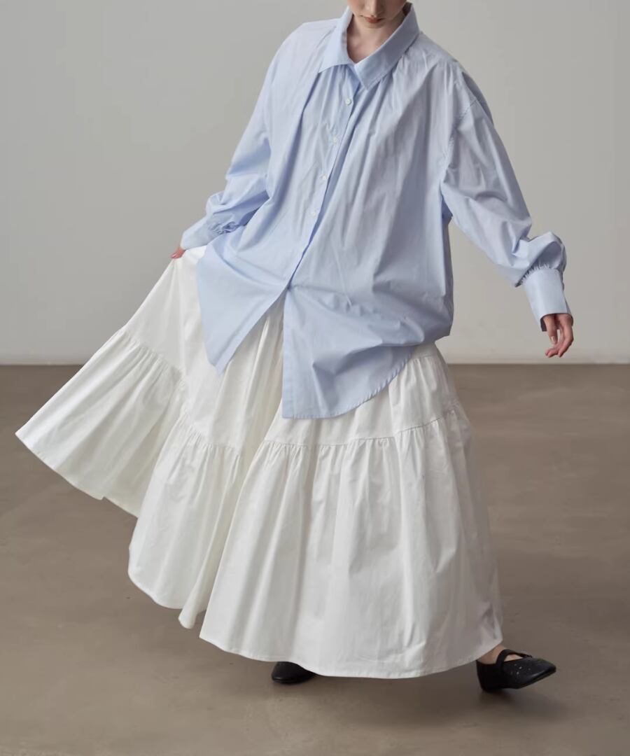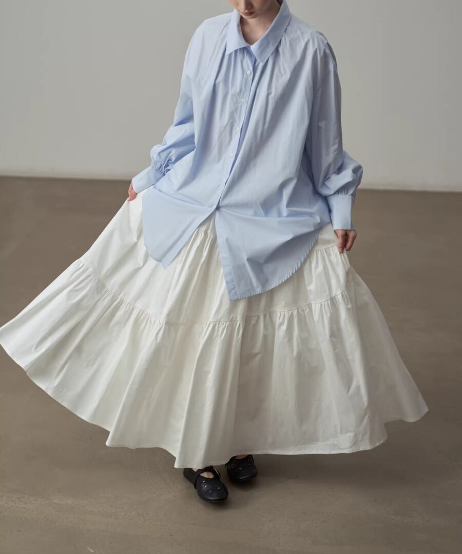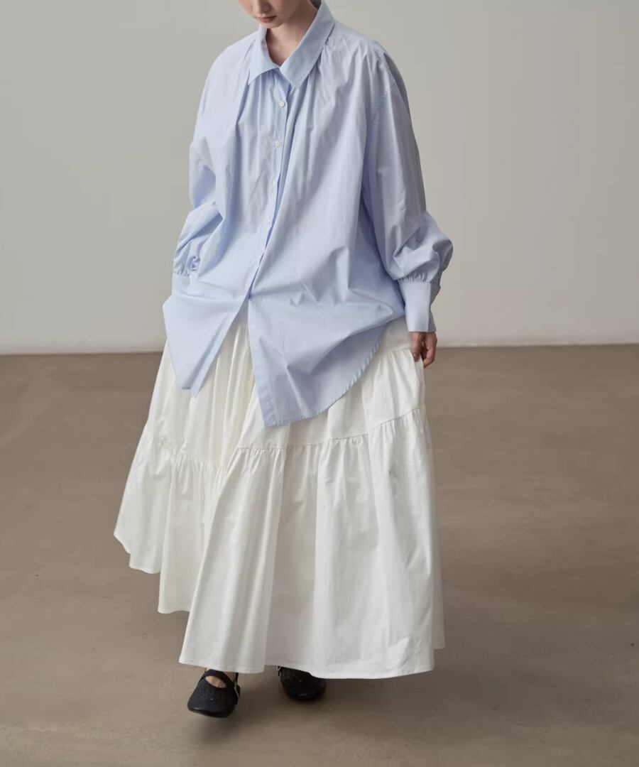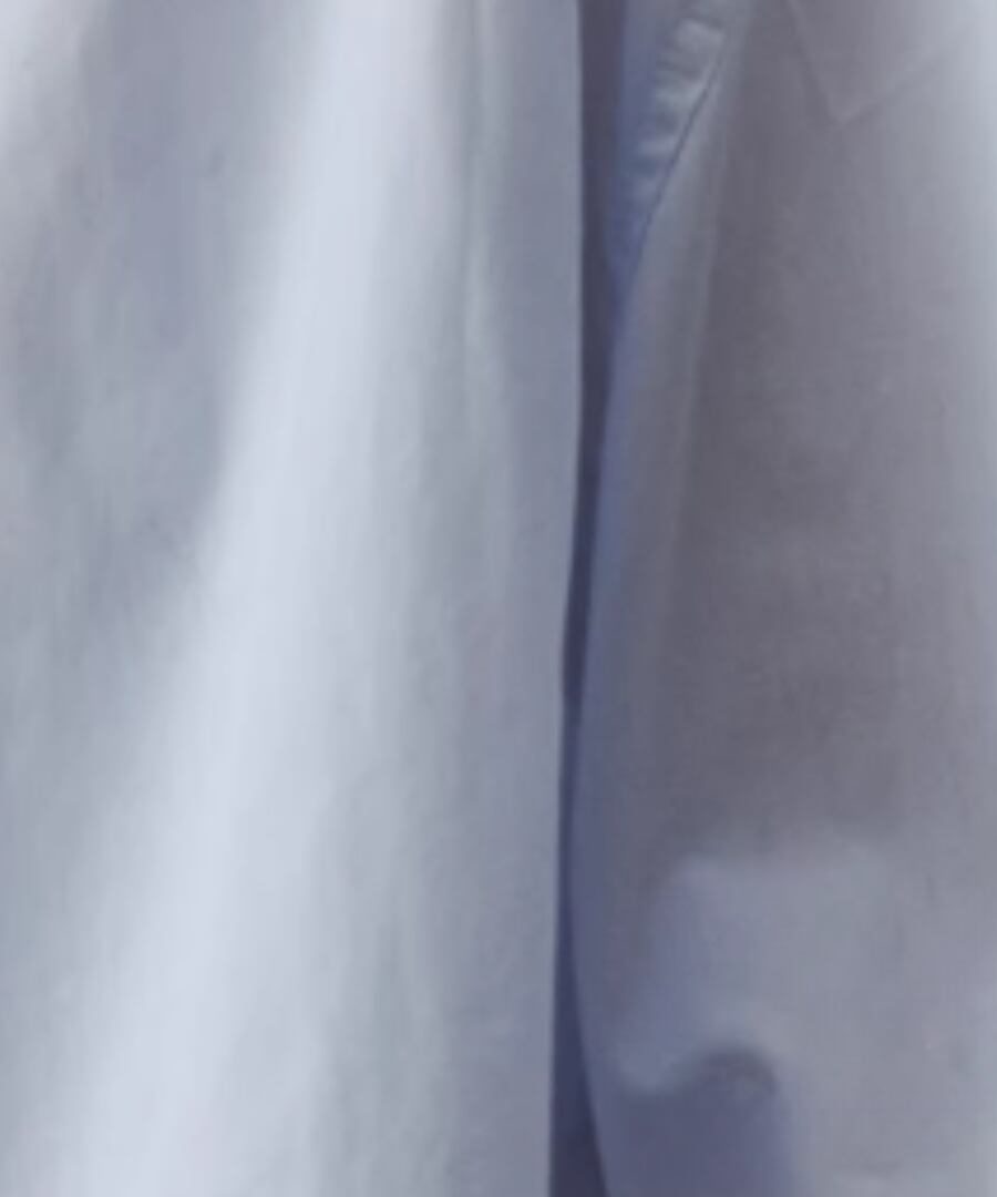 シンプルなシルエットのブルーシャツ。