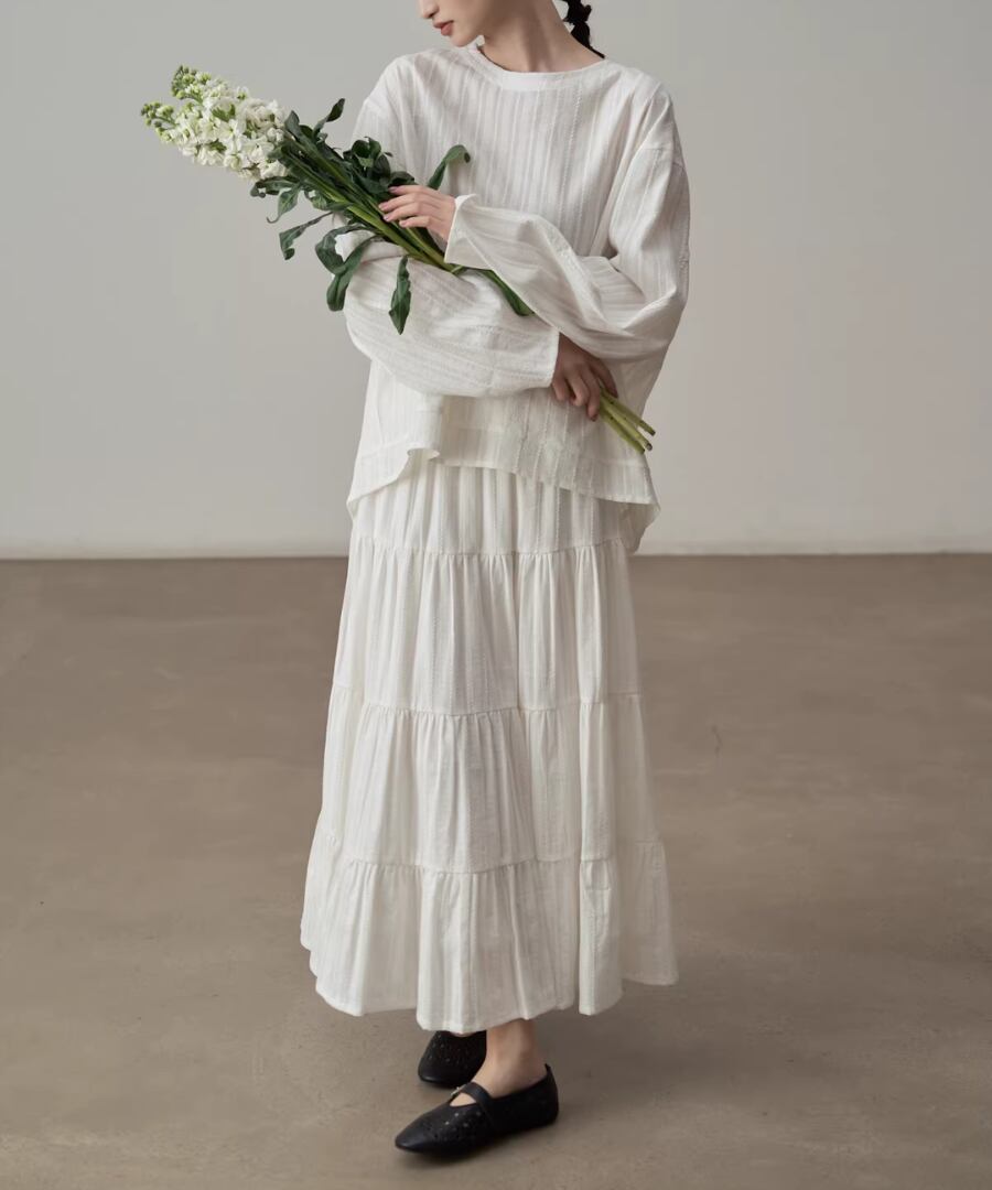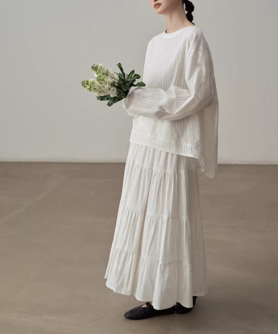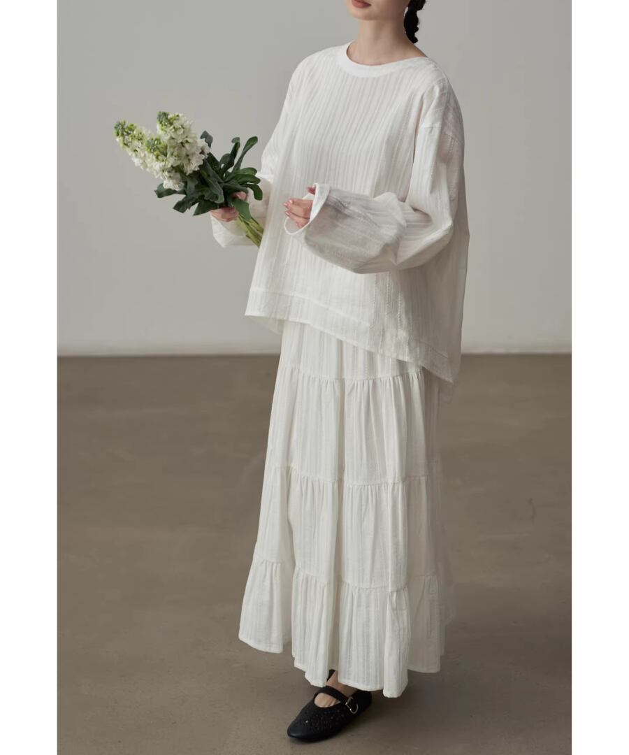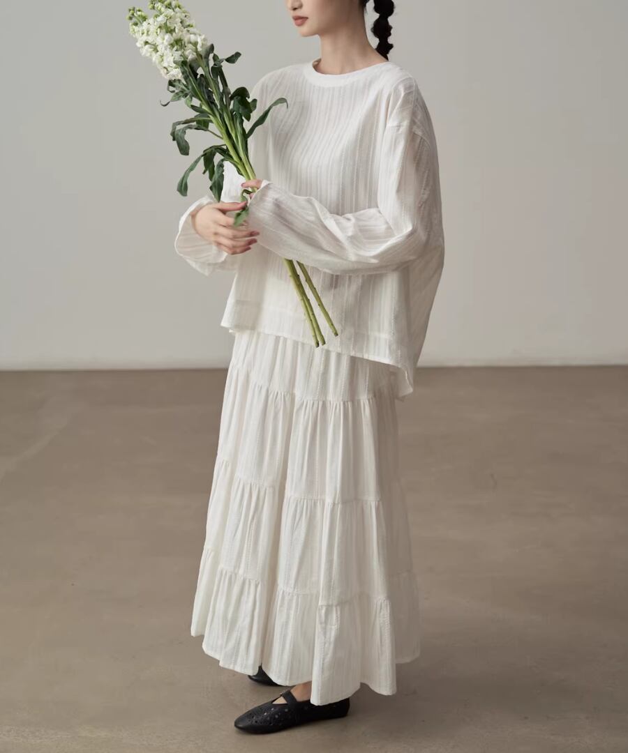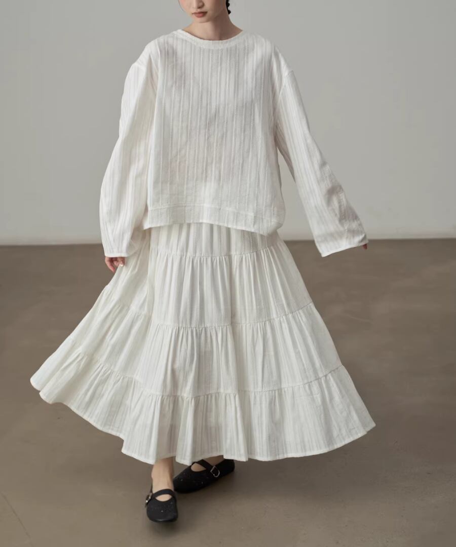 重ね着風のスカートと合わせることで、バケーションにもぴったりなスタイルをつくり出します。