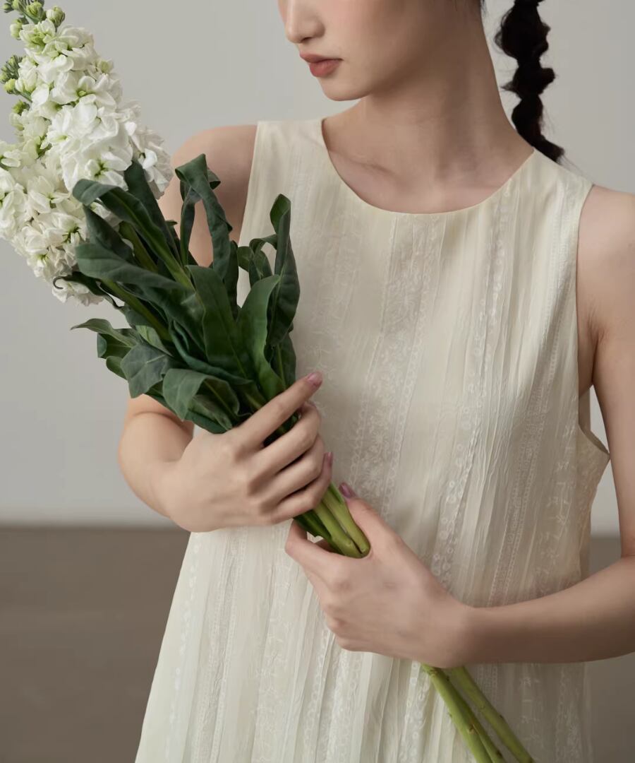 長めの丈と柔らかなAラインの裾が優雅な印象を与え、動くたびに揺れる花柄が心を躍らせます。