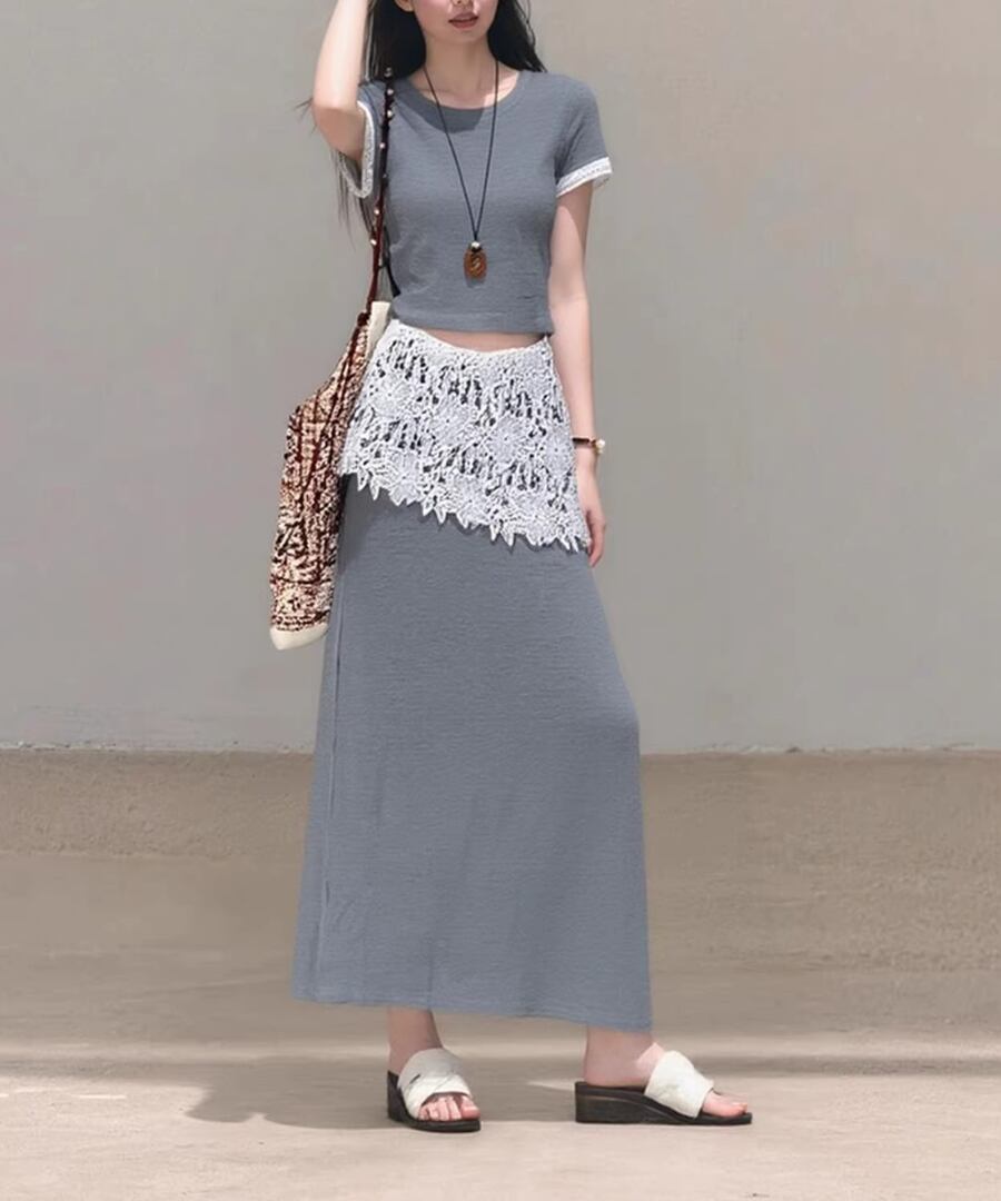 シンプルなグレーの半袖Tシャツと、エレガントなレーストリムスカートがセットになった着回ししやすいアイテム。