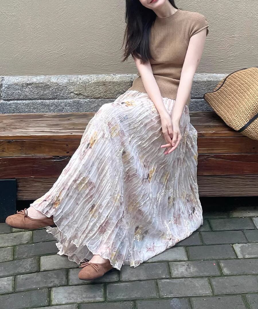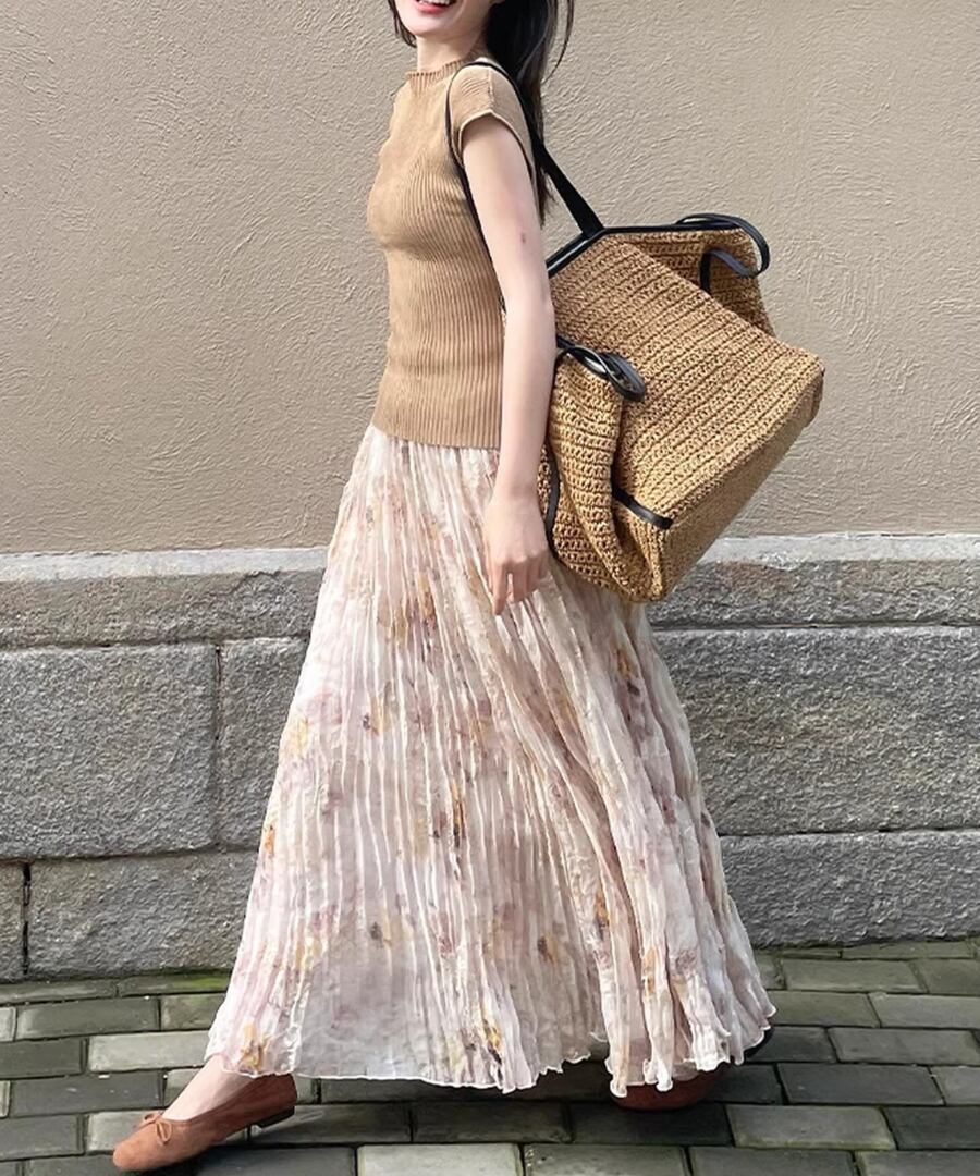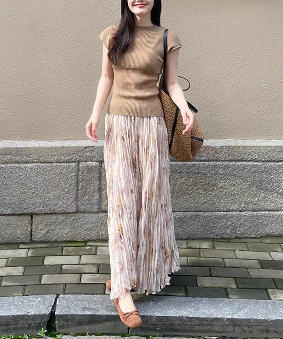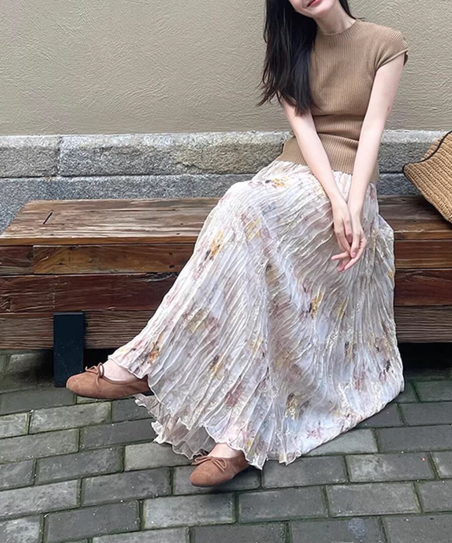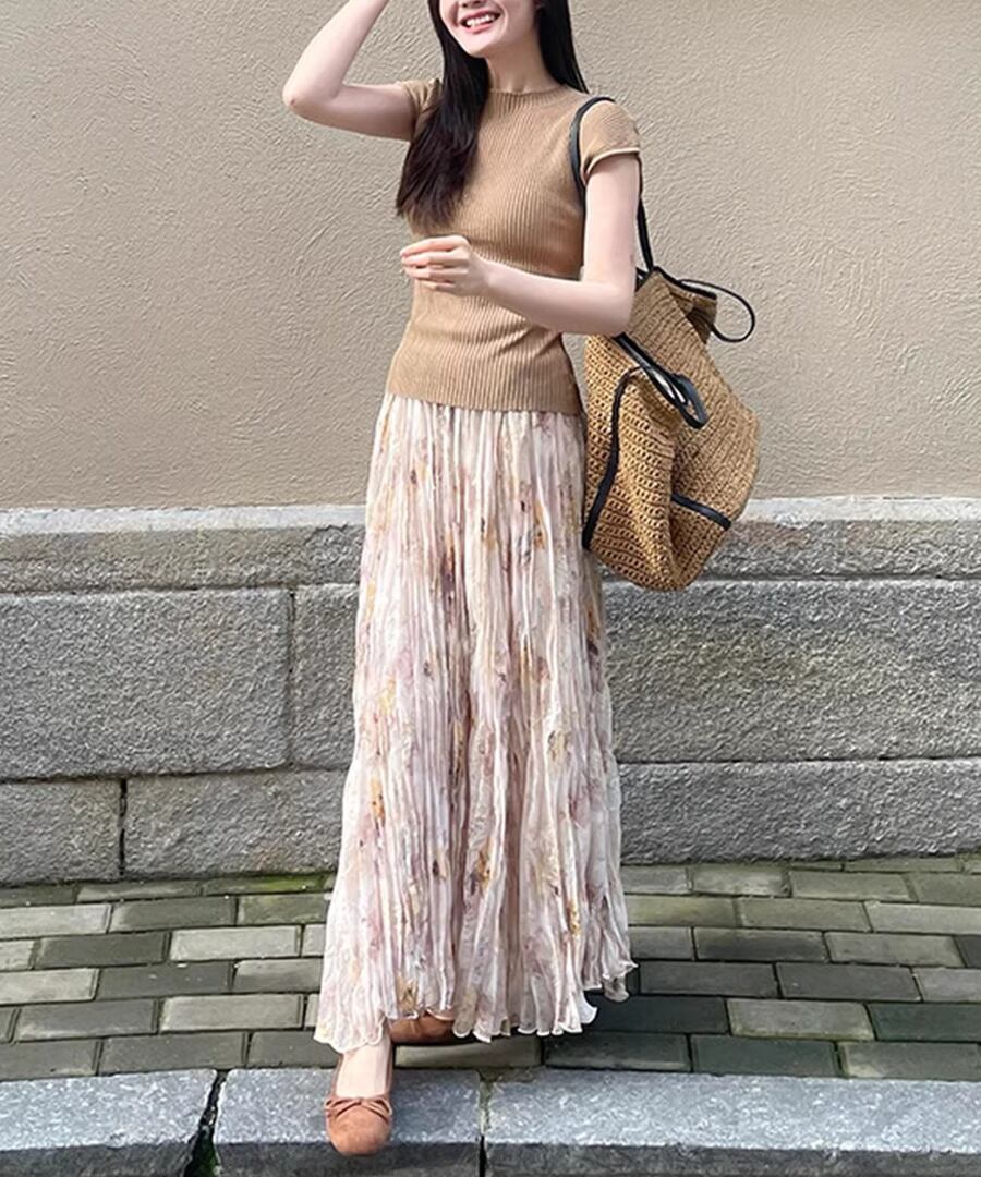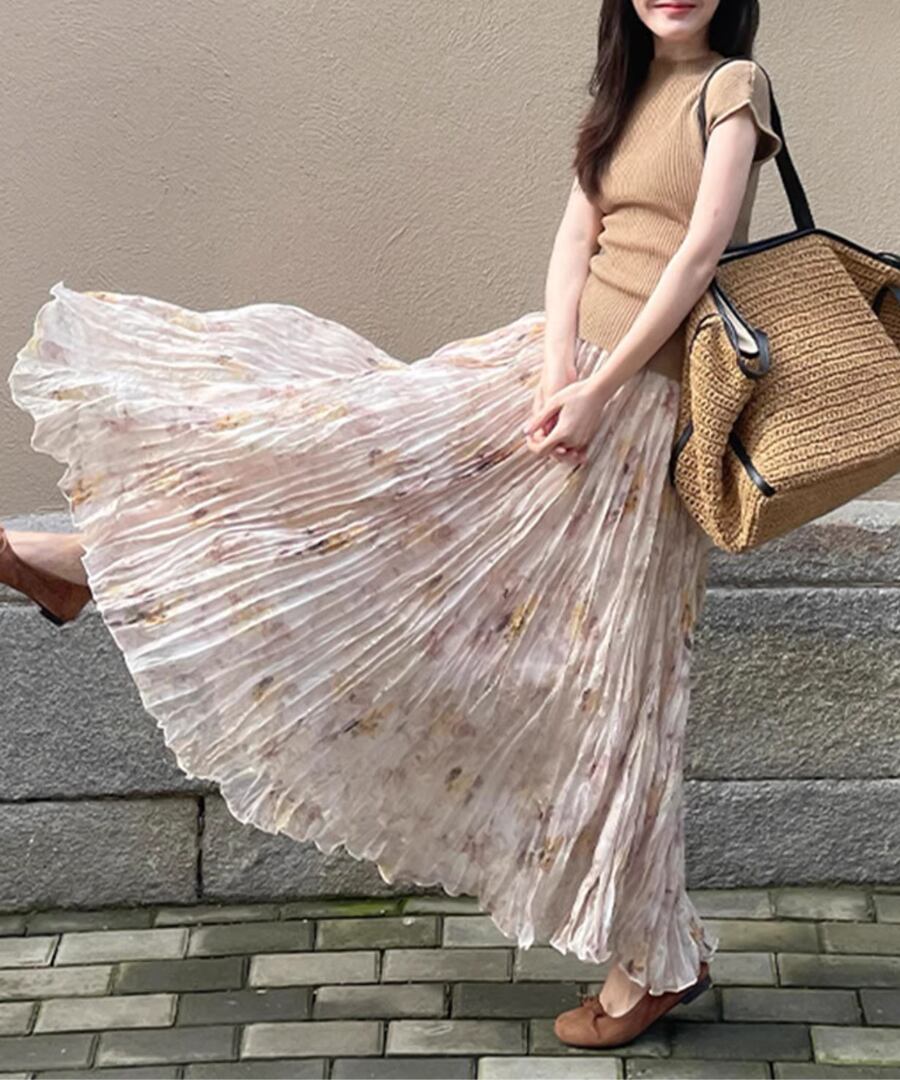 フラワープリントのスカートは、動くたびに揺れるデザイン。