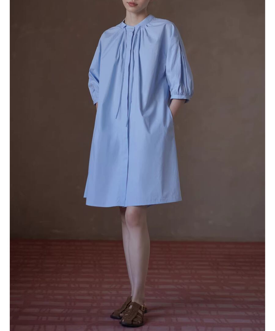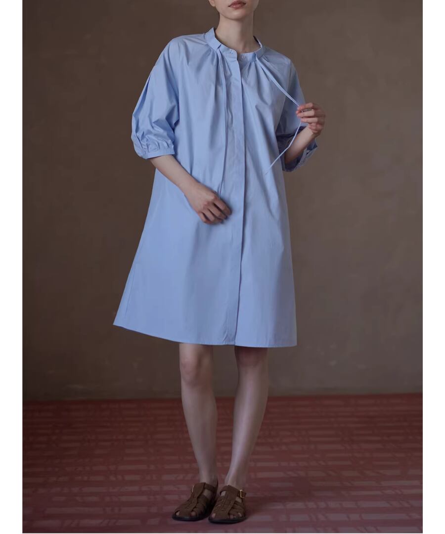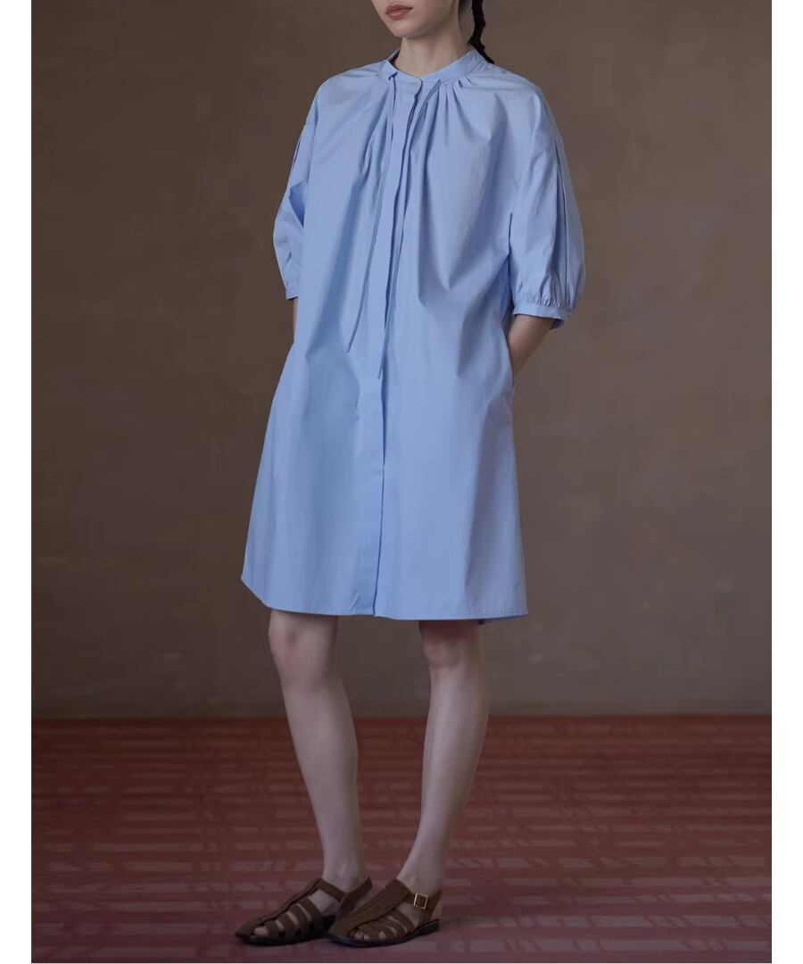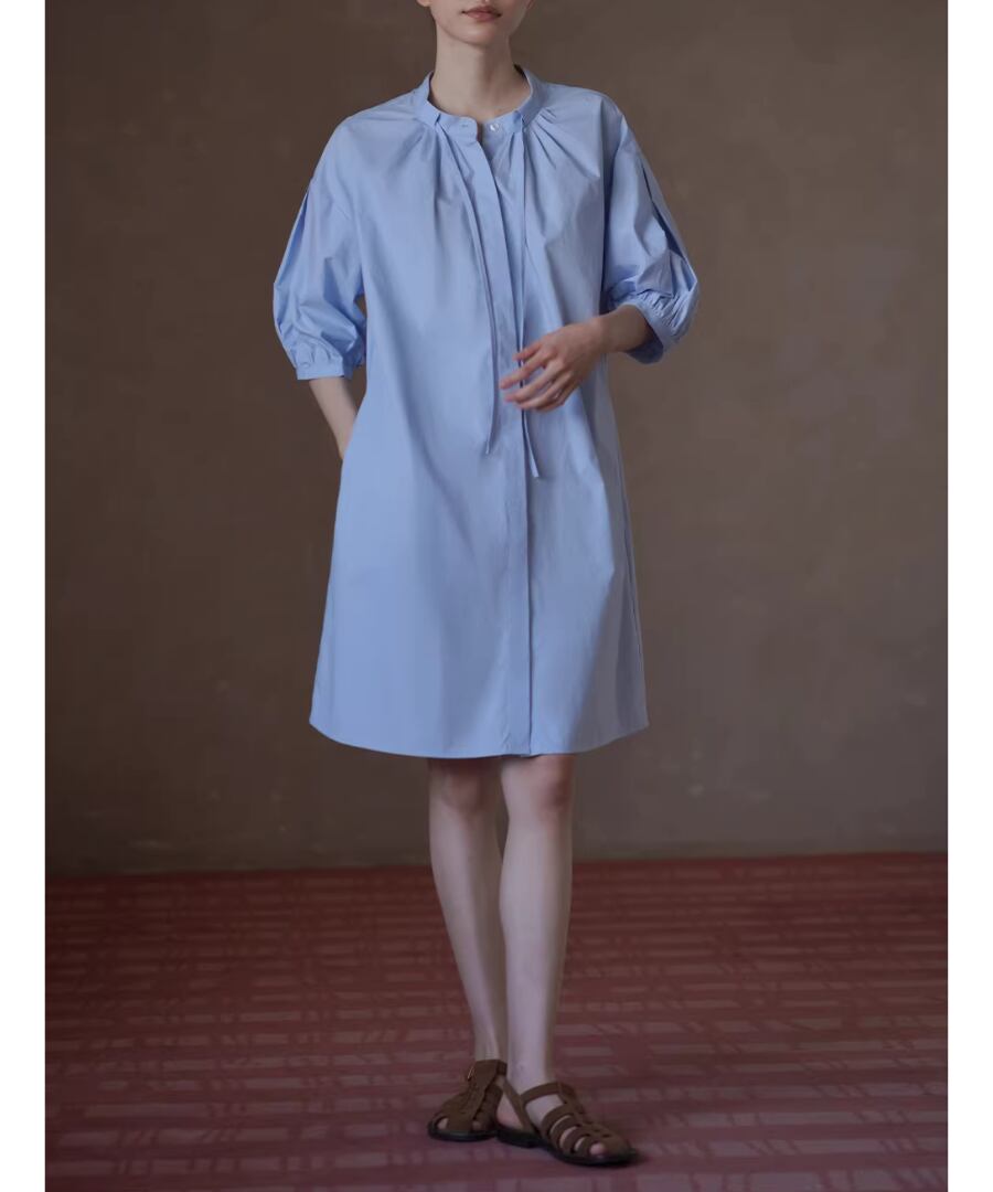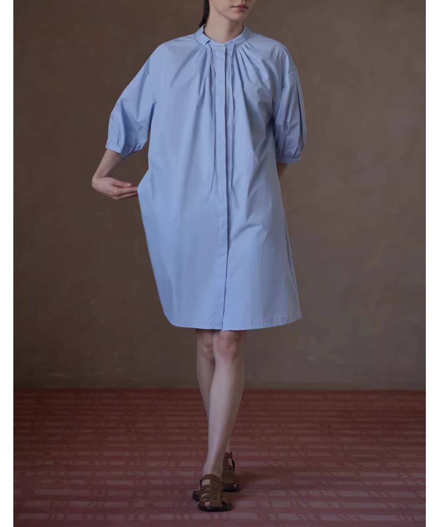 100%コットン素材を使用したスタンドカラーのランタンスリーブシャツワンピース。