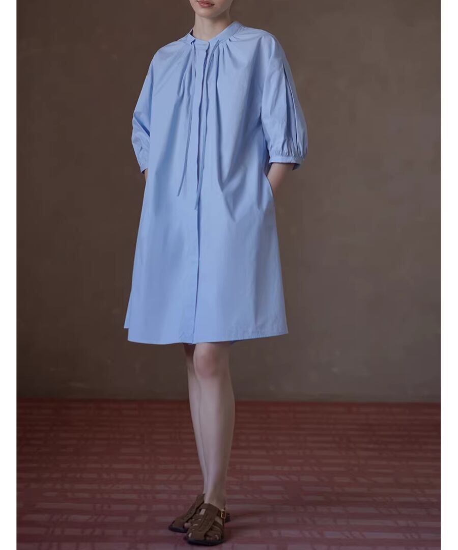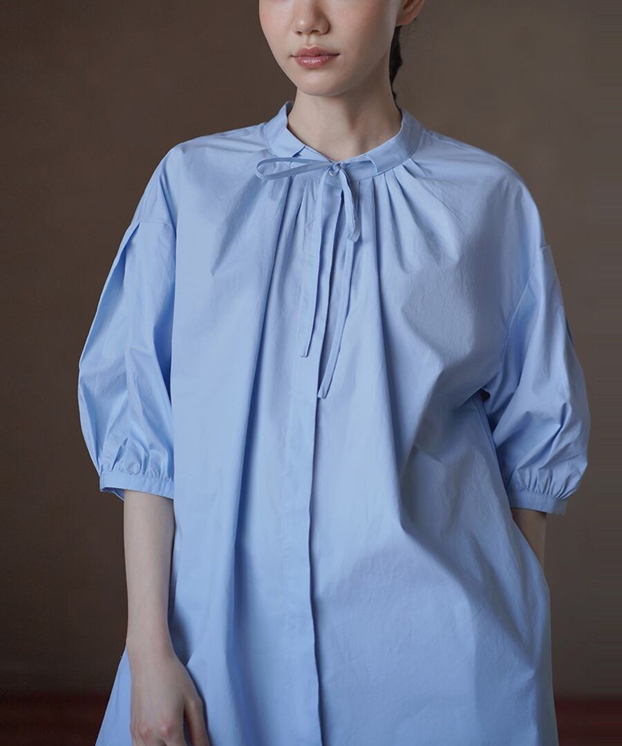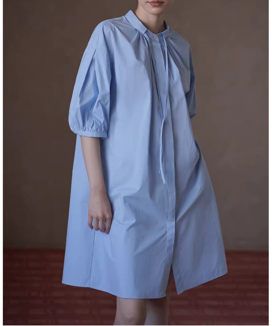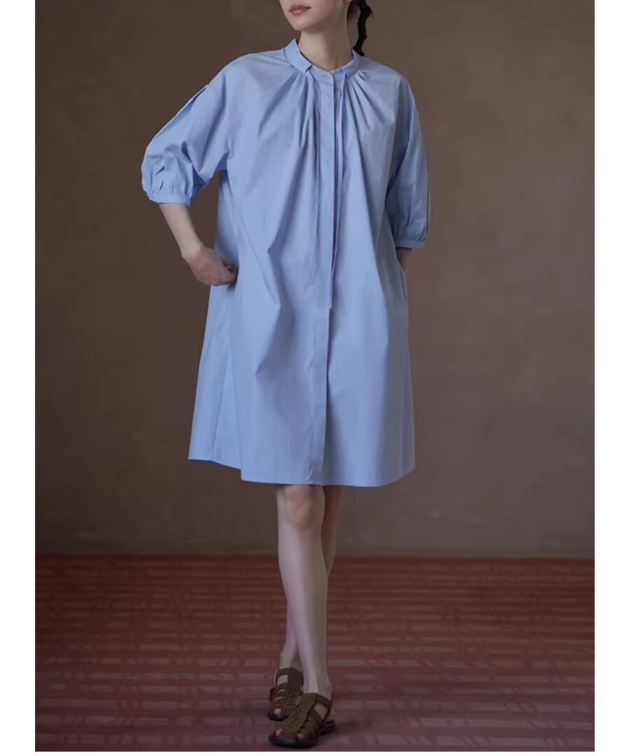 100%コットン素材を使用したスタンドカラーのランタンスリーブシャツワンピース。