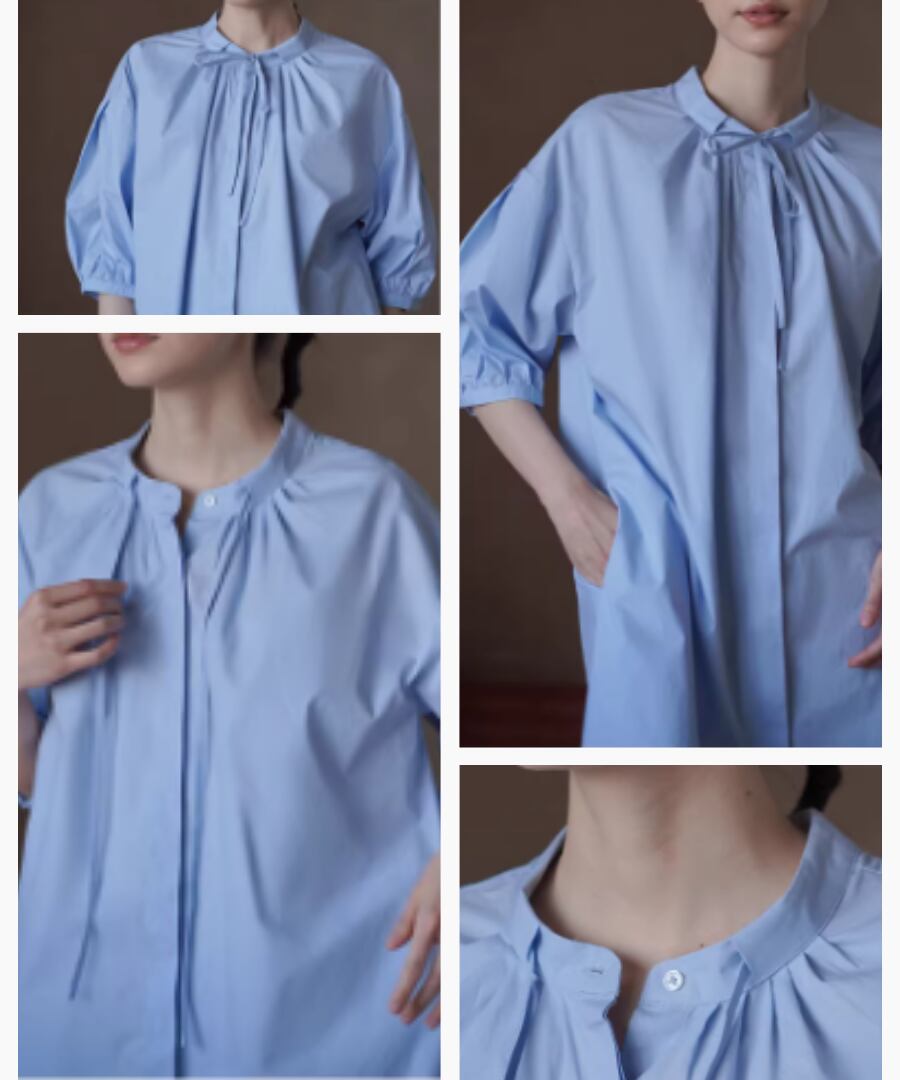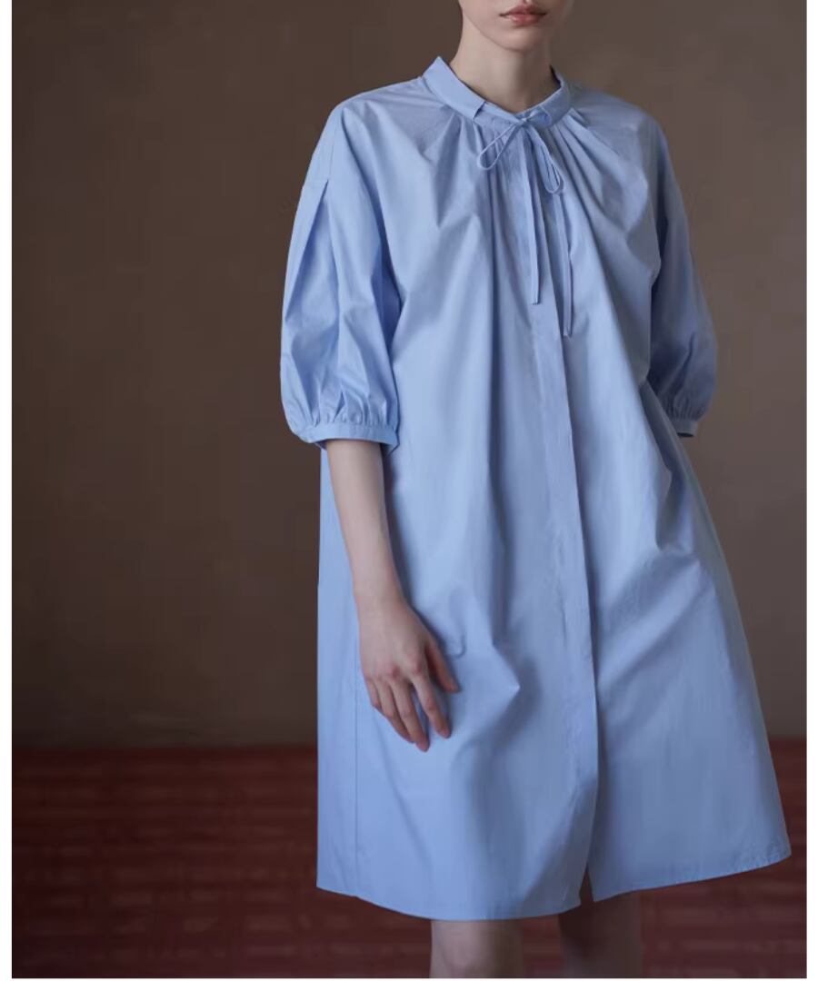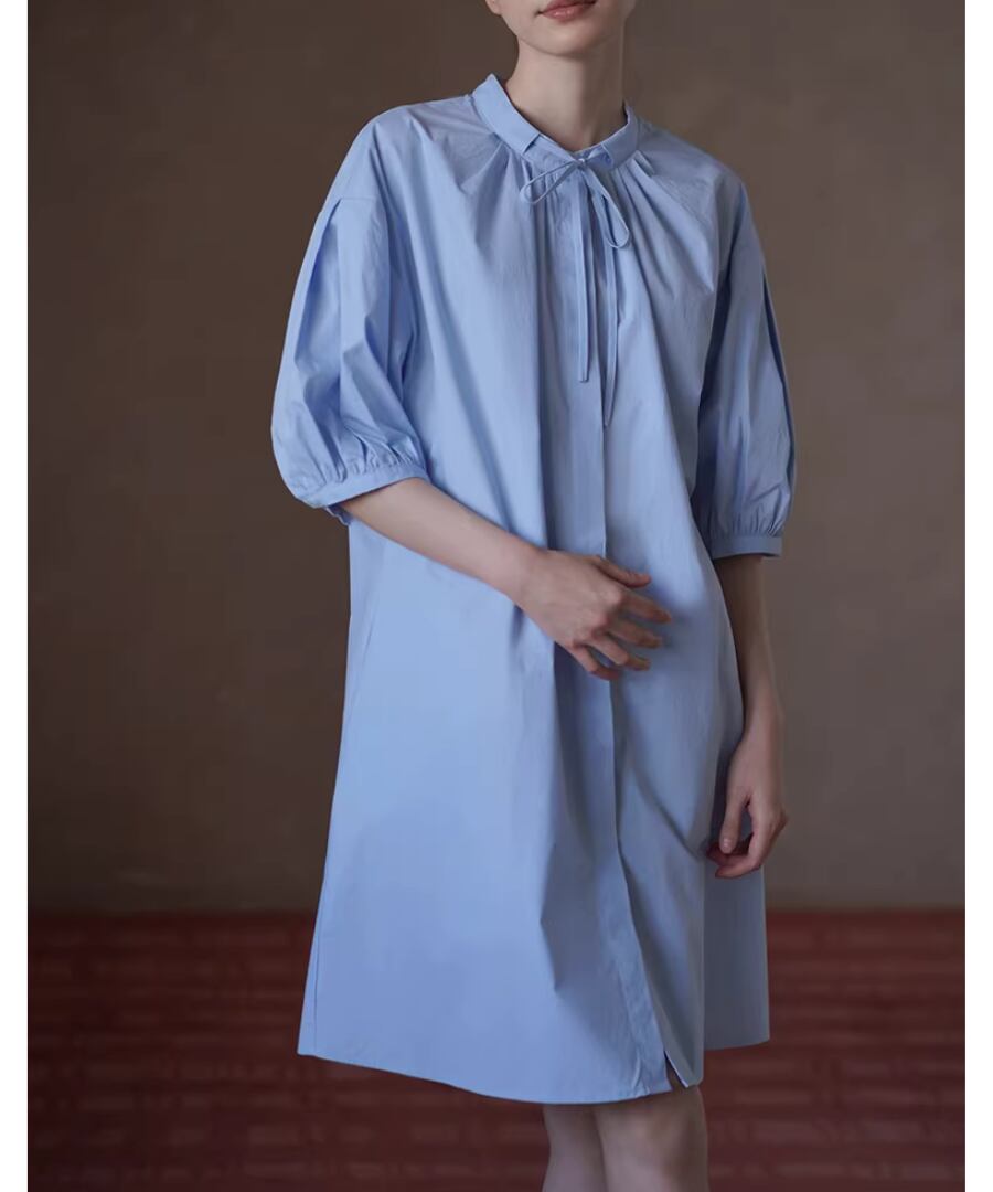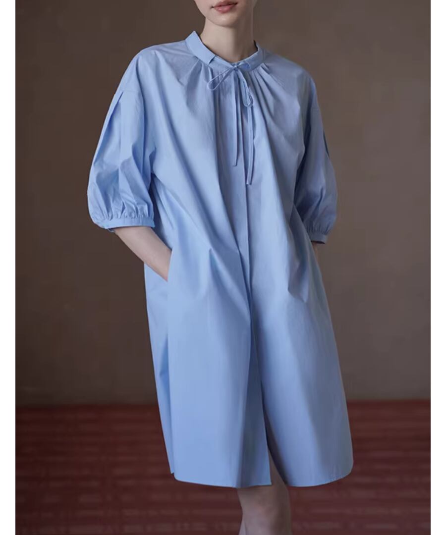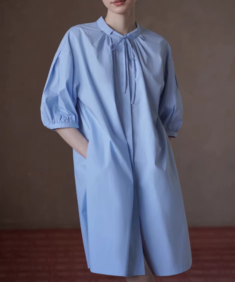 100%コットン素材を使用したスタンドカラーのランタンスリーブシャツワンピース。