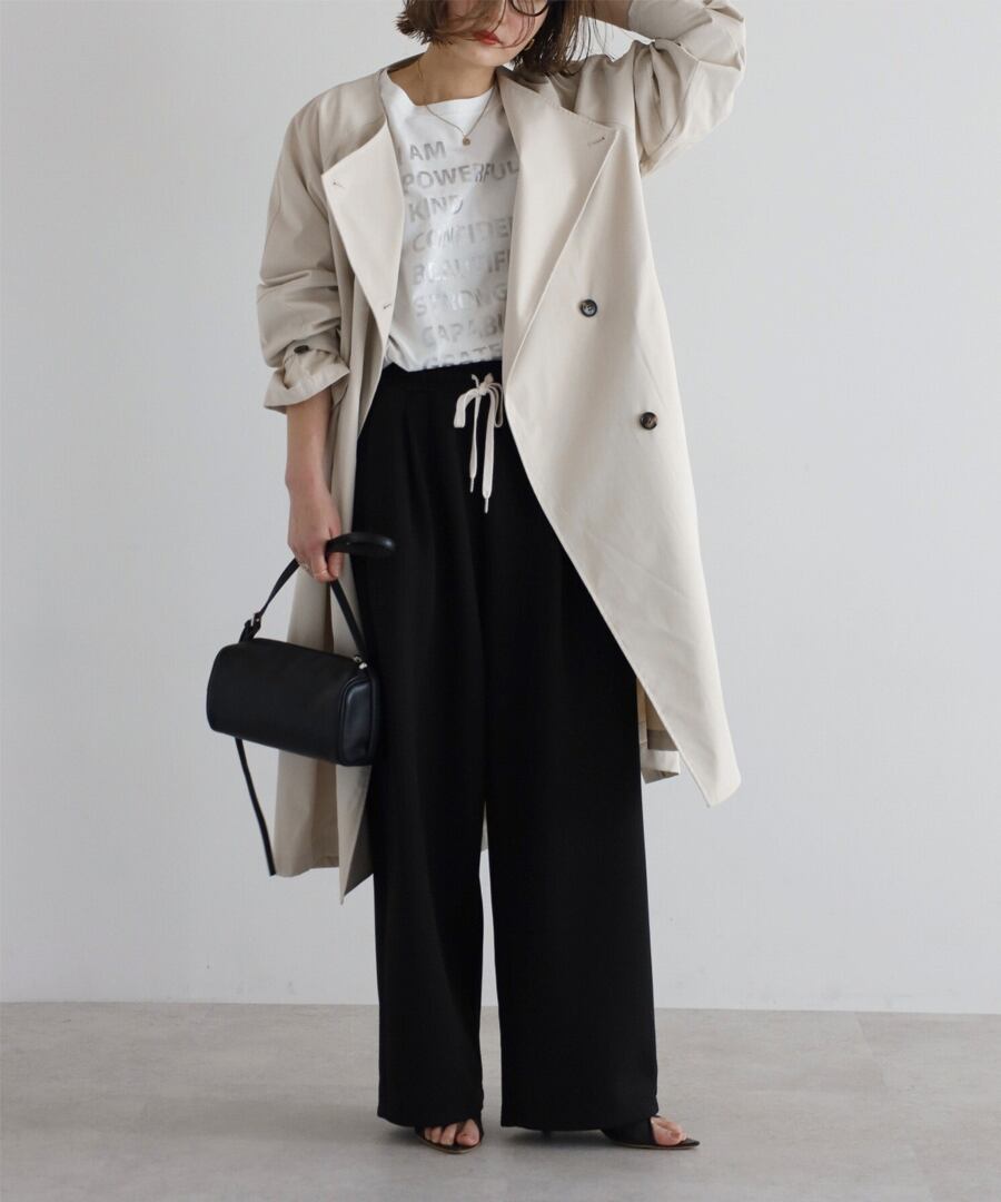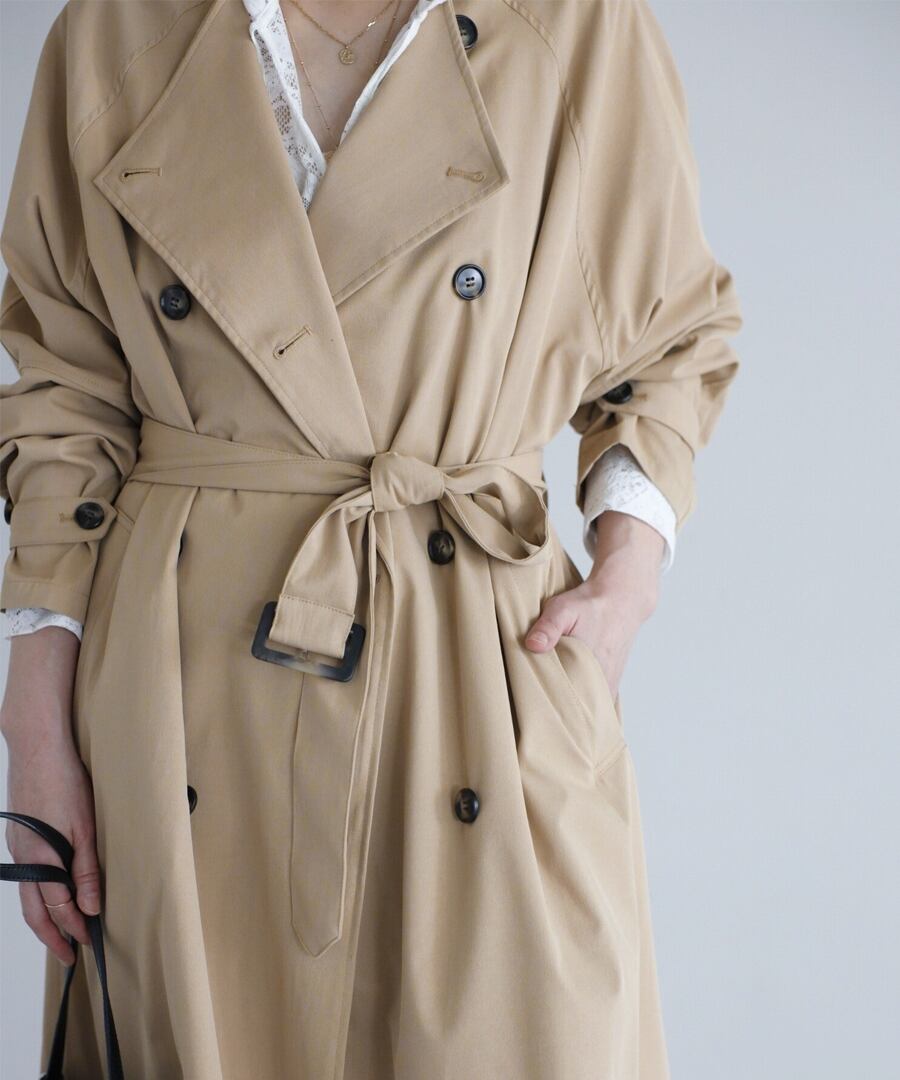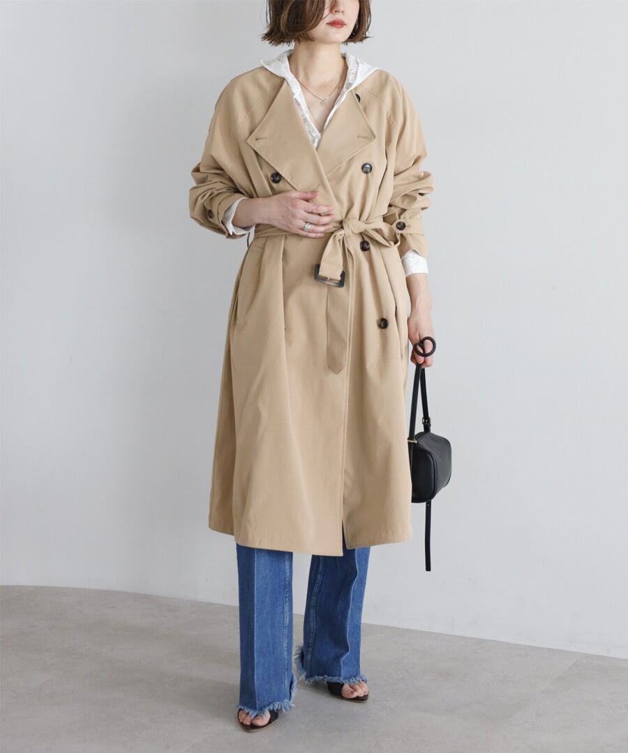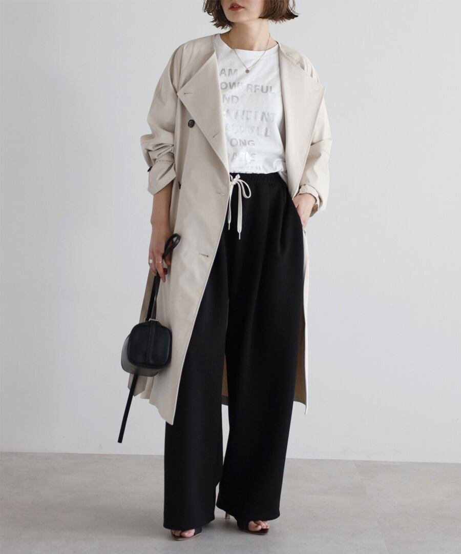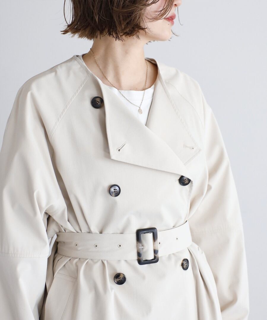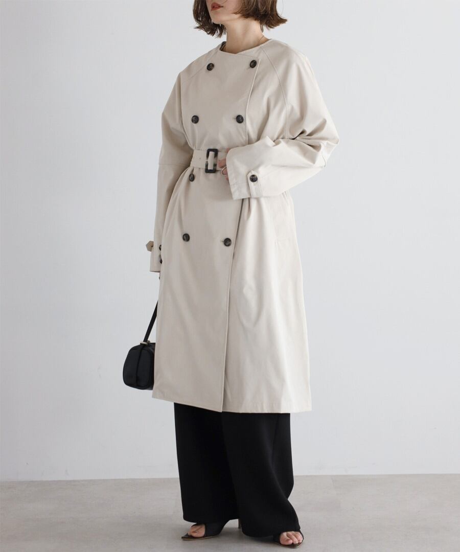 上品な抜け感を引き立てる、ノーカラーベルト付きトレンチコート
