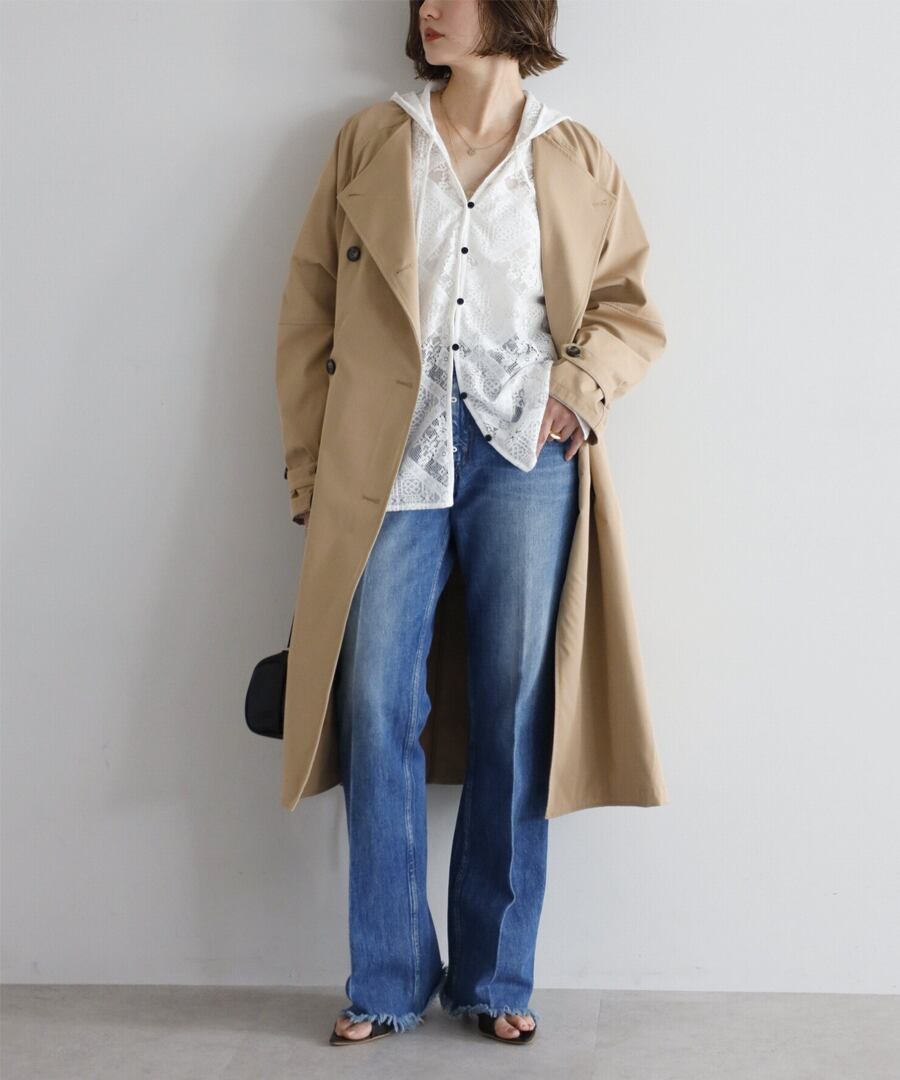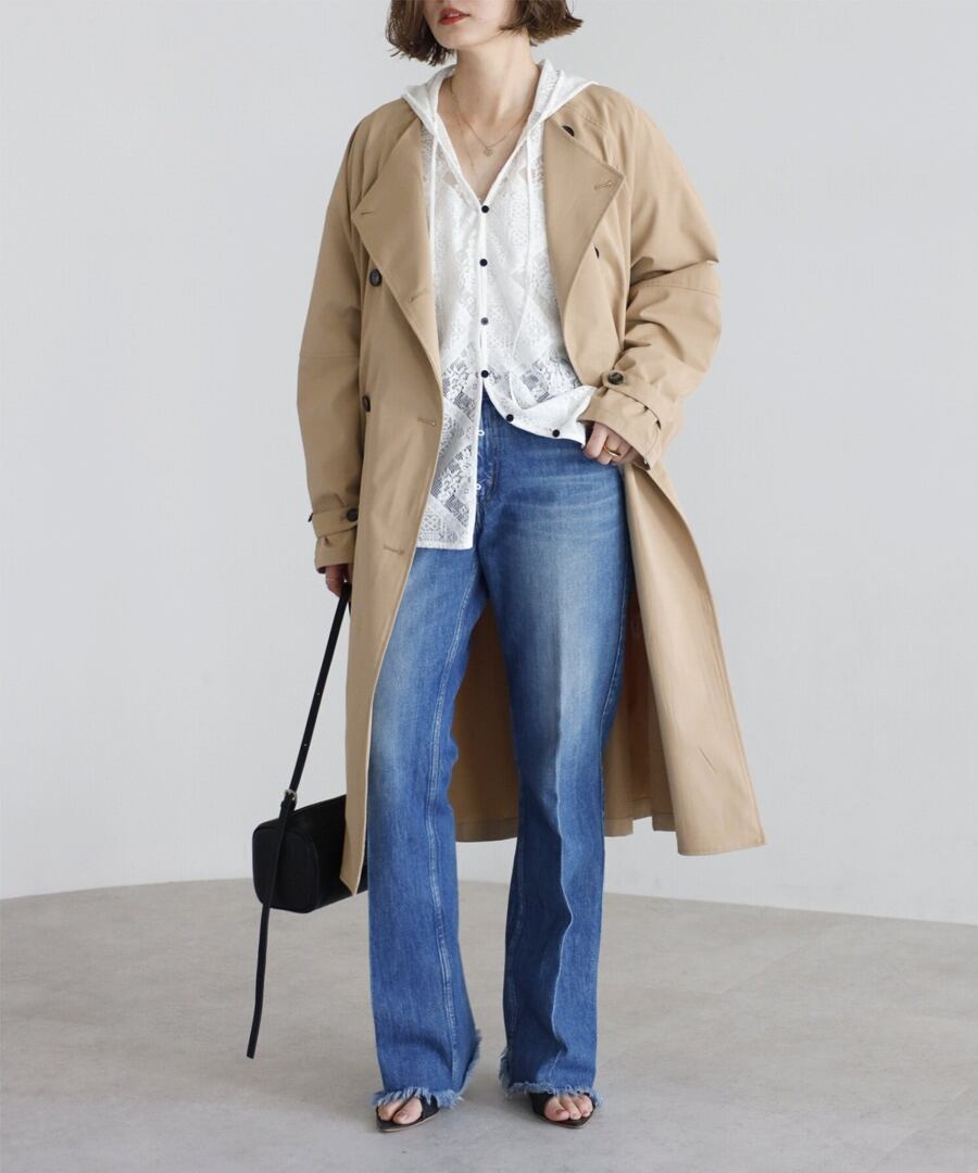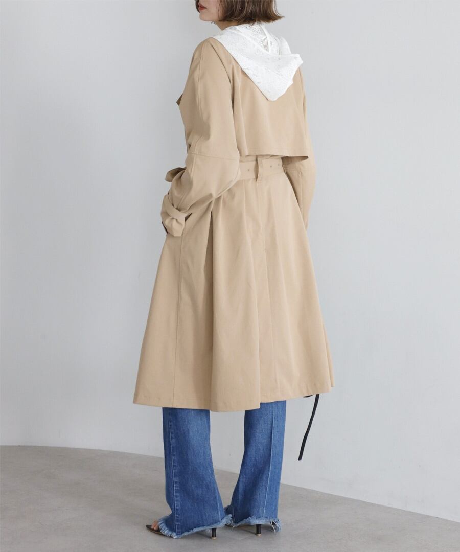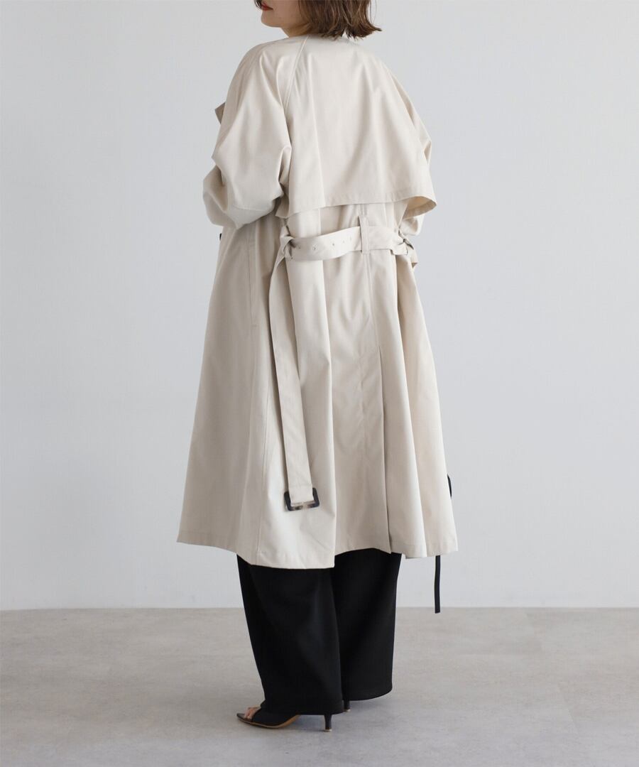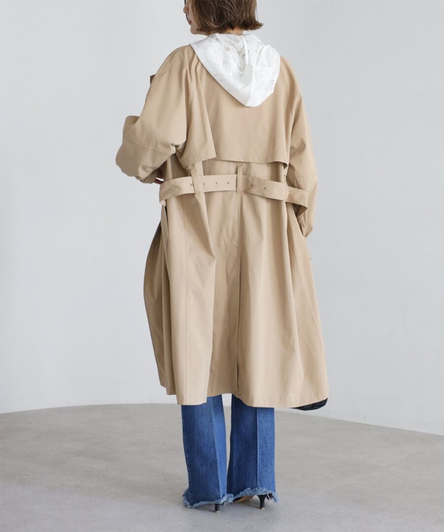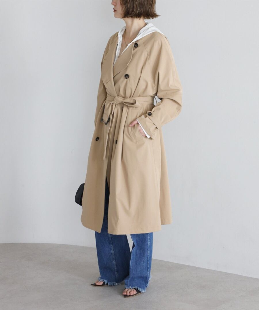 上品な抜け感を引き立てる、ノーカラーベルト付きトレンチコート