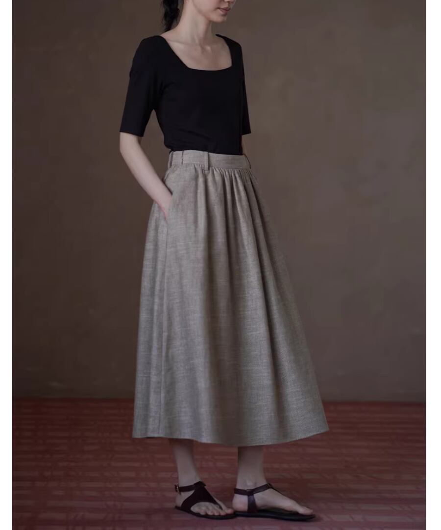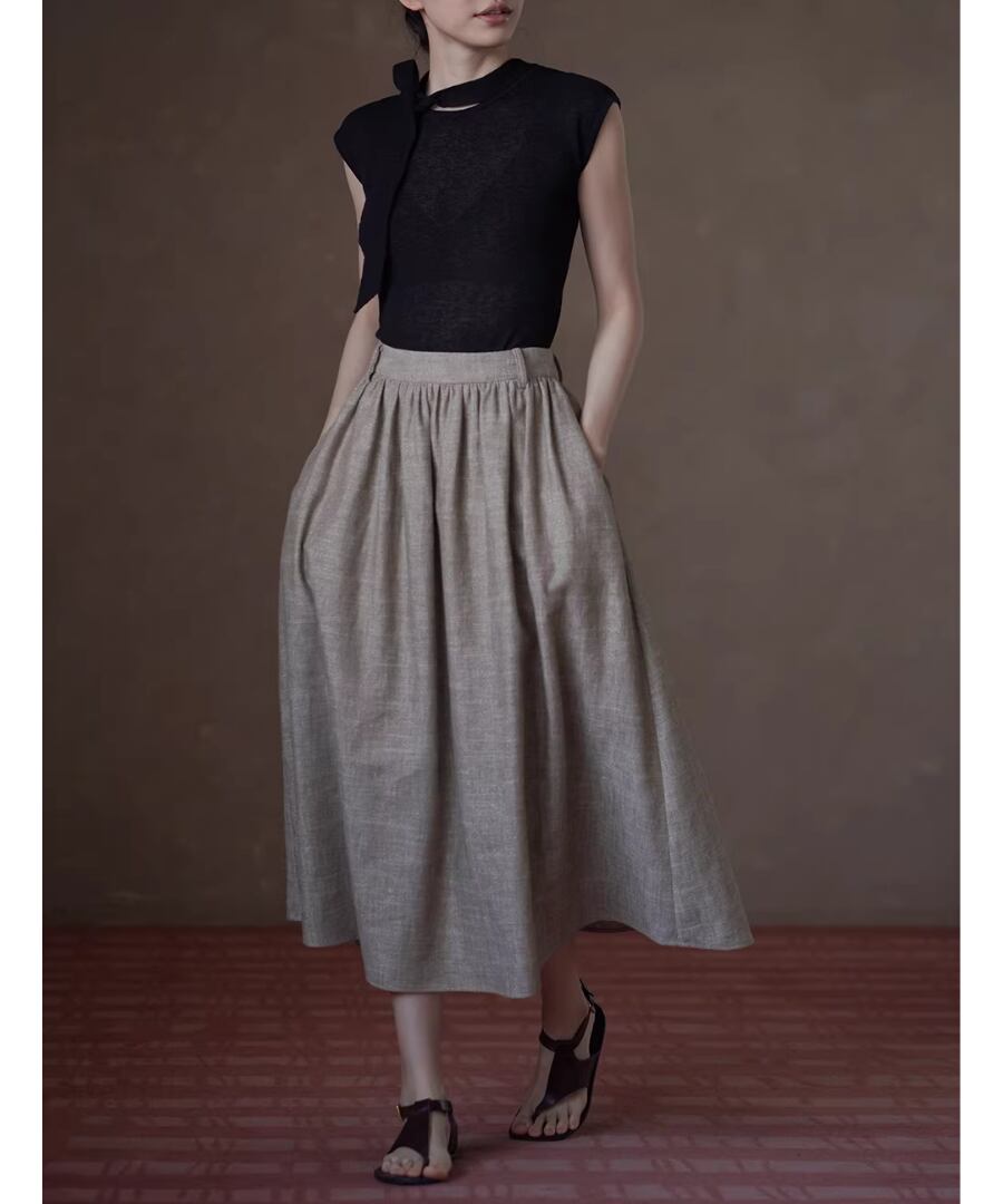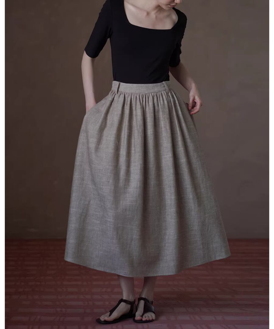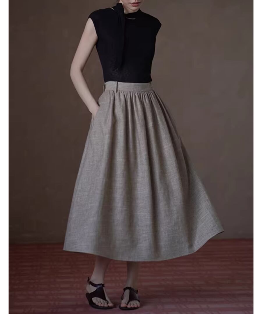 美しいシルエットを楽しみながら、快適な履き心地を実現するリネンラミーコットン混紡のハイウエストプリーツパフィーミディスカート。