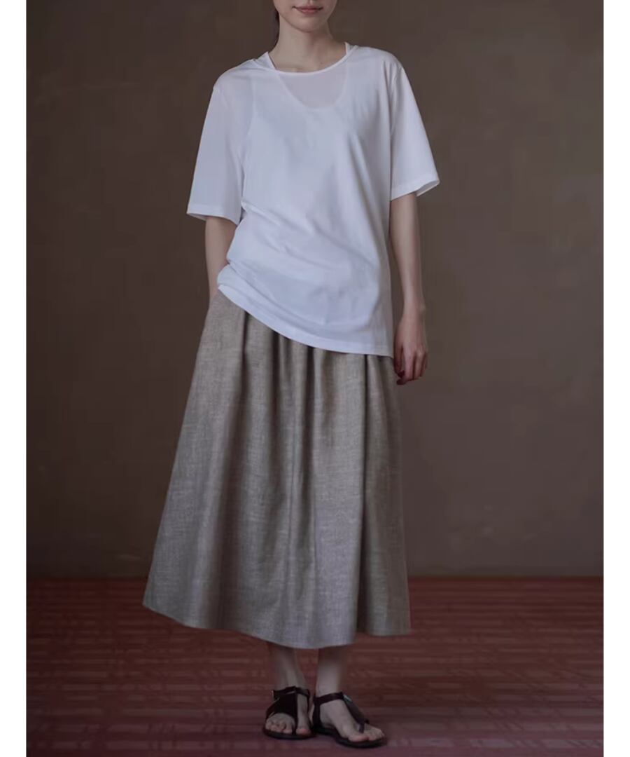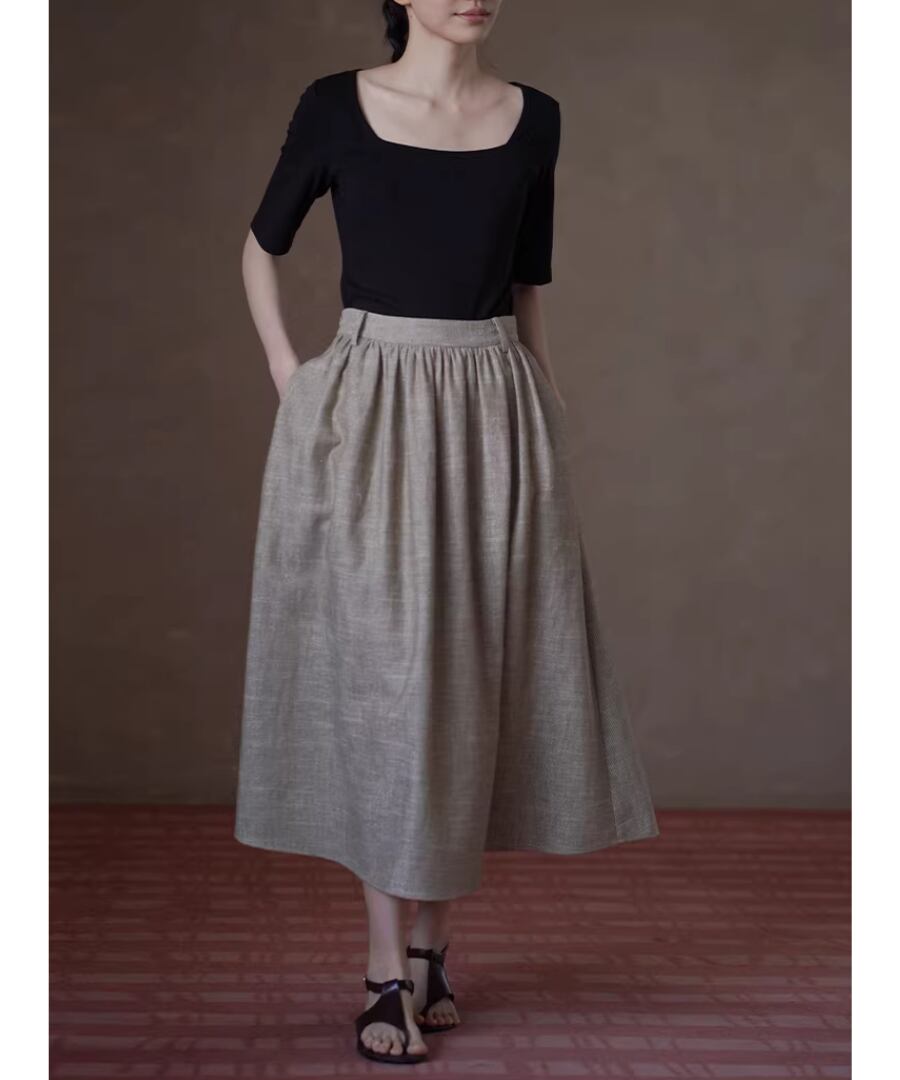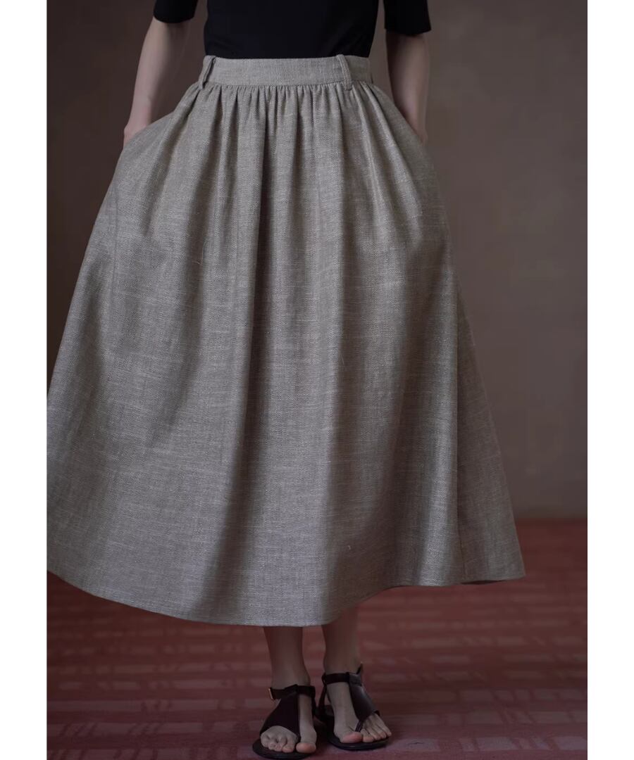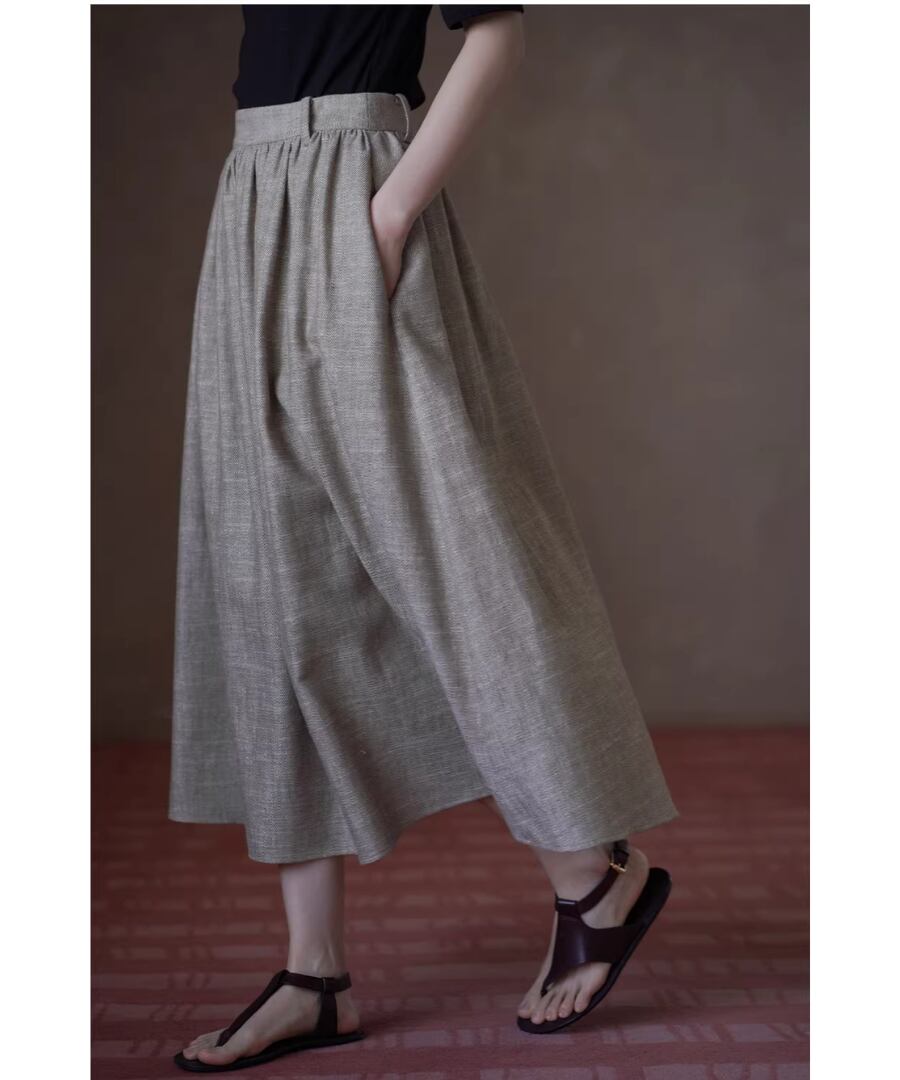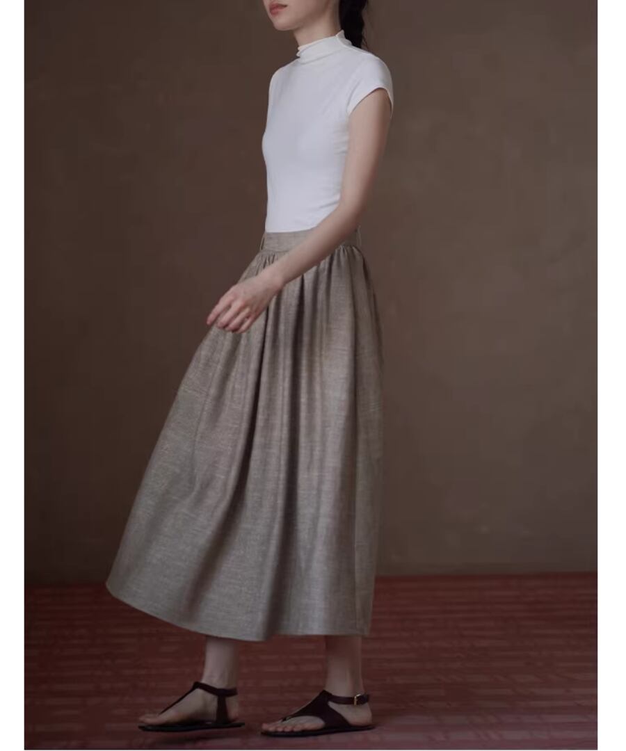 美しいシルエットを楽しみながら、快適な履き心地を実現するリネンラミーコットン混紡のハイウエストプリーツパフィーミディスカート。