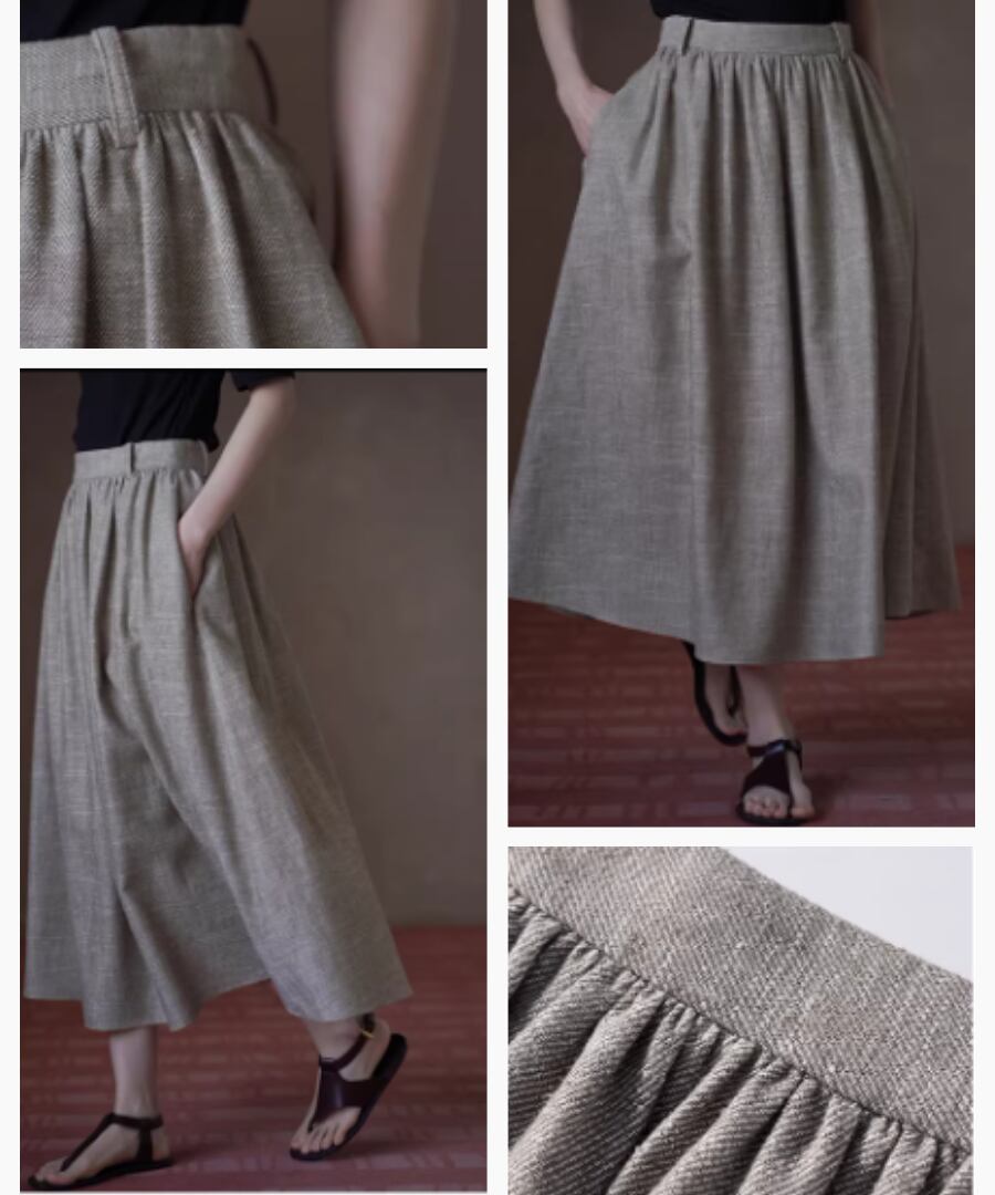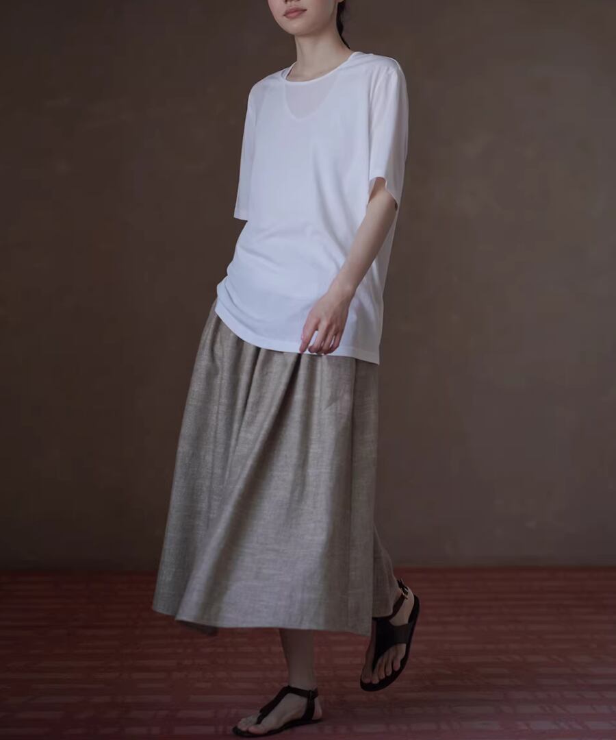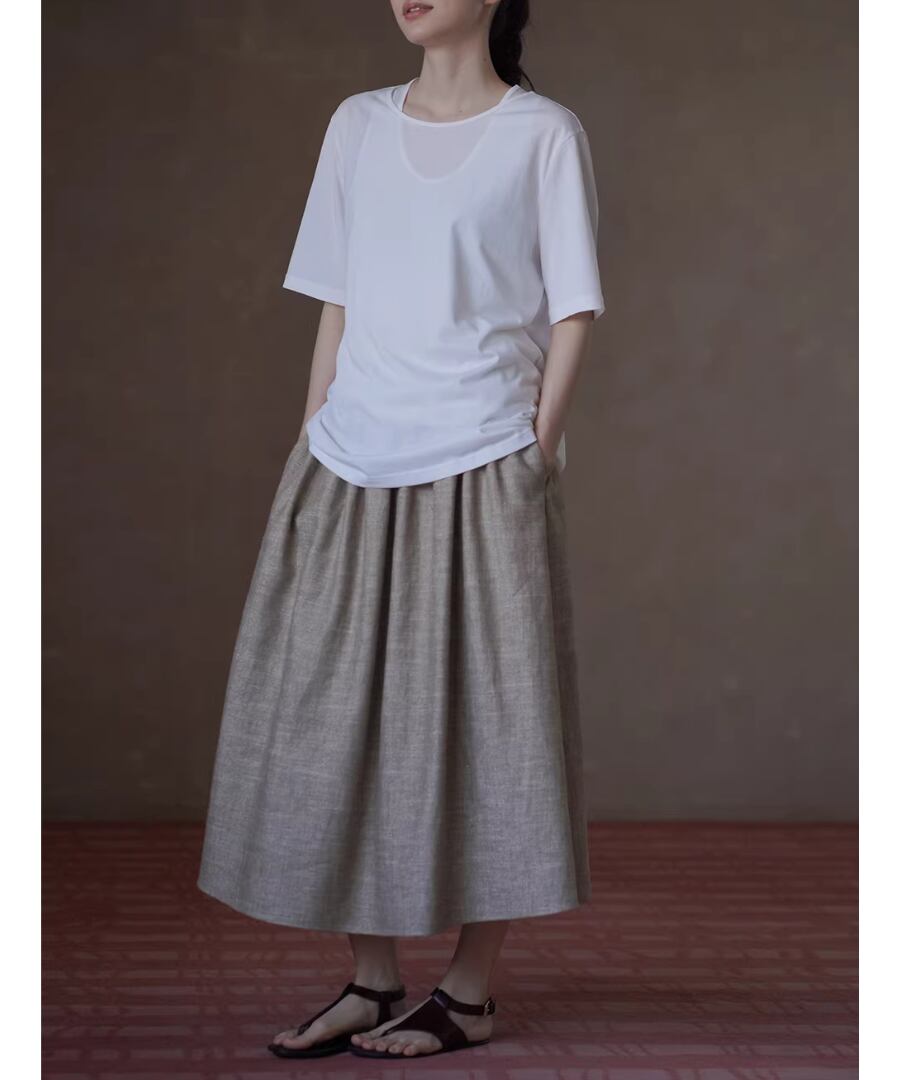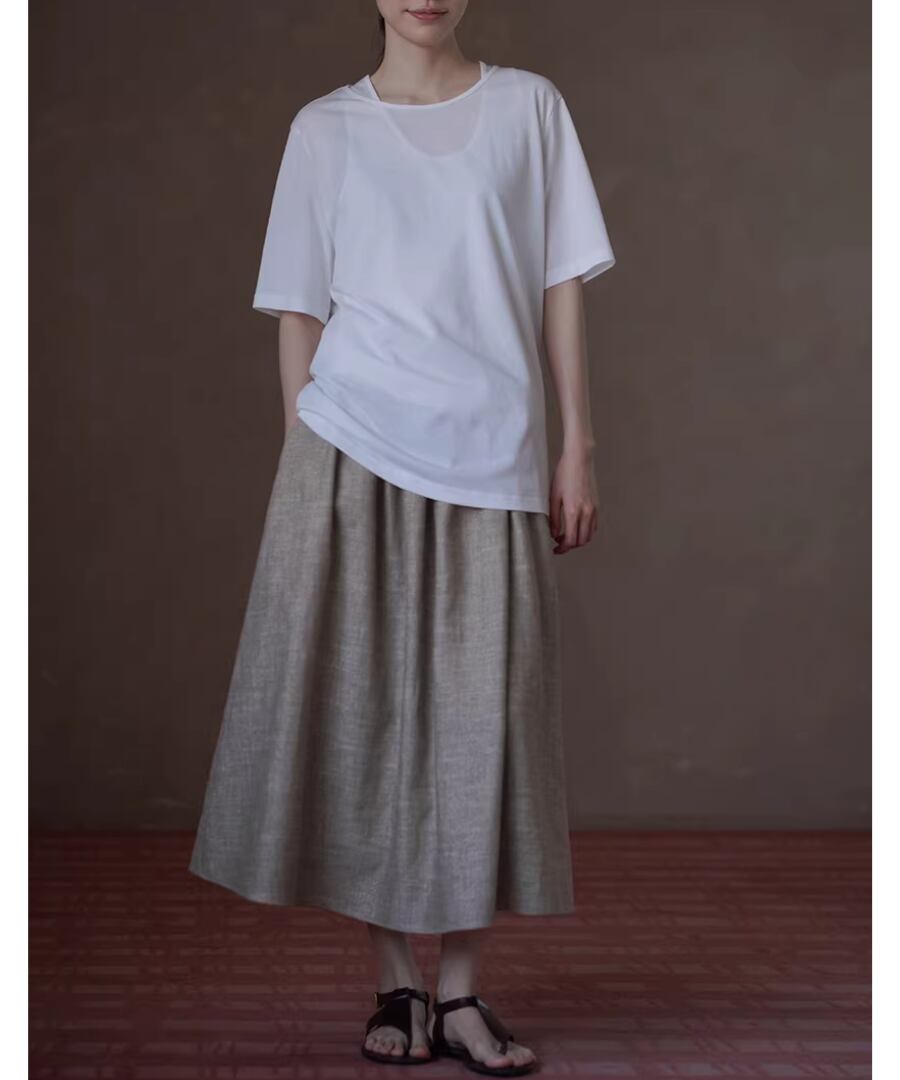 美しいシルエットを楽しみながら、快適な履き心地を実現するリネンラミーコットン混紡のハイウエストプリーツパフィーミディスカート。