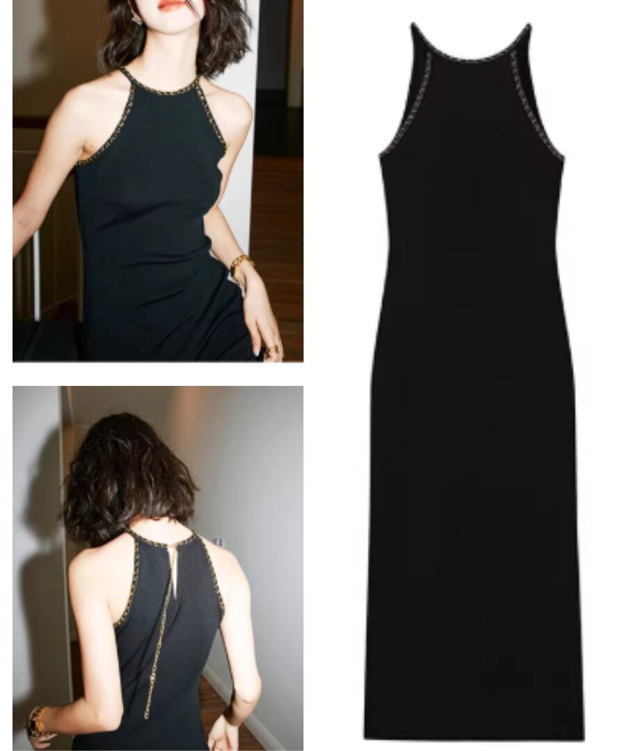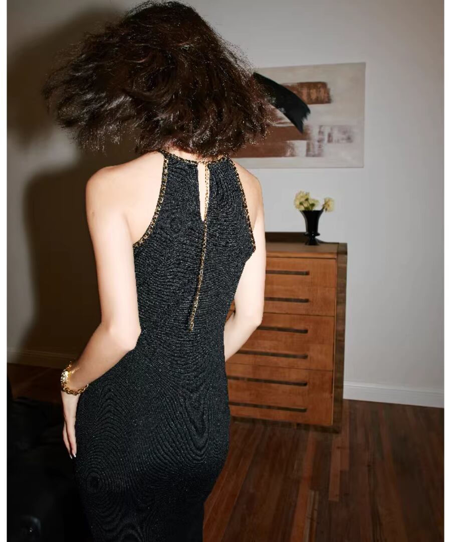 美しいラインが魅力のチェーンノースリーブニットワンピース。