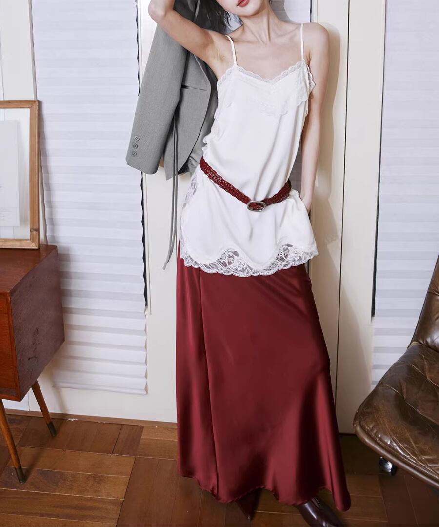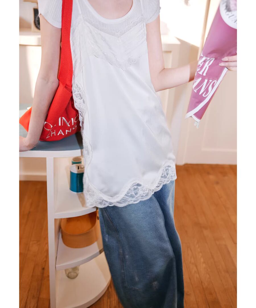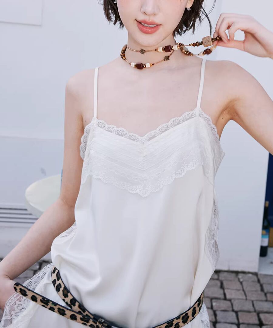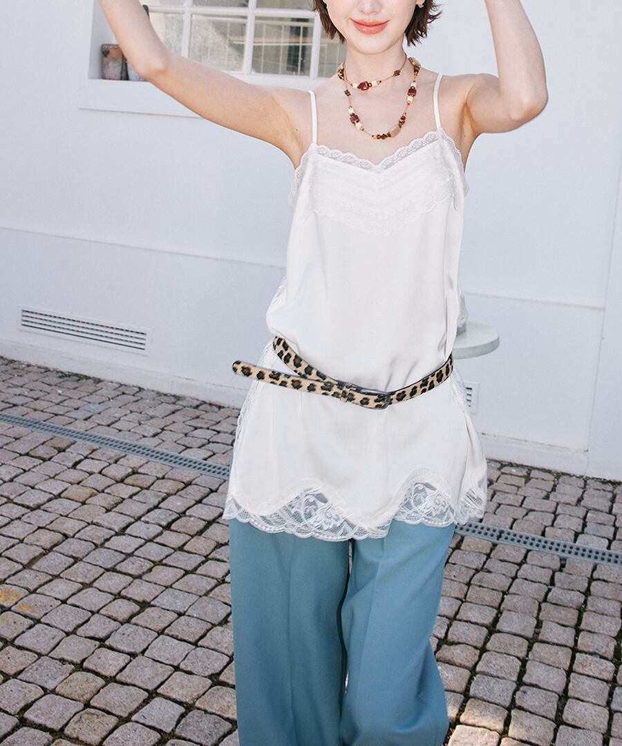 重ね着に最適な、シンプルでエレガントなレーストリムキャミソール。