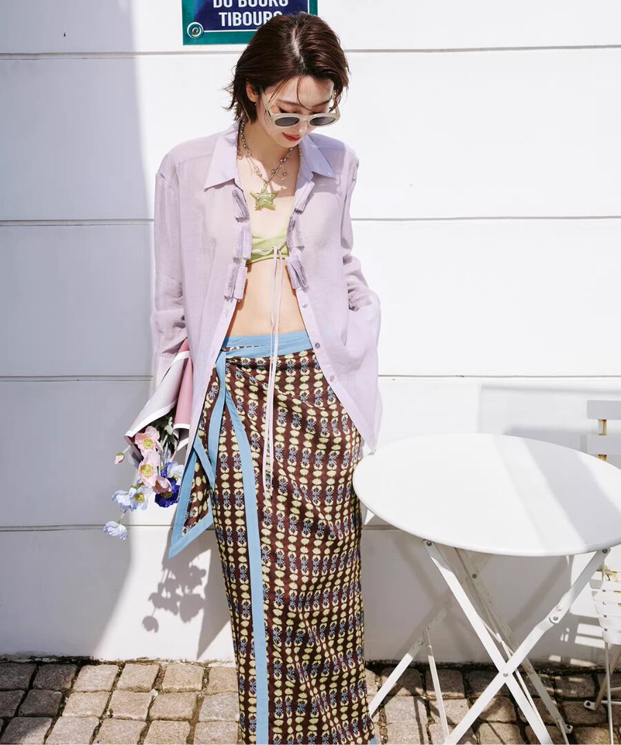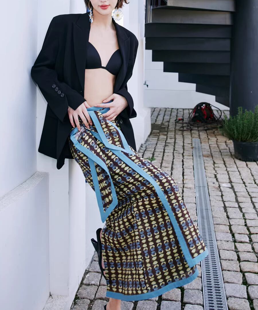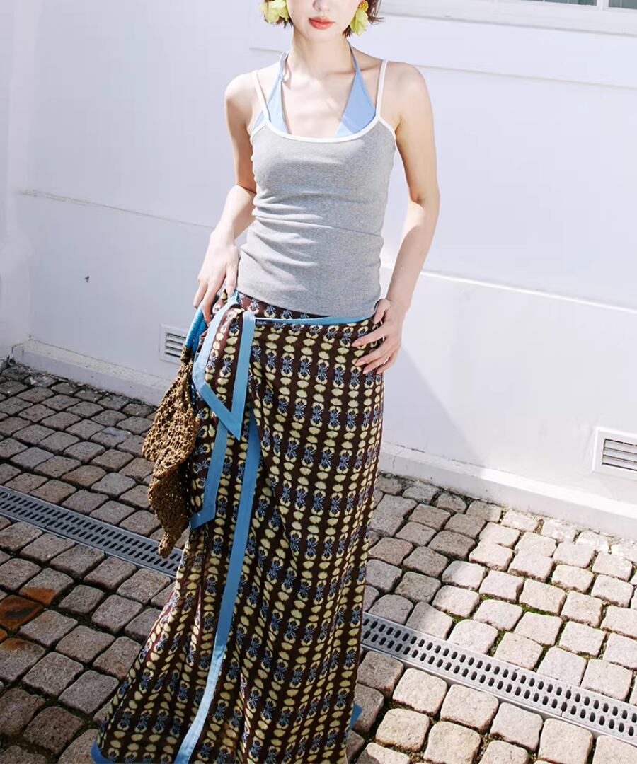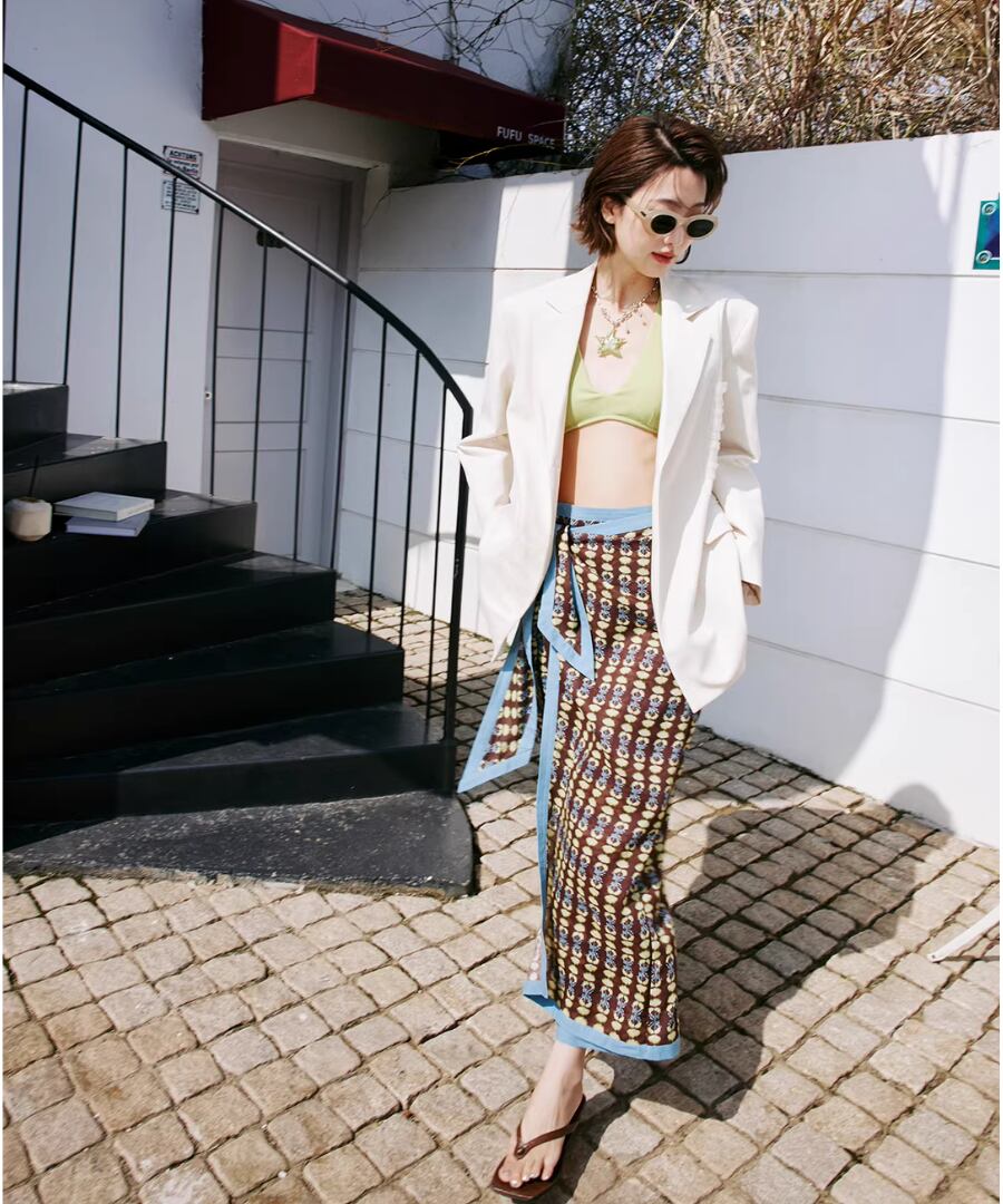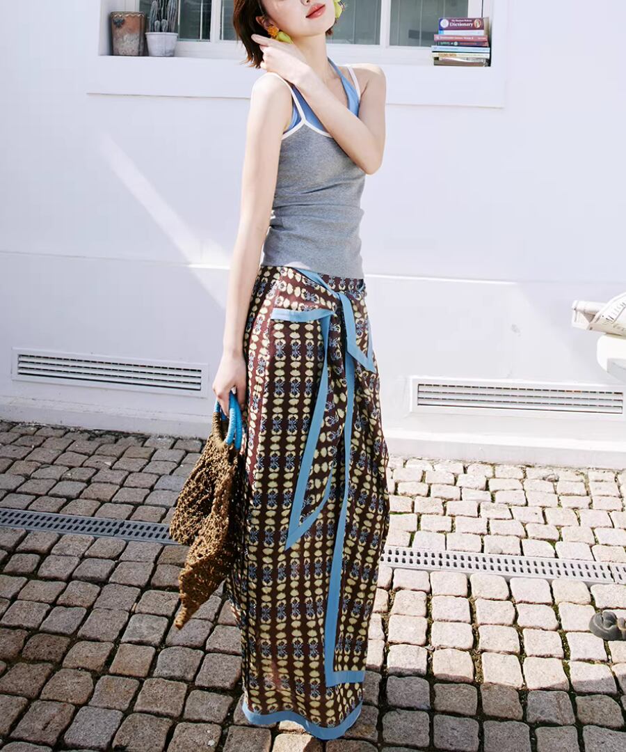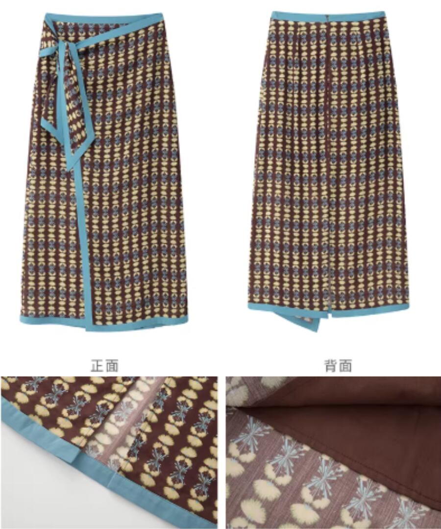 鮮やかなカラーコンビネーションが目を引くラップスカート風のデザイン。