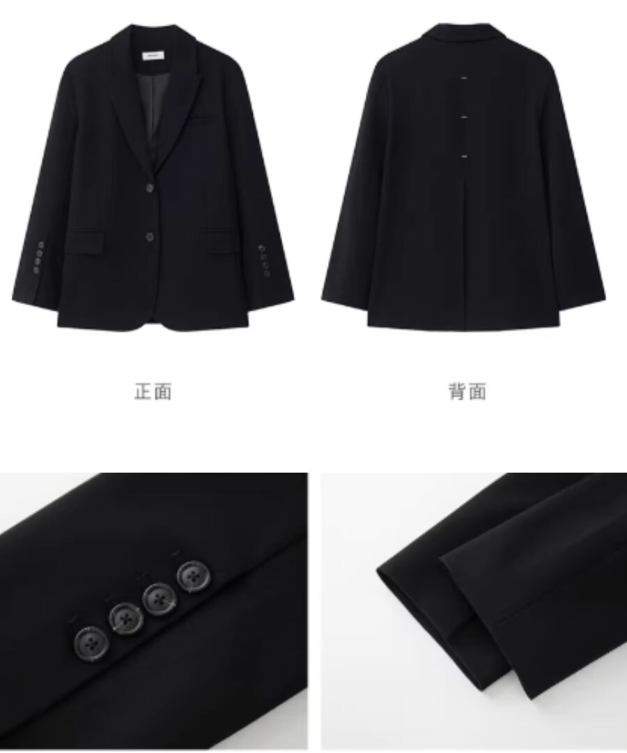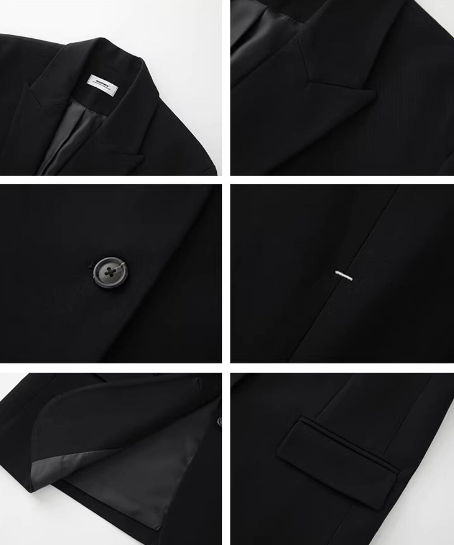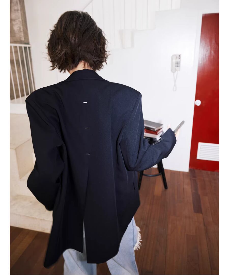 洗練されたスタイルとクールな印象を兼ね備えた、背中にコントラストカラーのノットデザインが施されたスリット入りの黒のスーツジャケット。