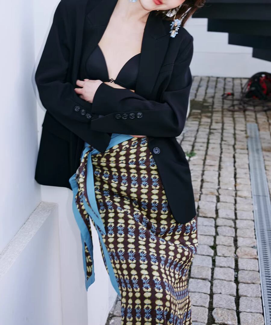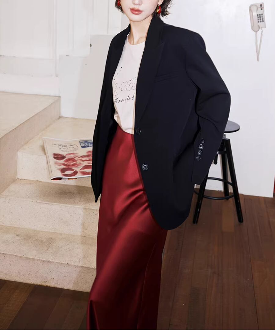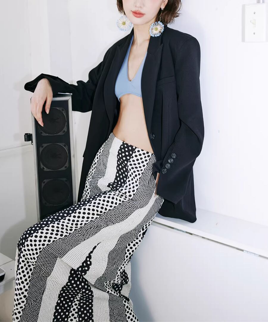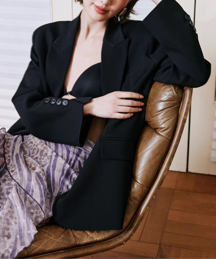 洗練されたスタイルとクールな印象を兼ね備えた、背中にコントラストカラーのノットデザインが施されたスリット入りの黒のスーツジャケット。