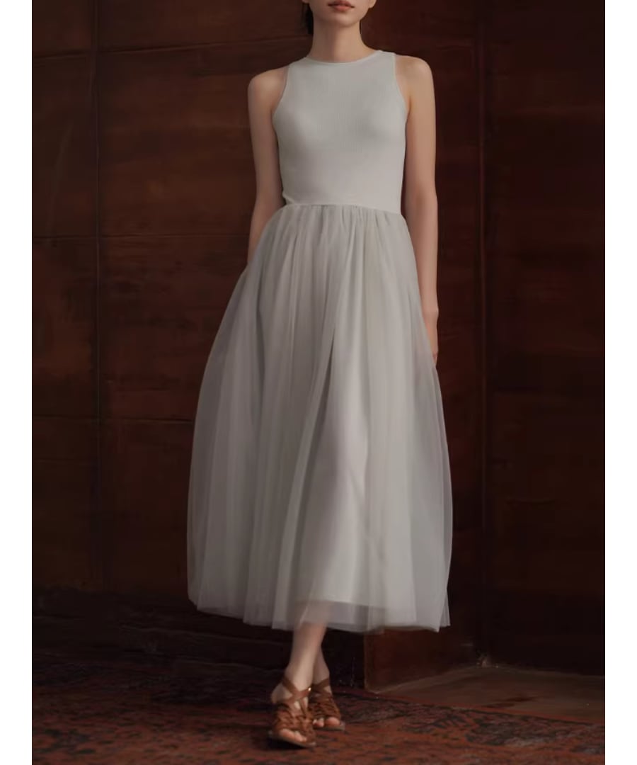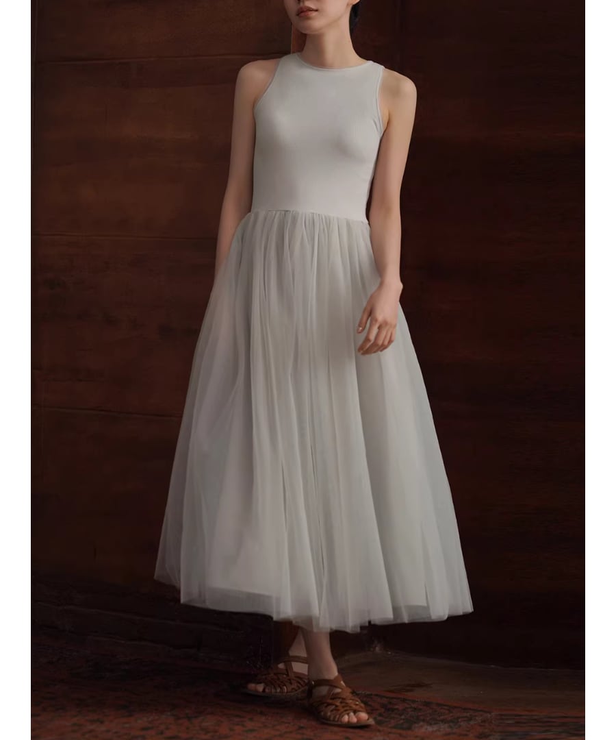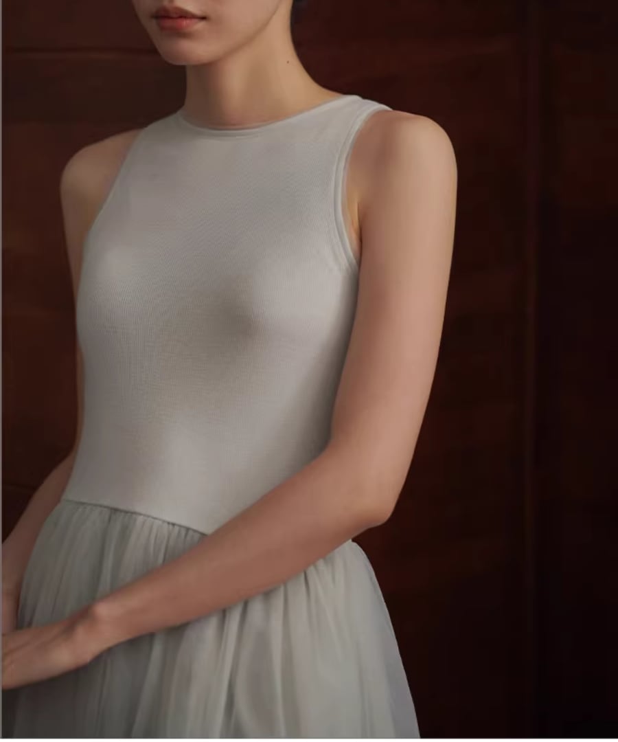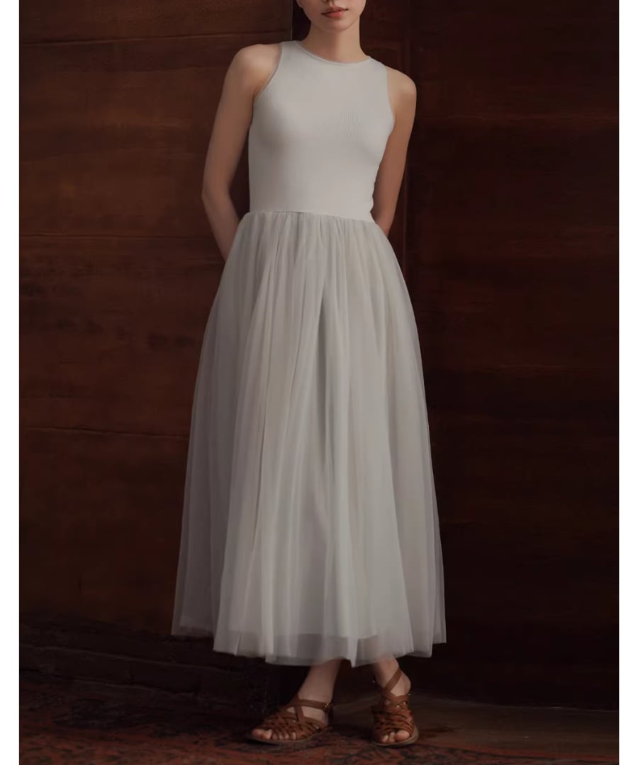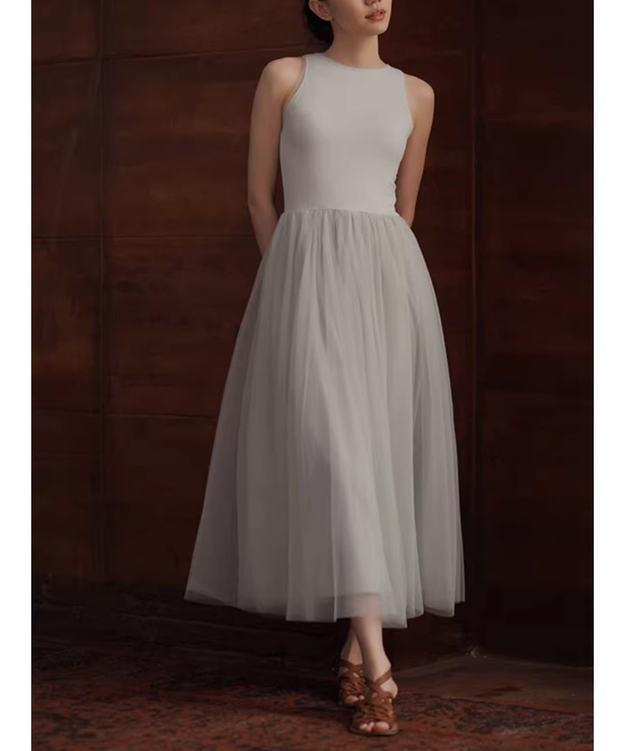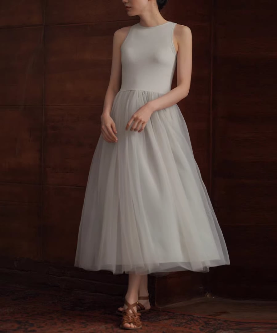 ノースリーブスタイルが清涼感を演出し、軽やかな印象を与えます。
