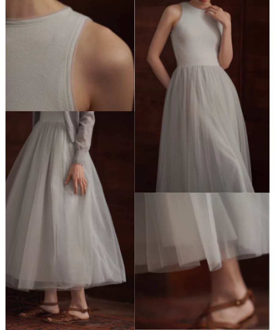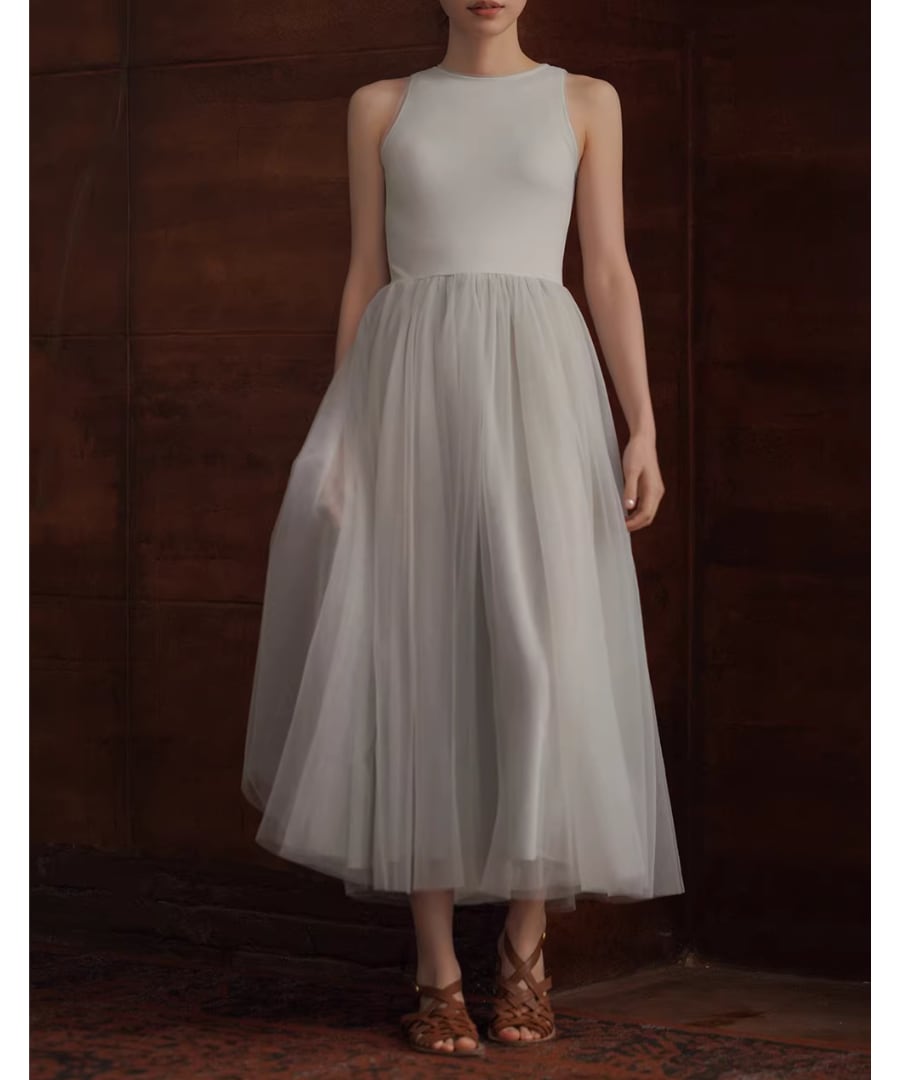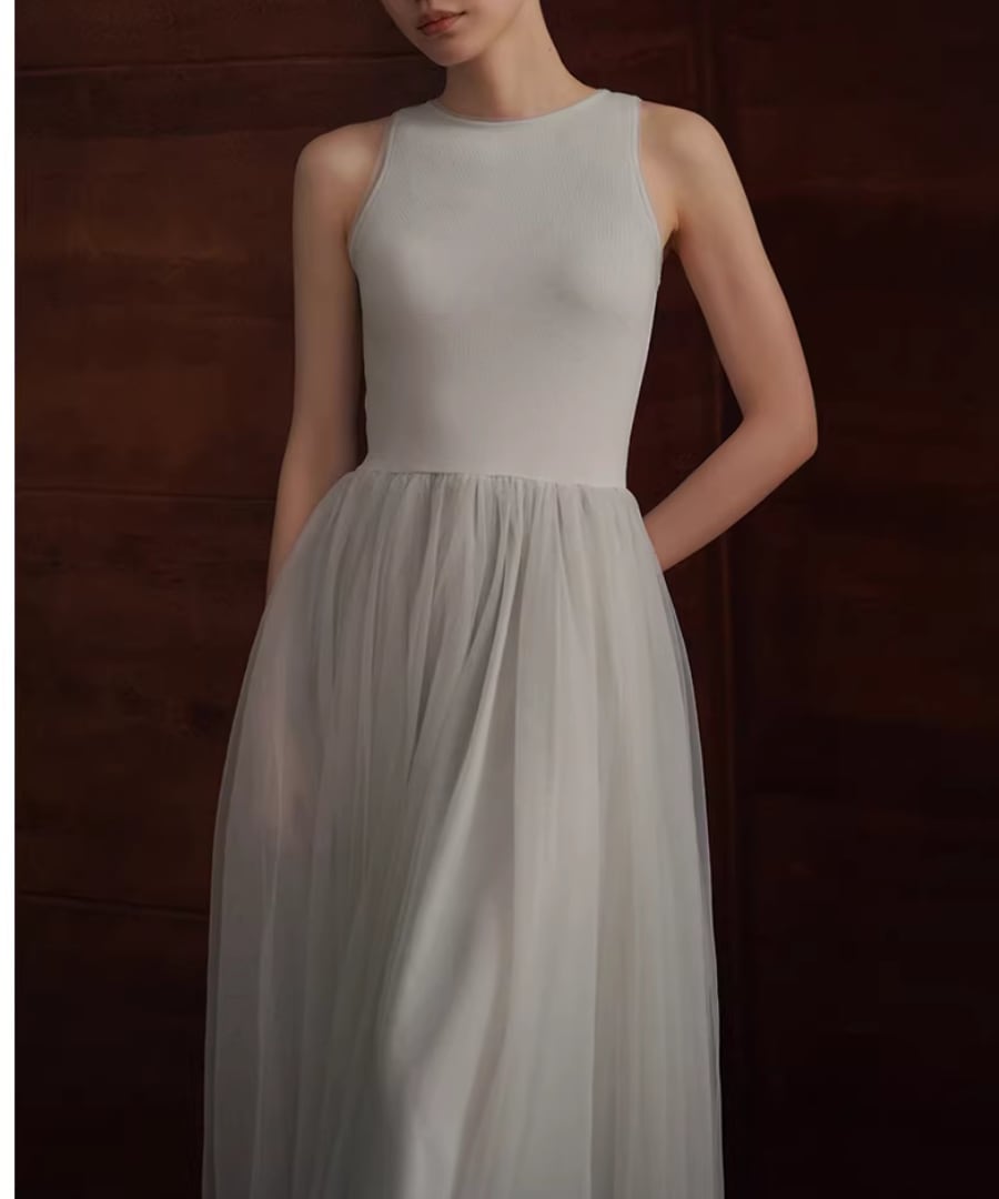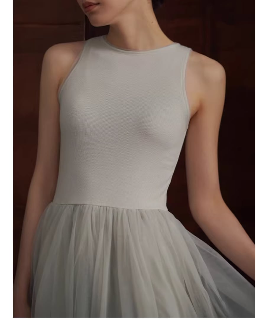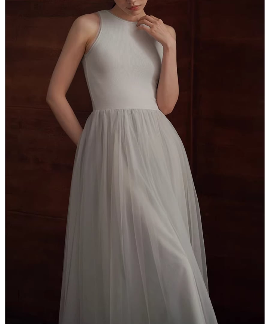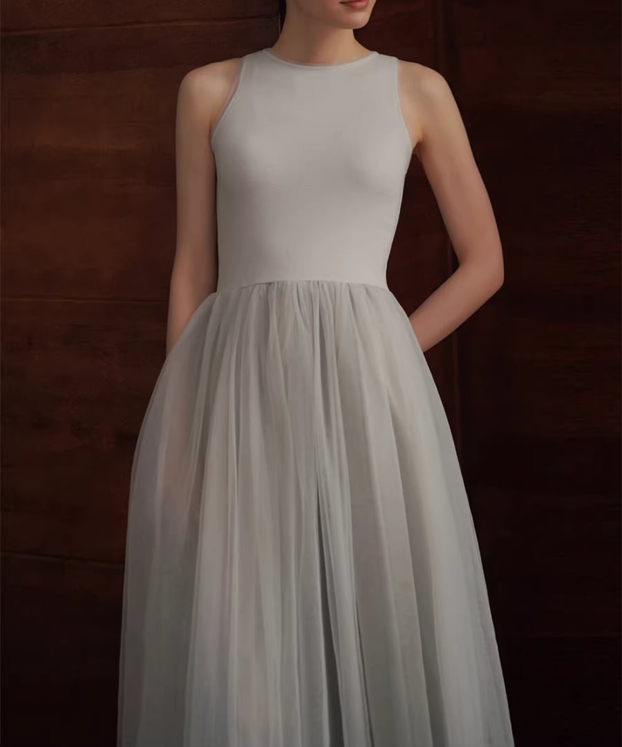 ノースリーブスタイルが清涼感を演出し、軽やかな印象を与えます。