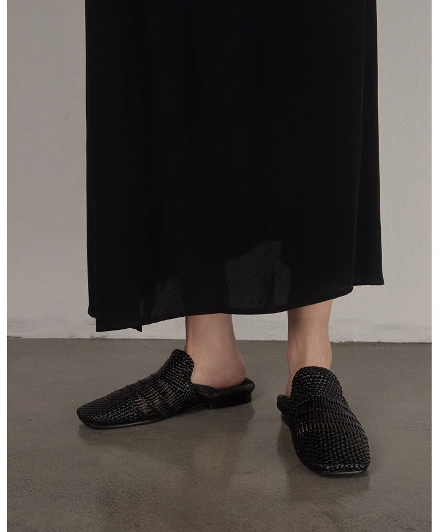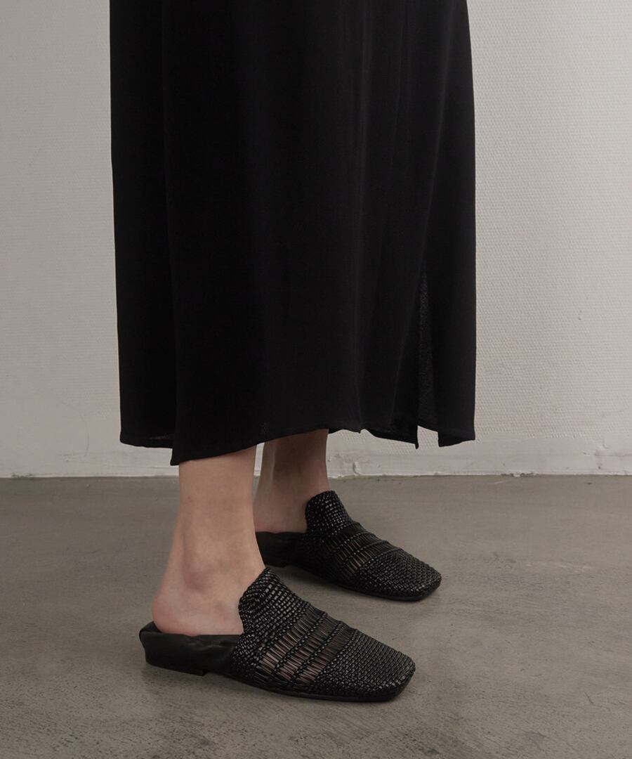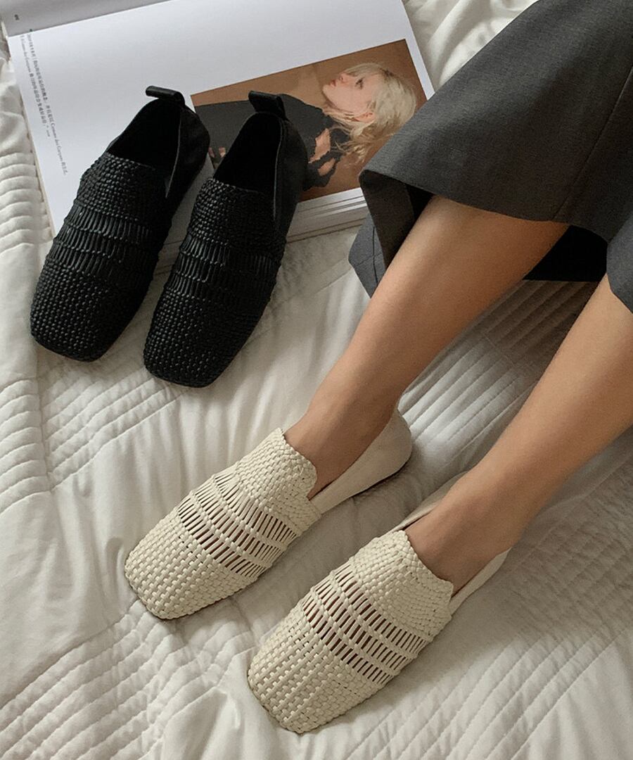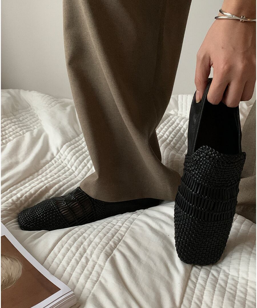 洗練されたスタイルを追求した、手編みの本革を使用したスクエアトゥフラットシューズ。