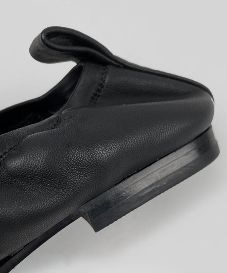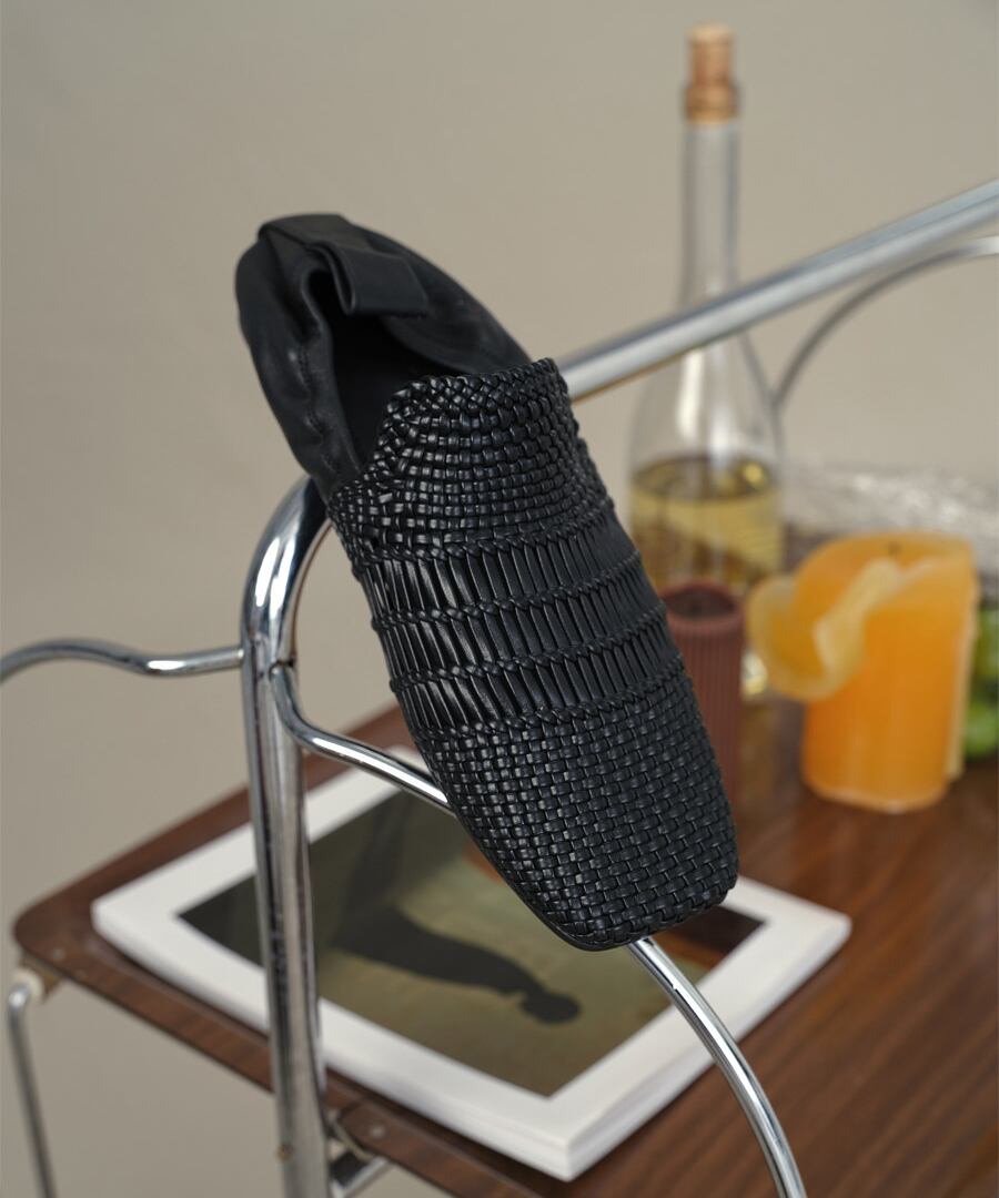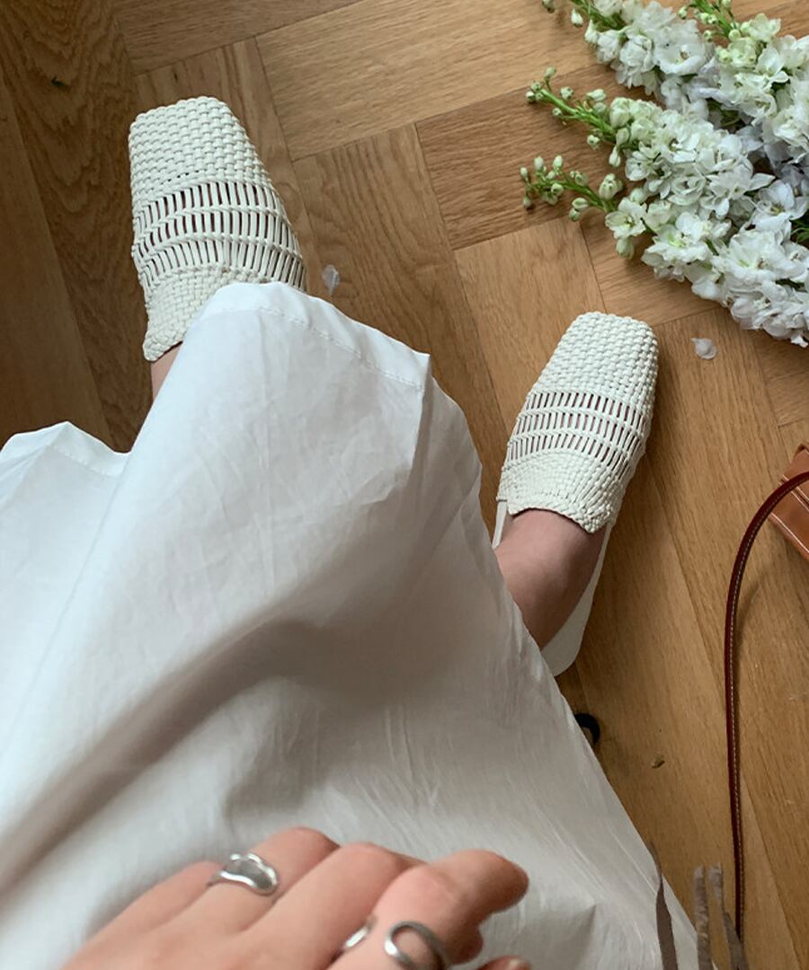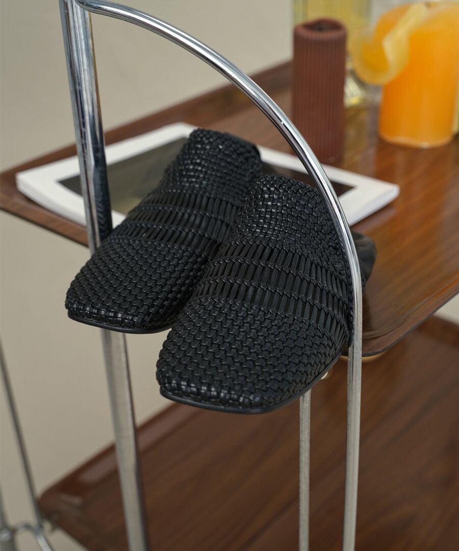 洗練されたスタイルを追求した、手編みの本革を使用したスクエアトゥフラットシューズ。