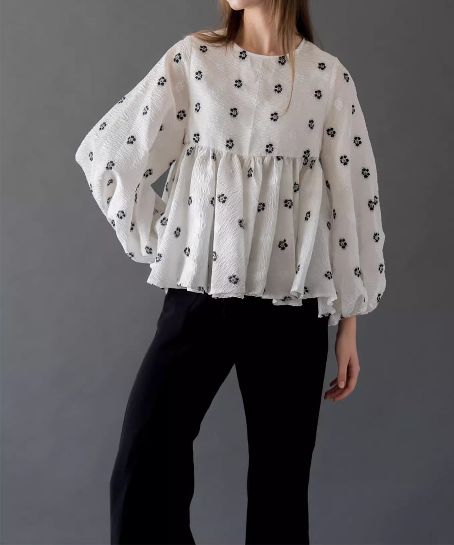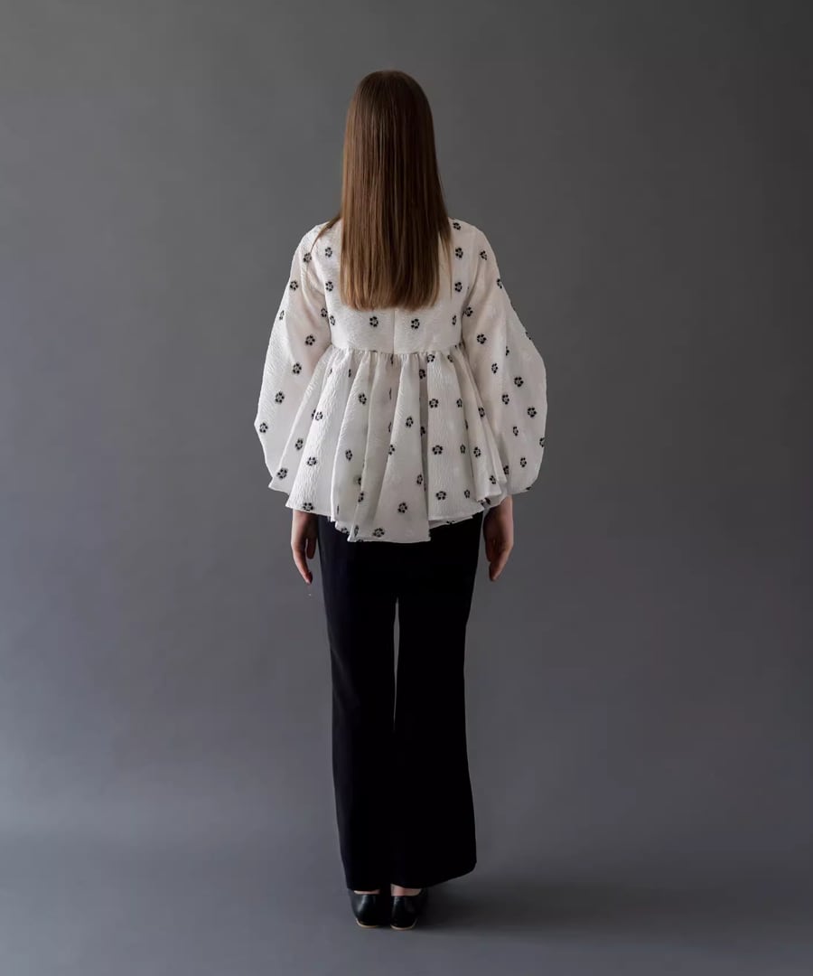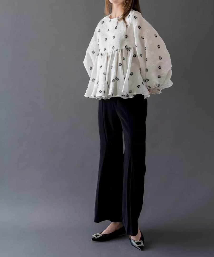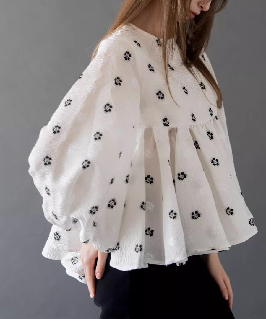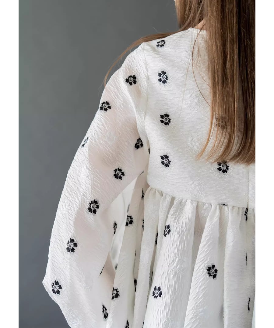 フレンチレトロな雰囲気を感じさせるジャカード花柄と、ランタンスリーブが華やかさを演出します。