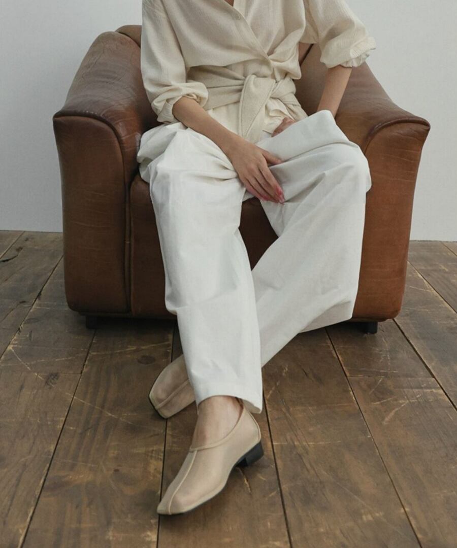 フレンチスクエアトゥのデザインが、独特のスタイルを演出。