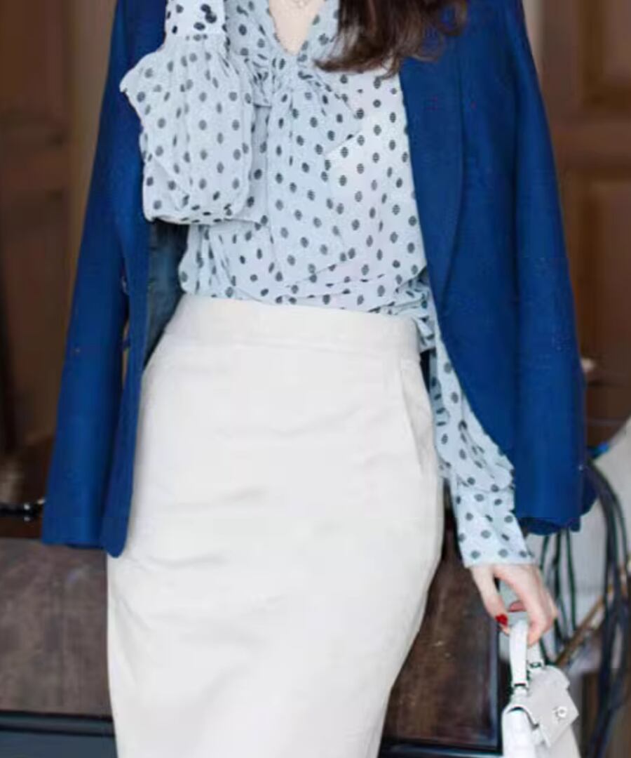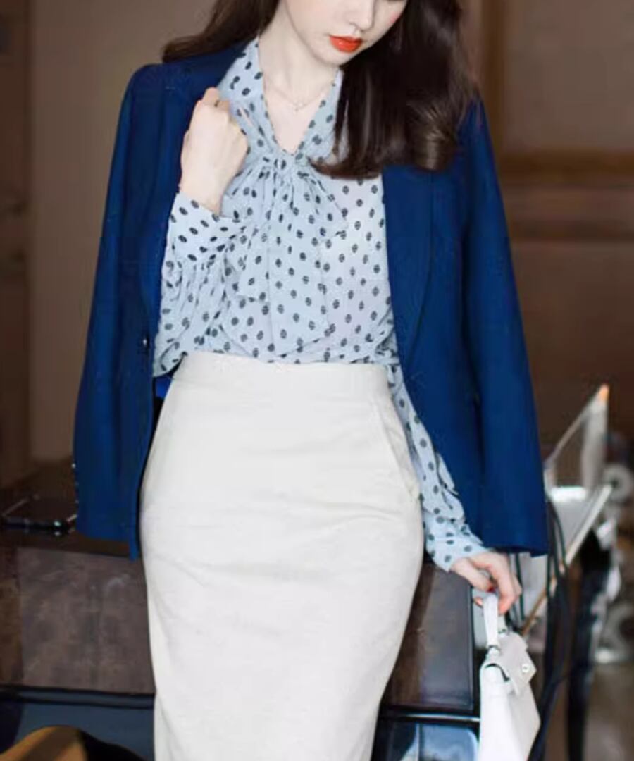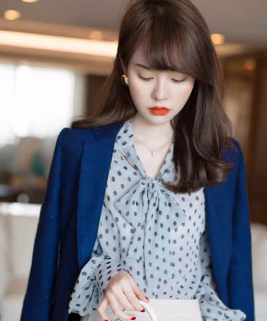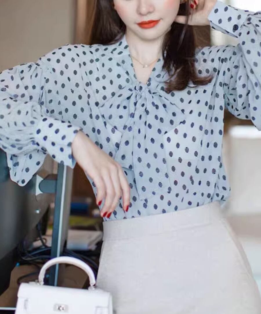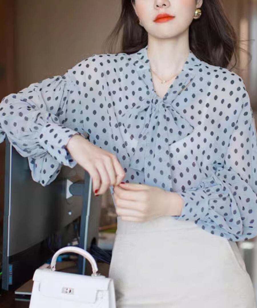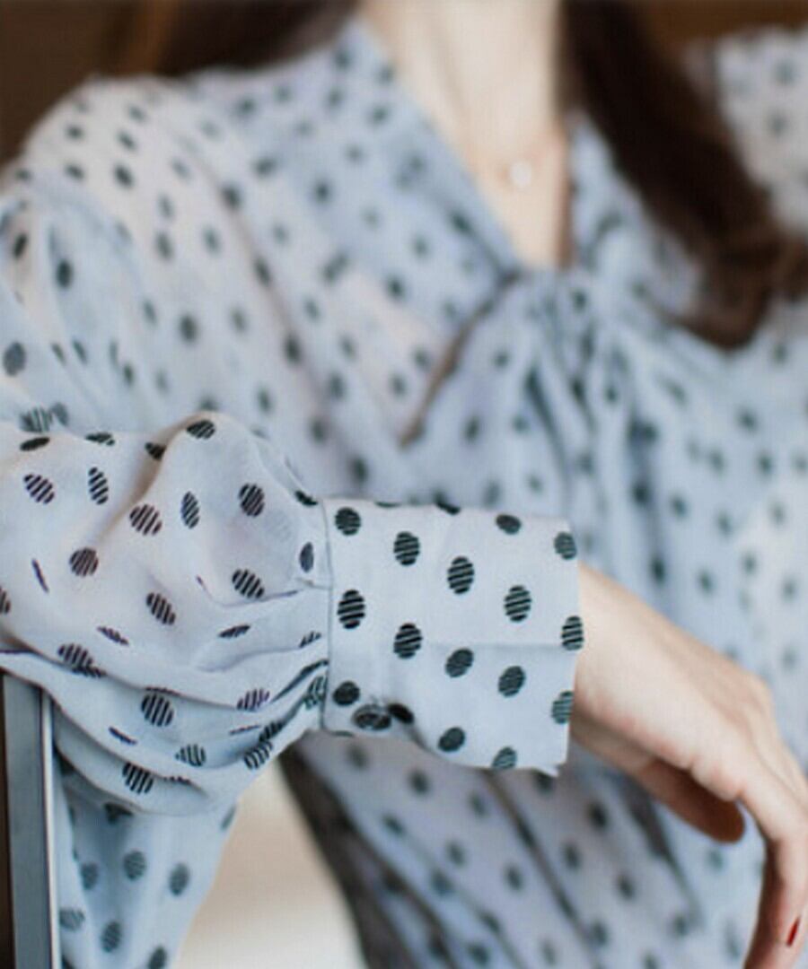 女性らしいシルエットの大人ドット柄ブラウス