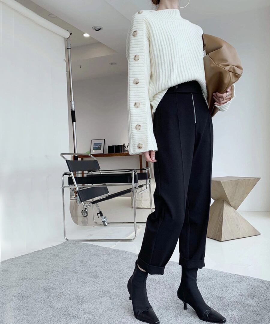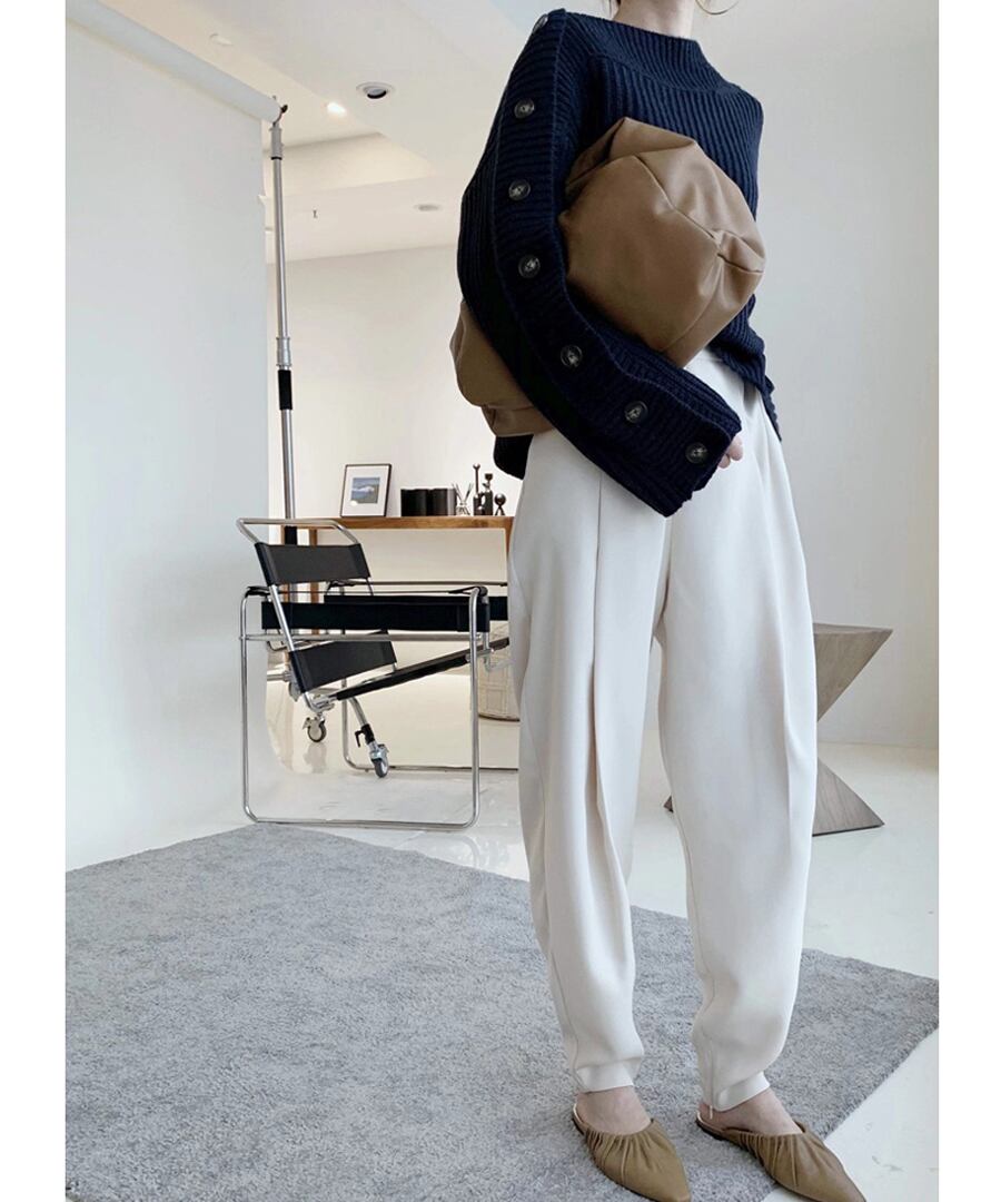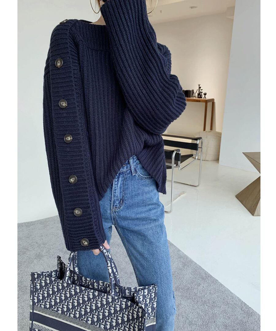 片方の肩からのボタンが印象的なデザイン