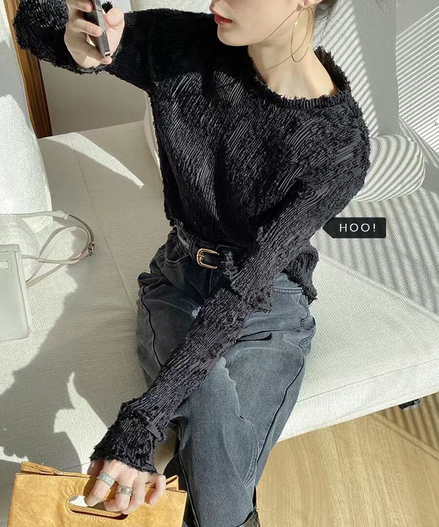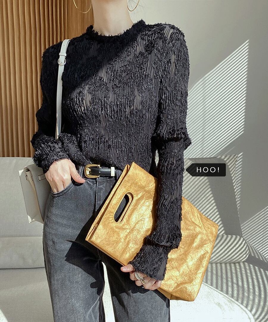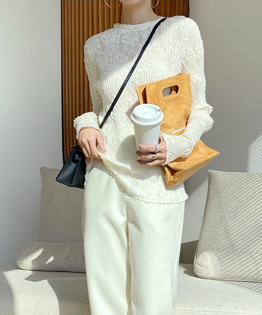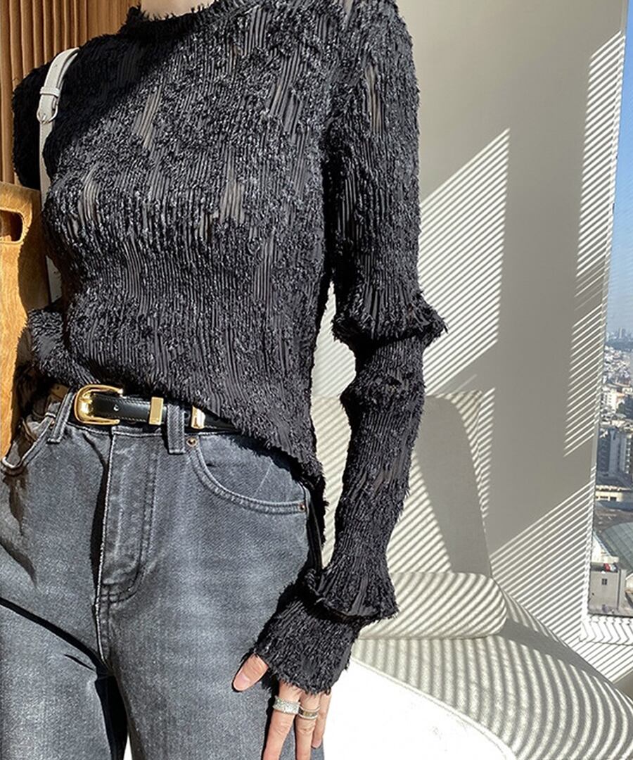 透け感のあるレース仕立てのフェミニンな印象のトップスです