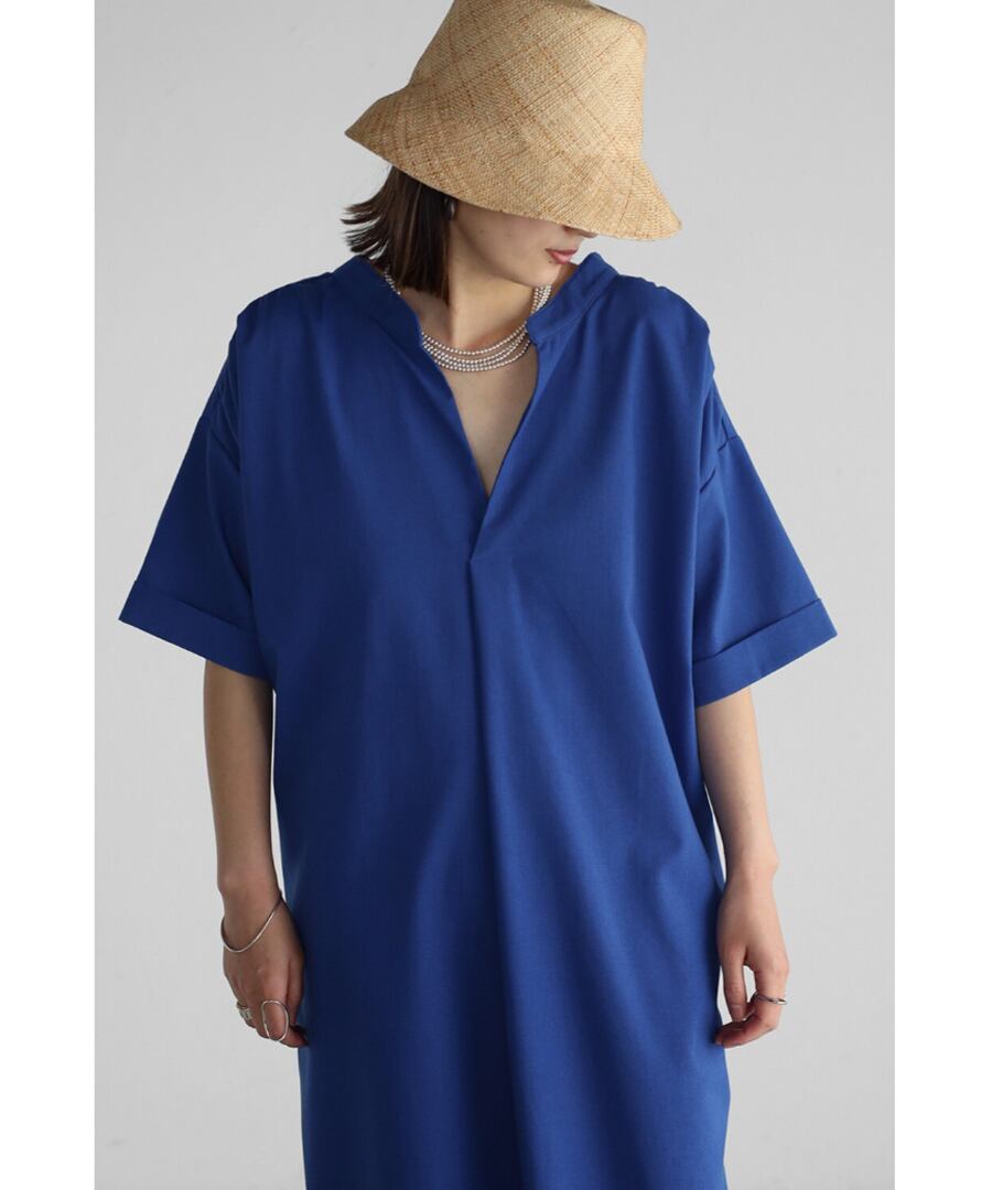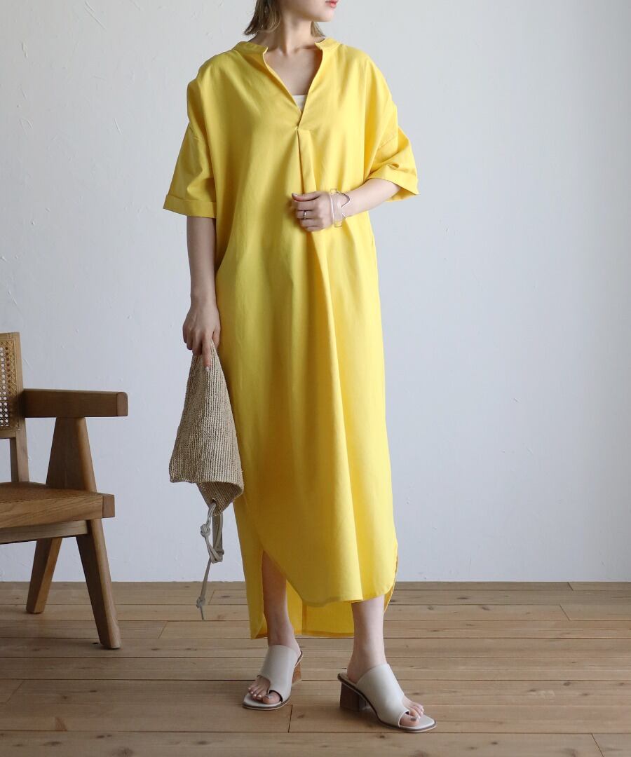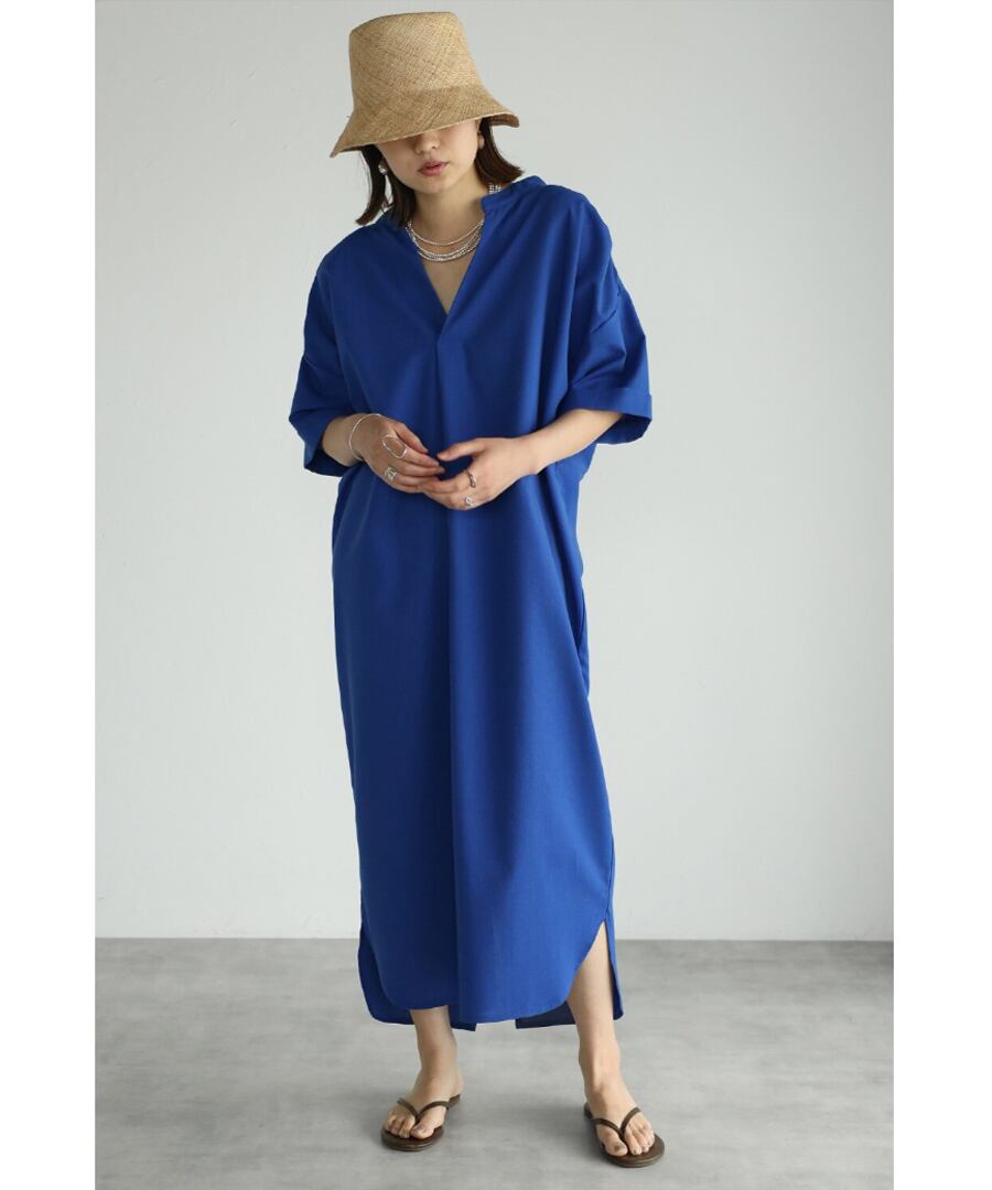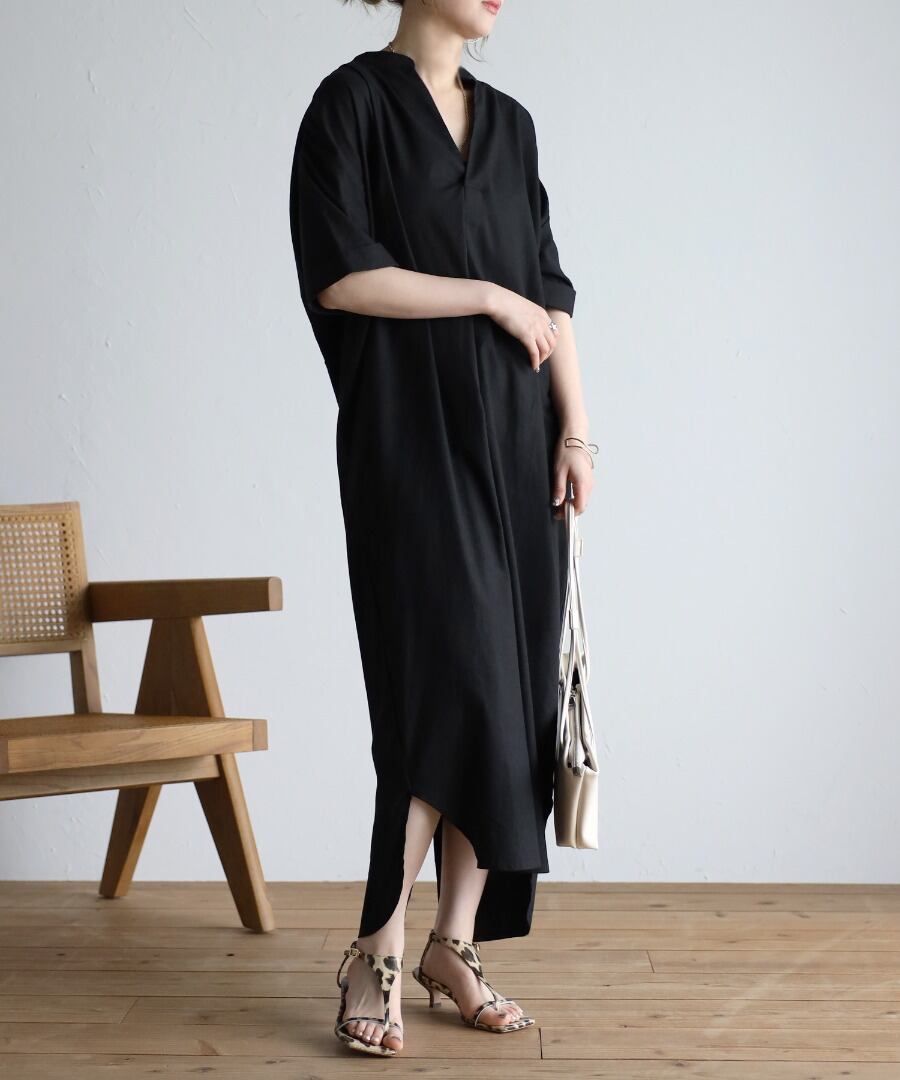 マキシ丈に空いた襟元というデザインが、バランスの整ったシルエットに。
