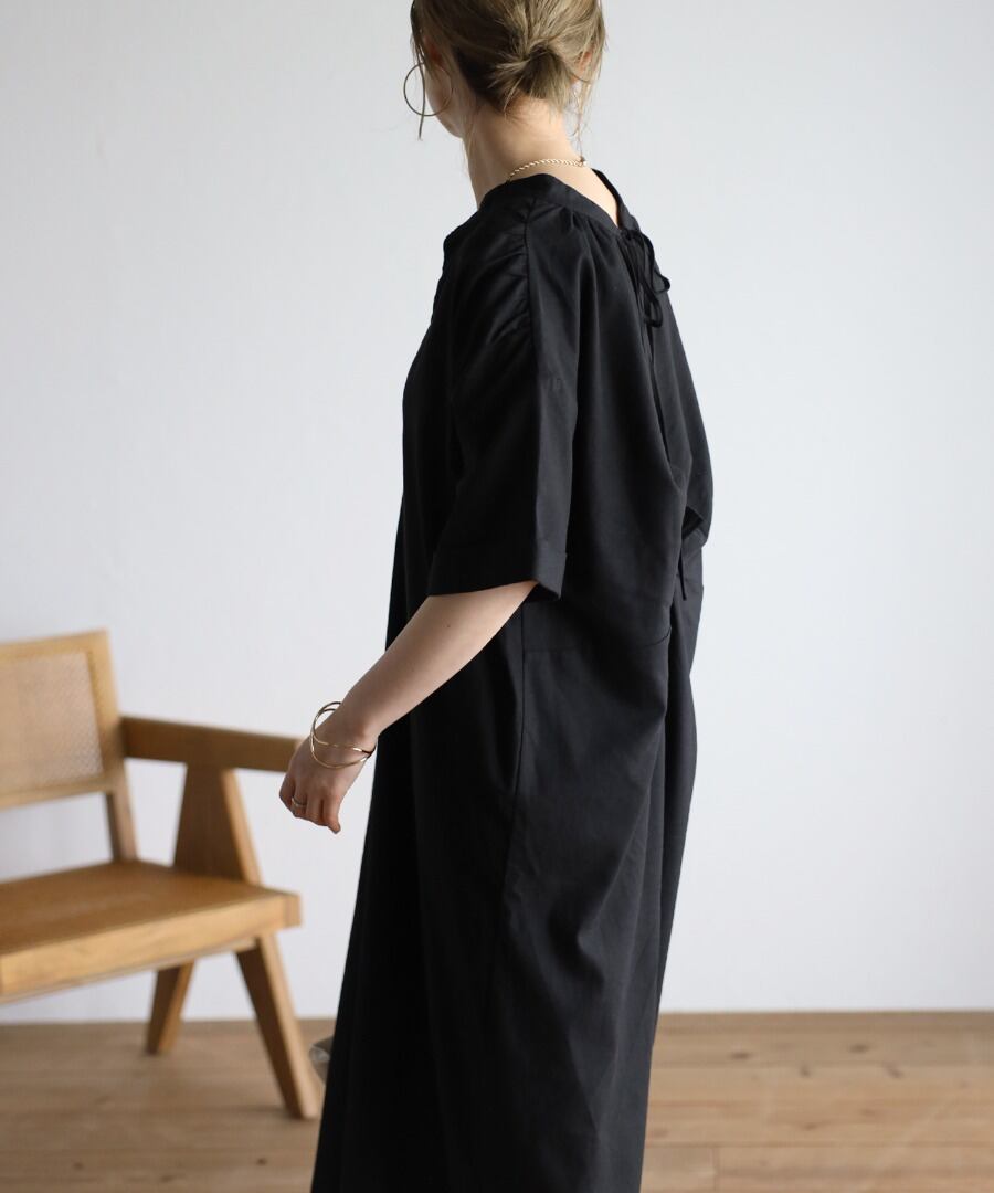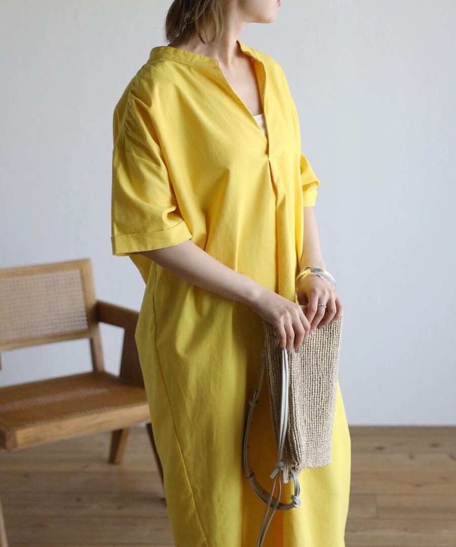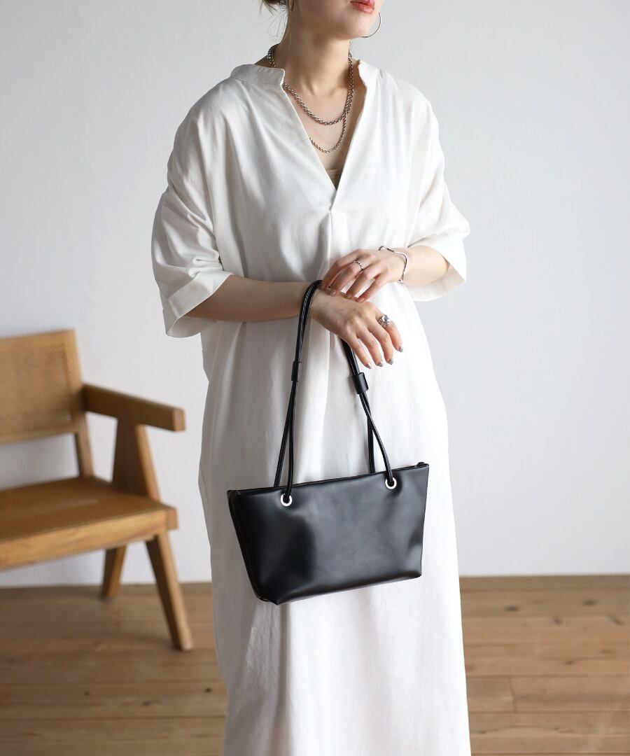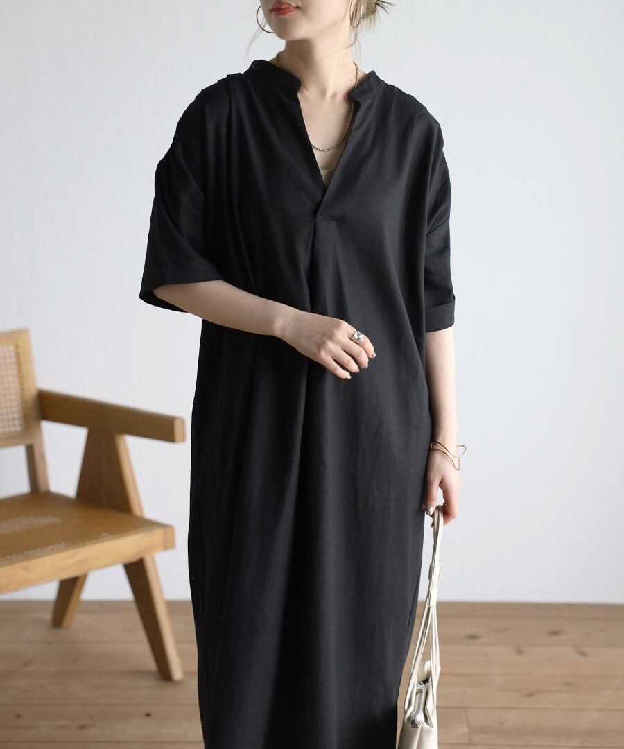 マキシ丈に空いた襟元というデザインが、バランスの整ったシルエットに。