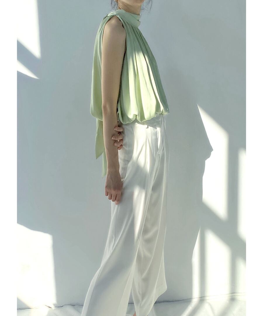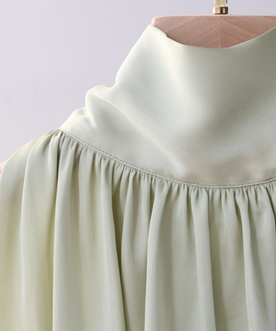 スタンドカラーの襟元とたっぷりのギャザーがお洒落なデザイン
