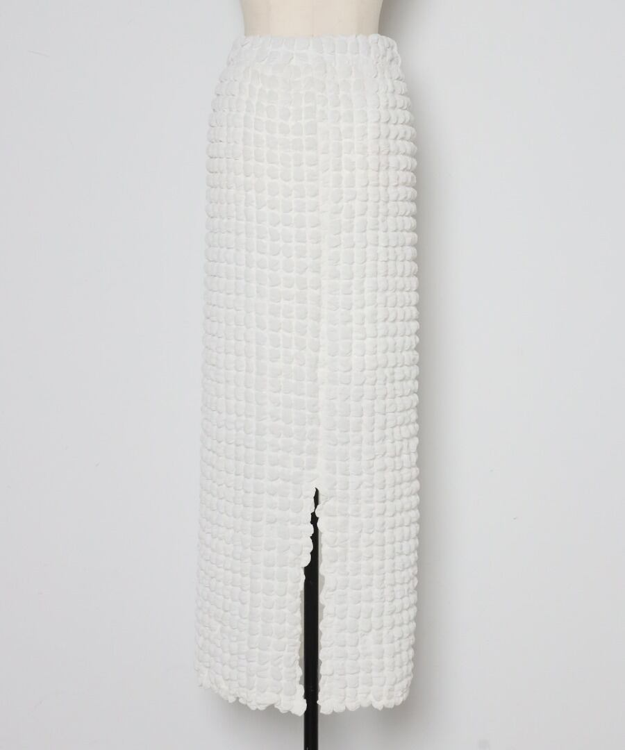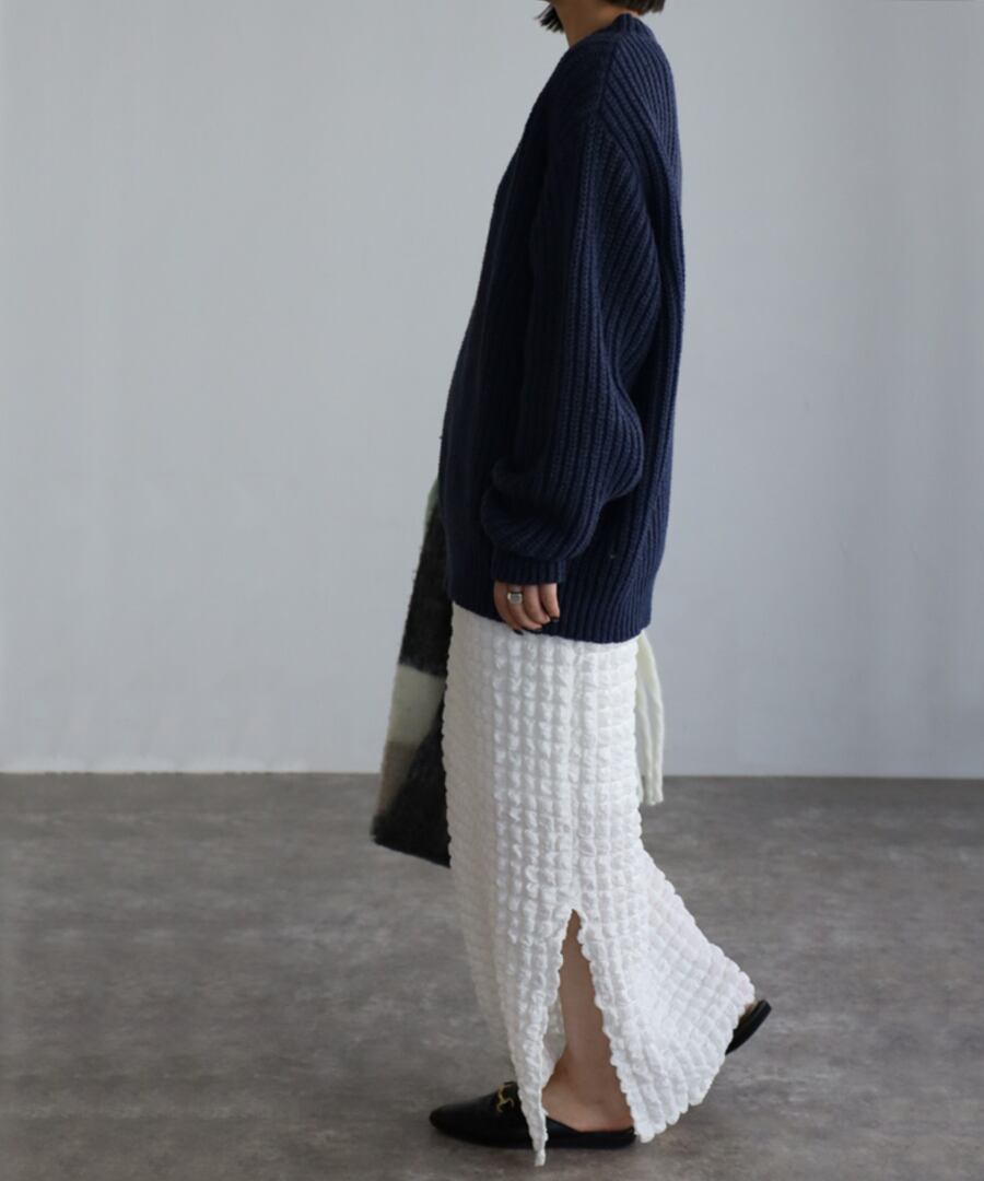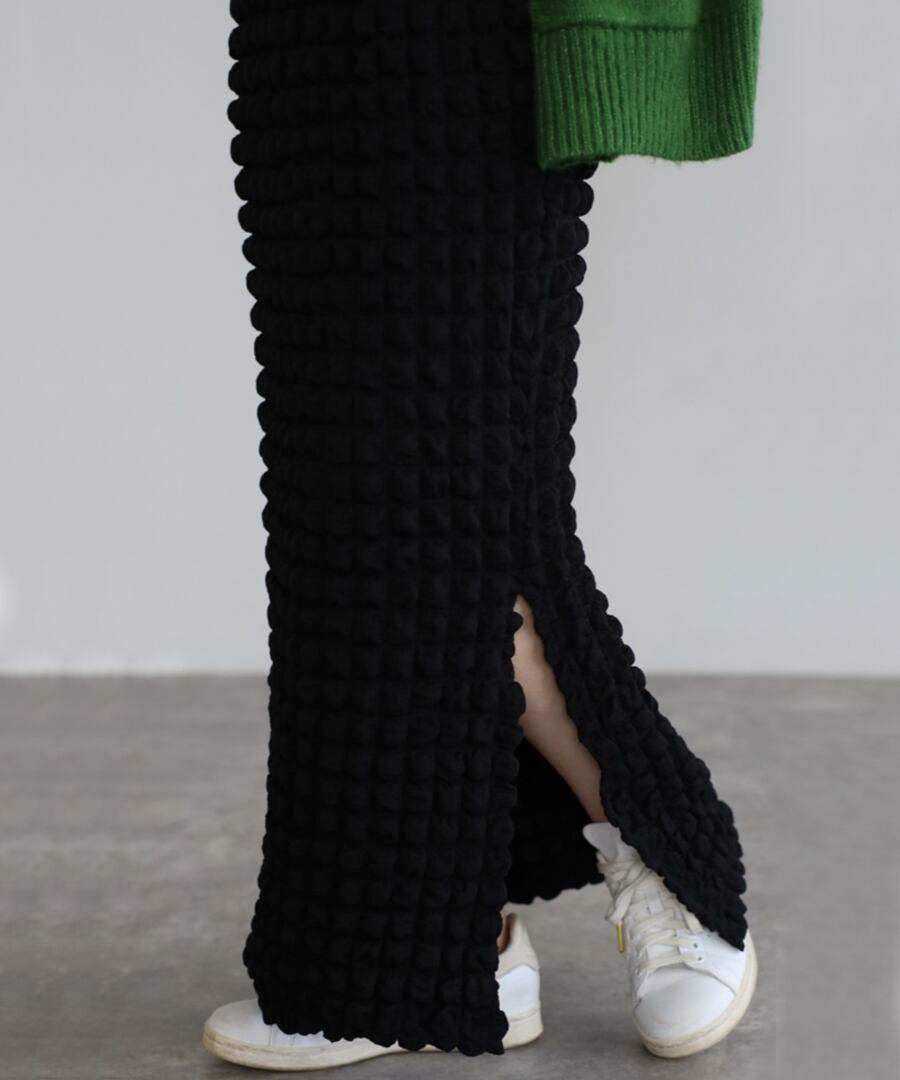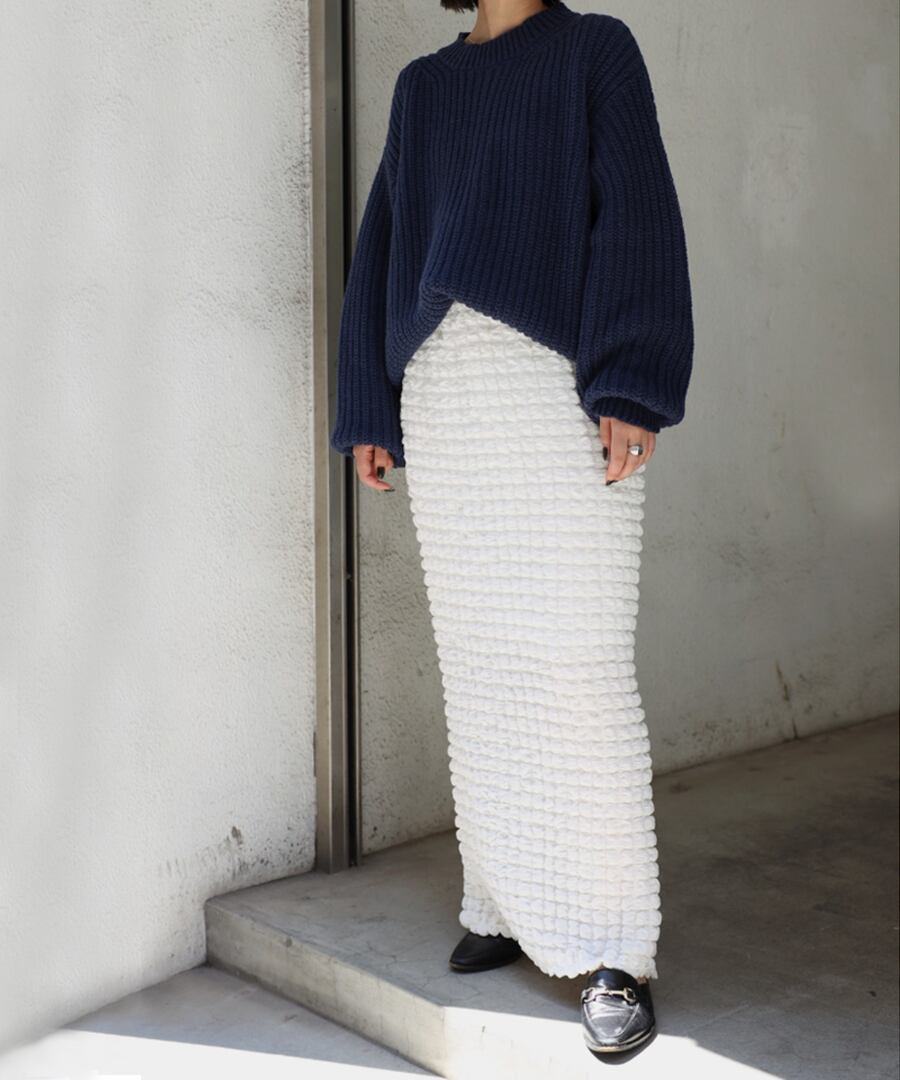デザイン性のあるスカートなのでシンプルなトップスとのコーデがおすすめ。