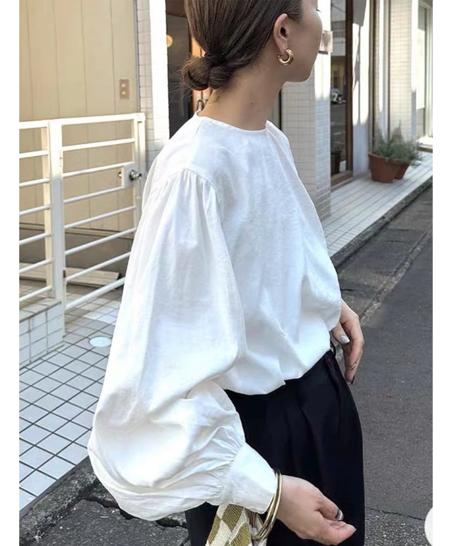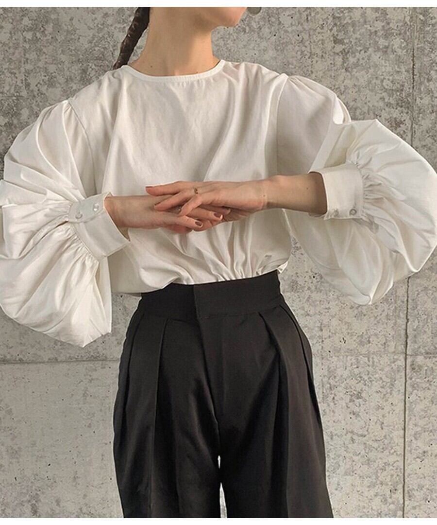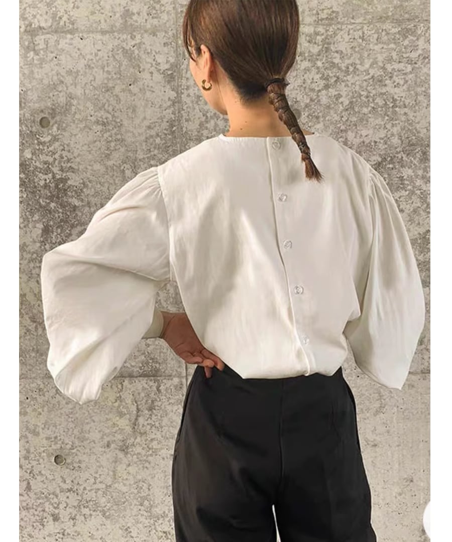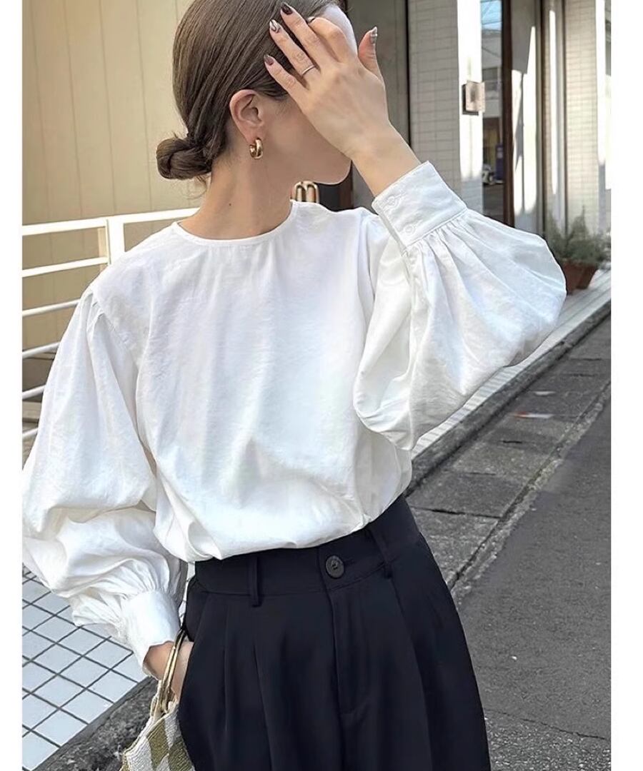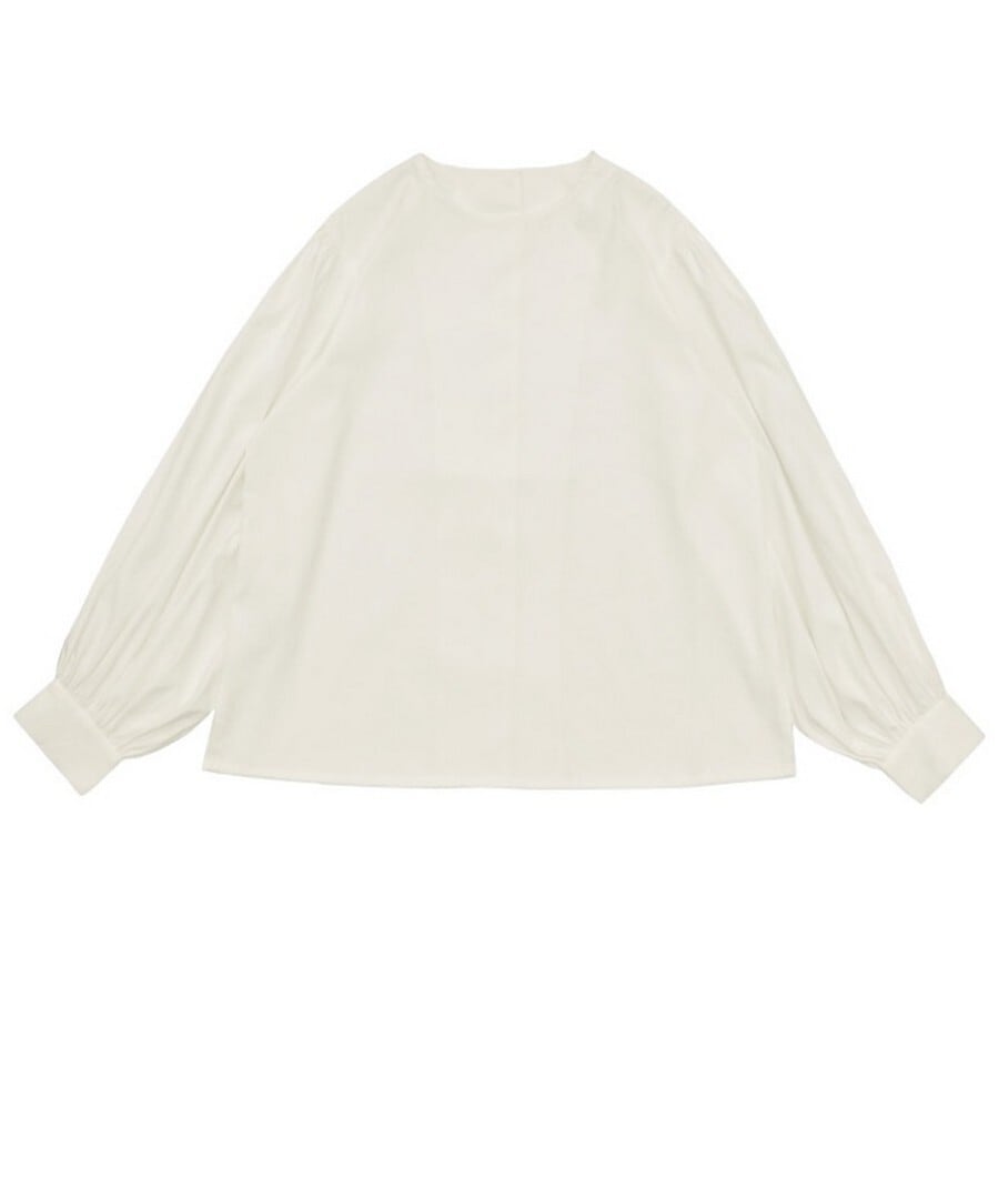 エレガントさを引き立てるバルーンスリーブ◆ノーカラーシャツ。