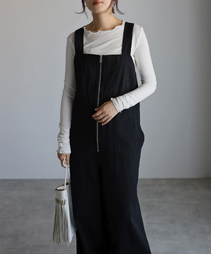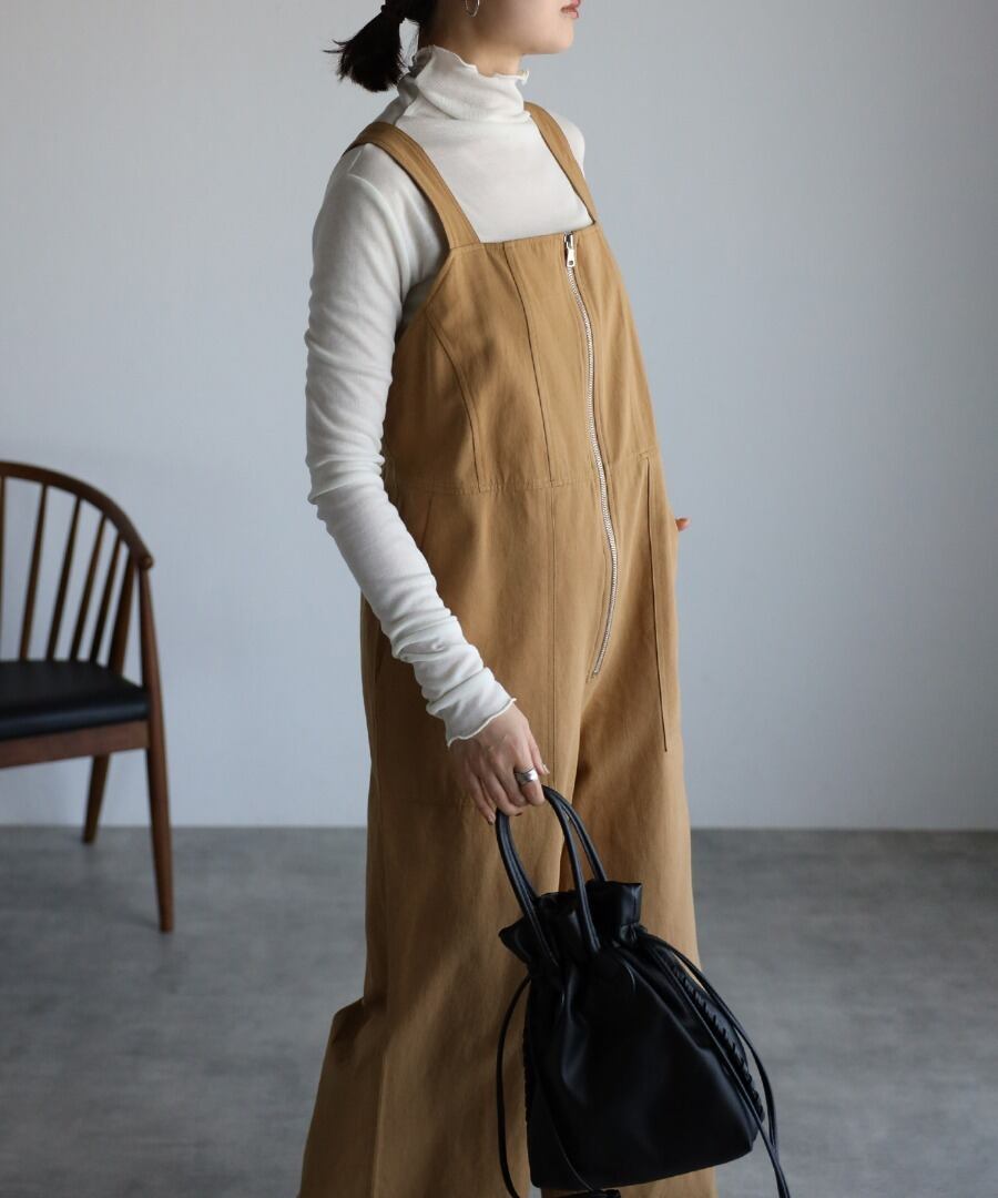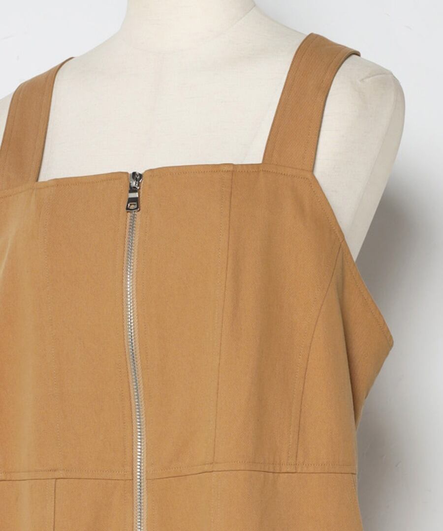 フロントのジップデザインで、ハイウエストが可愛いサロペット。
