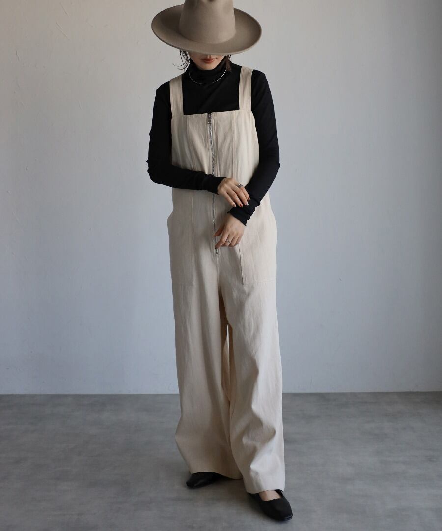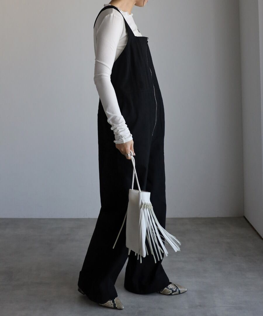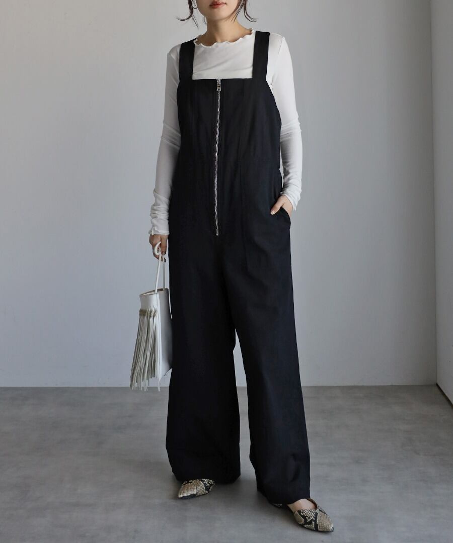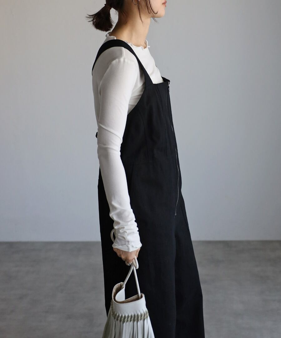 フロントのジップデザインで、ハイウエストが可愛いサロペット。