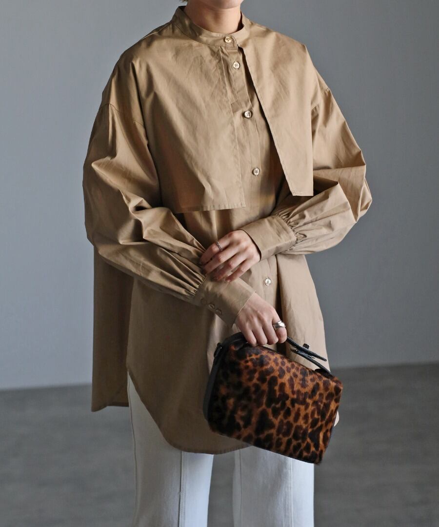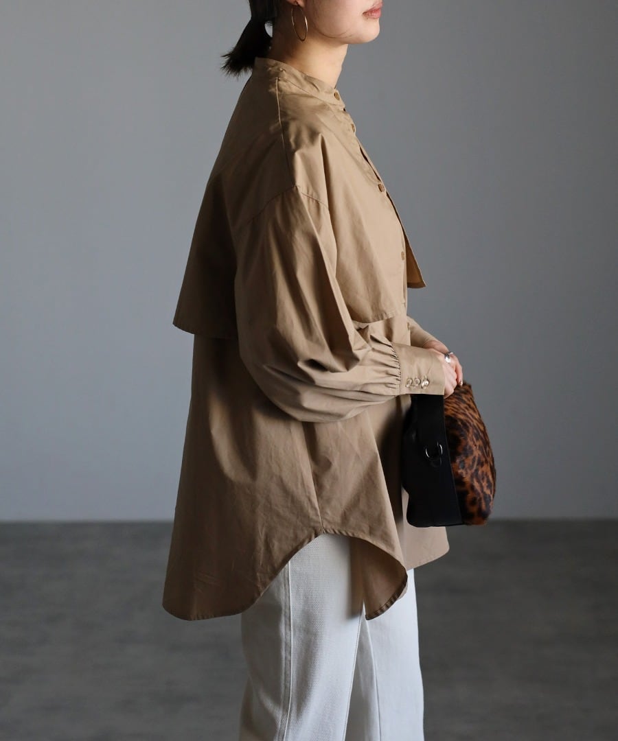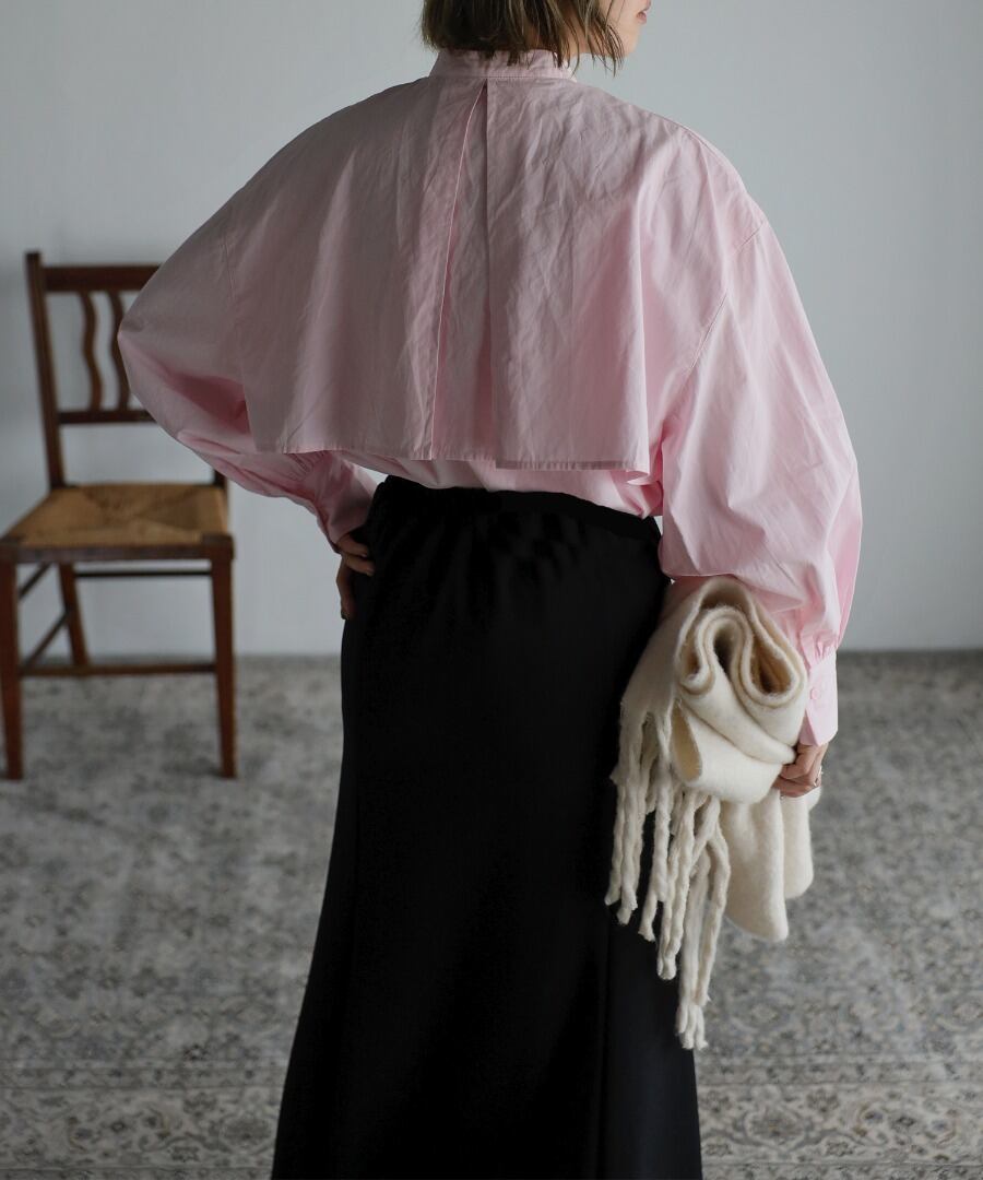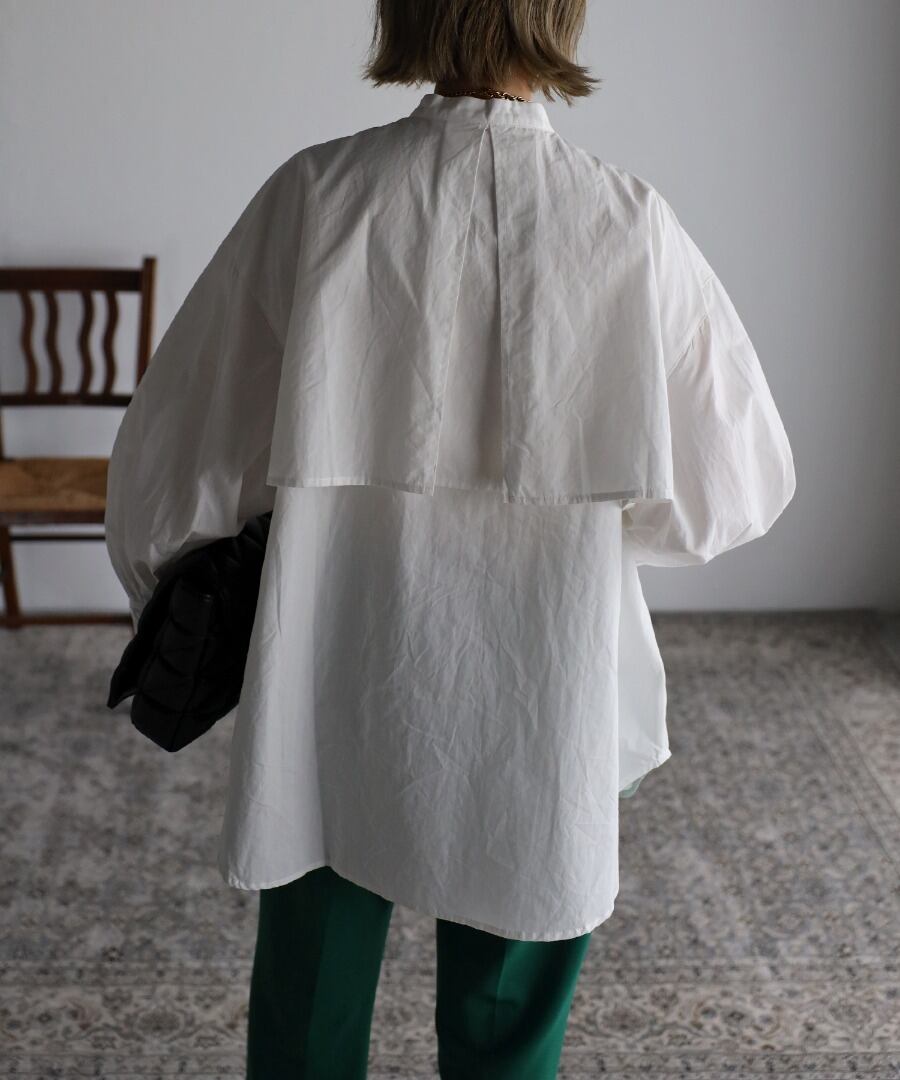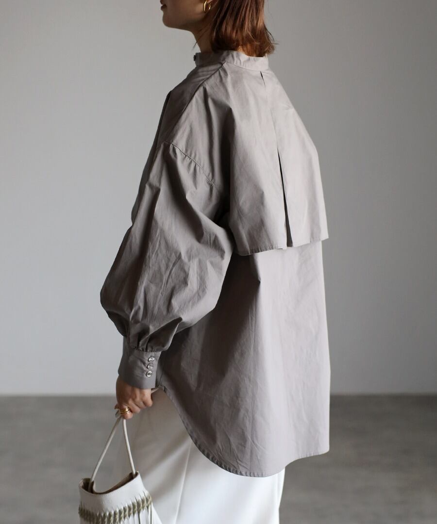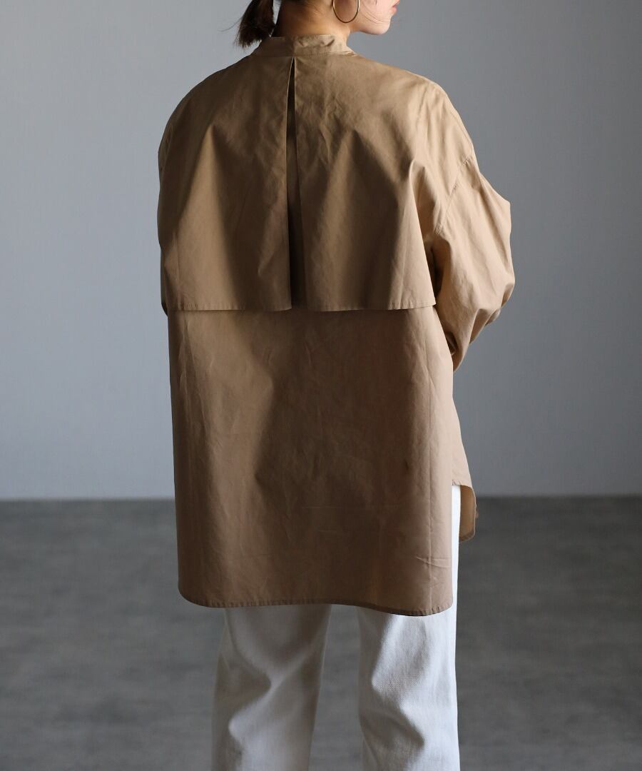 すっきりしたスタンドカラーにあしらったケープデザインで今年らしさ抜群。
