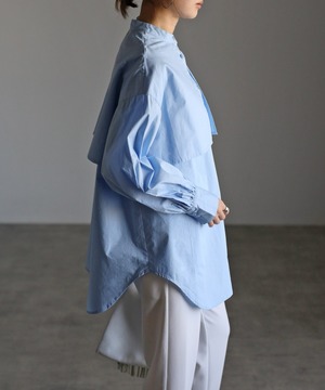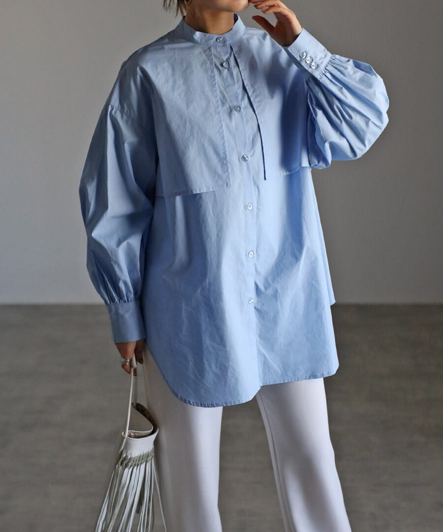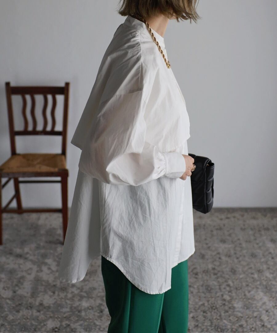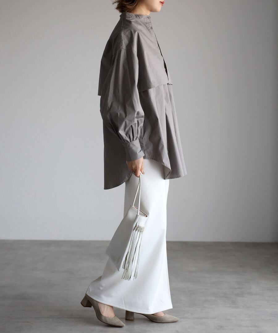 前開きのシャツだからこそできるこのテクニックは、こなれ感が出ておすすめです。