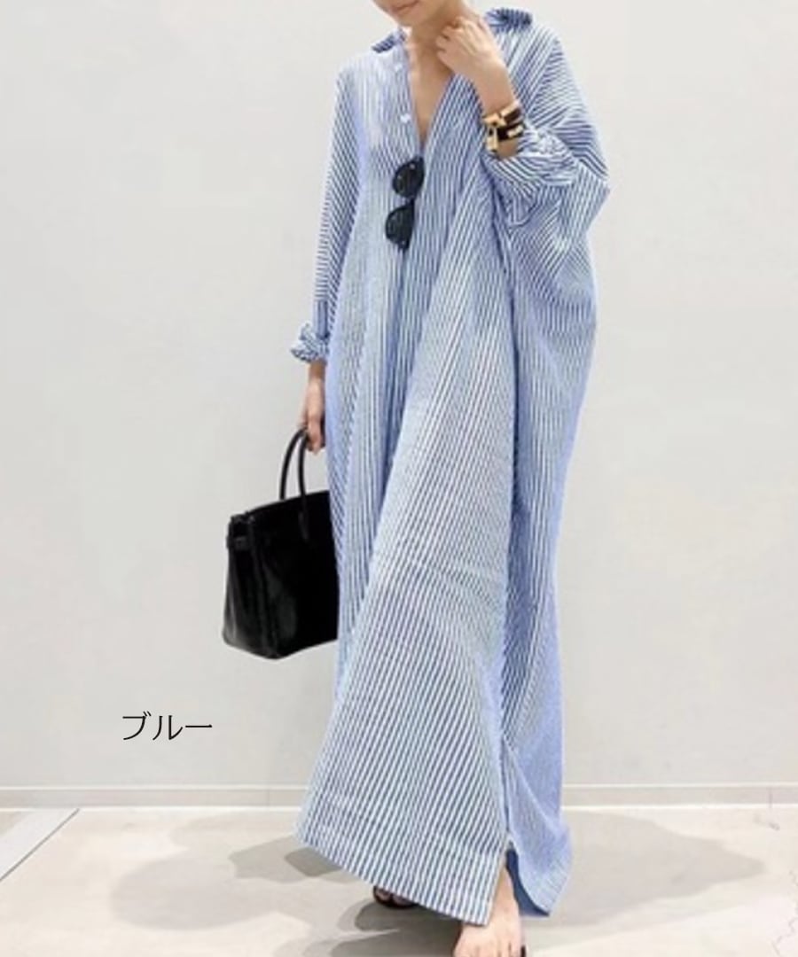 マキシ丈◆ストライプシャツワンピ【w-30057】