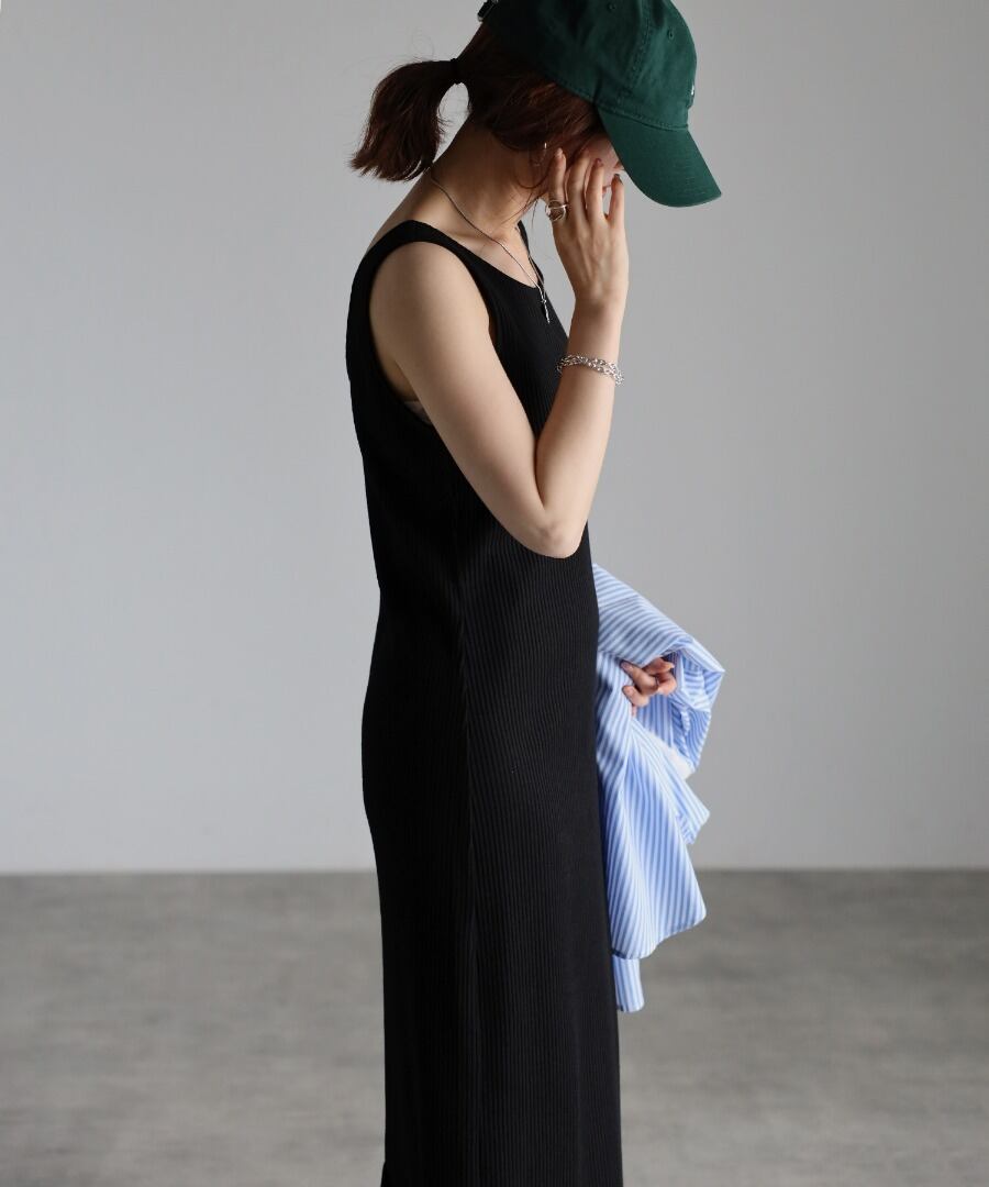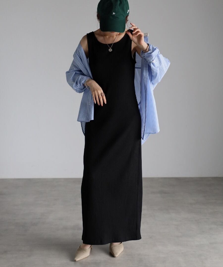 ワンピースはリブ素材のマキシ丈で、1枚でもすっきりと着られるシルエット。