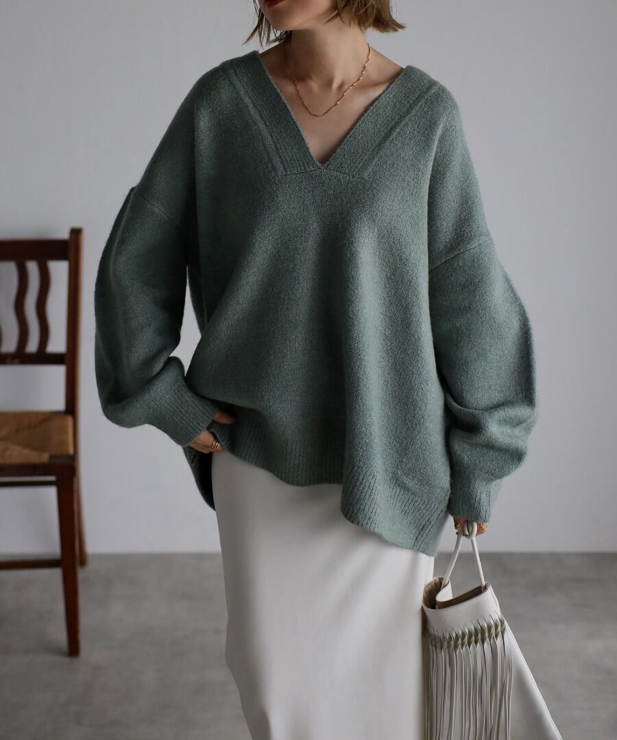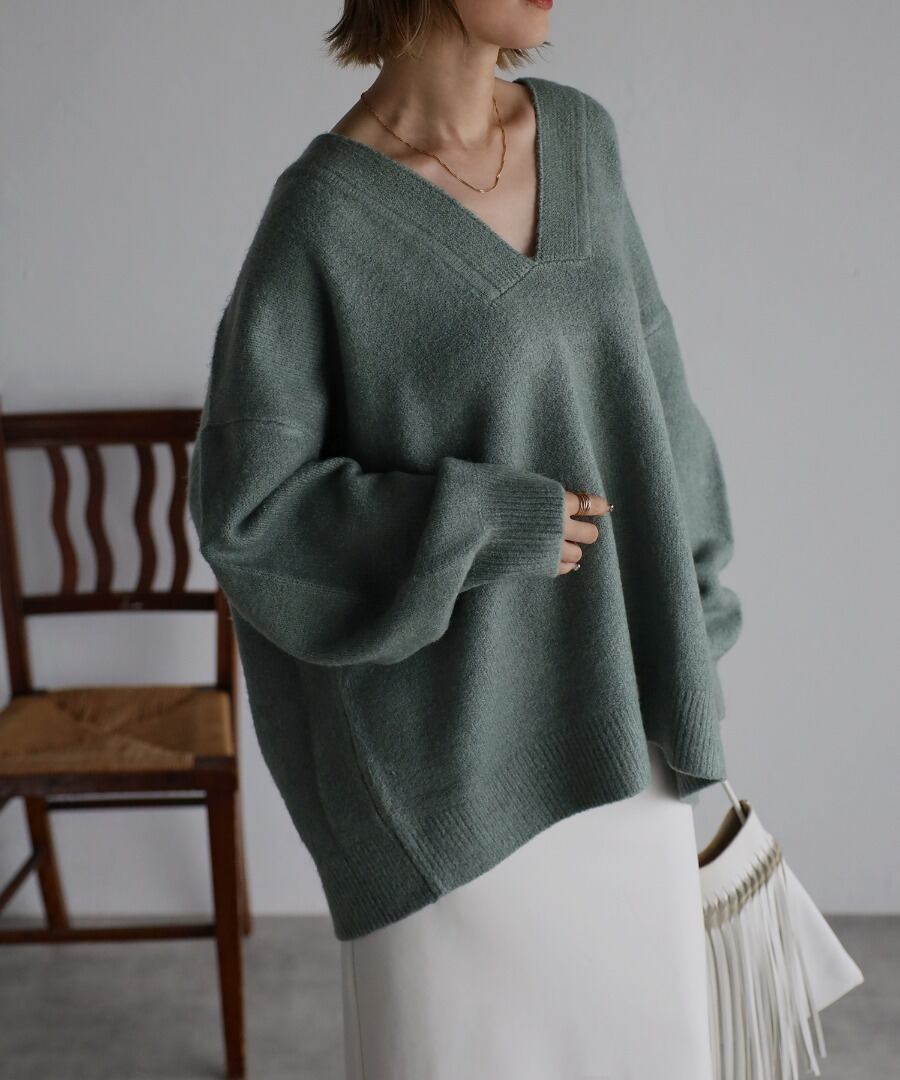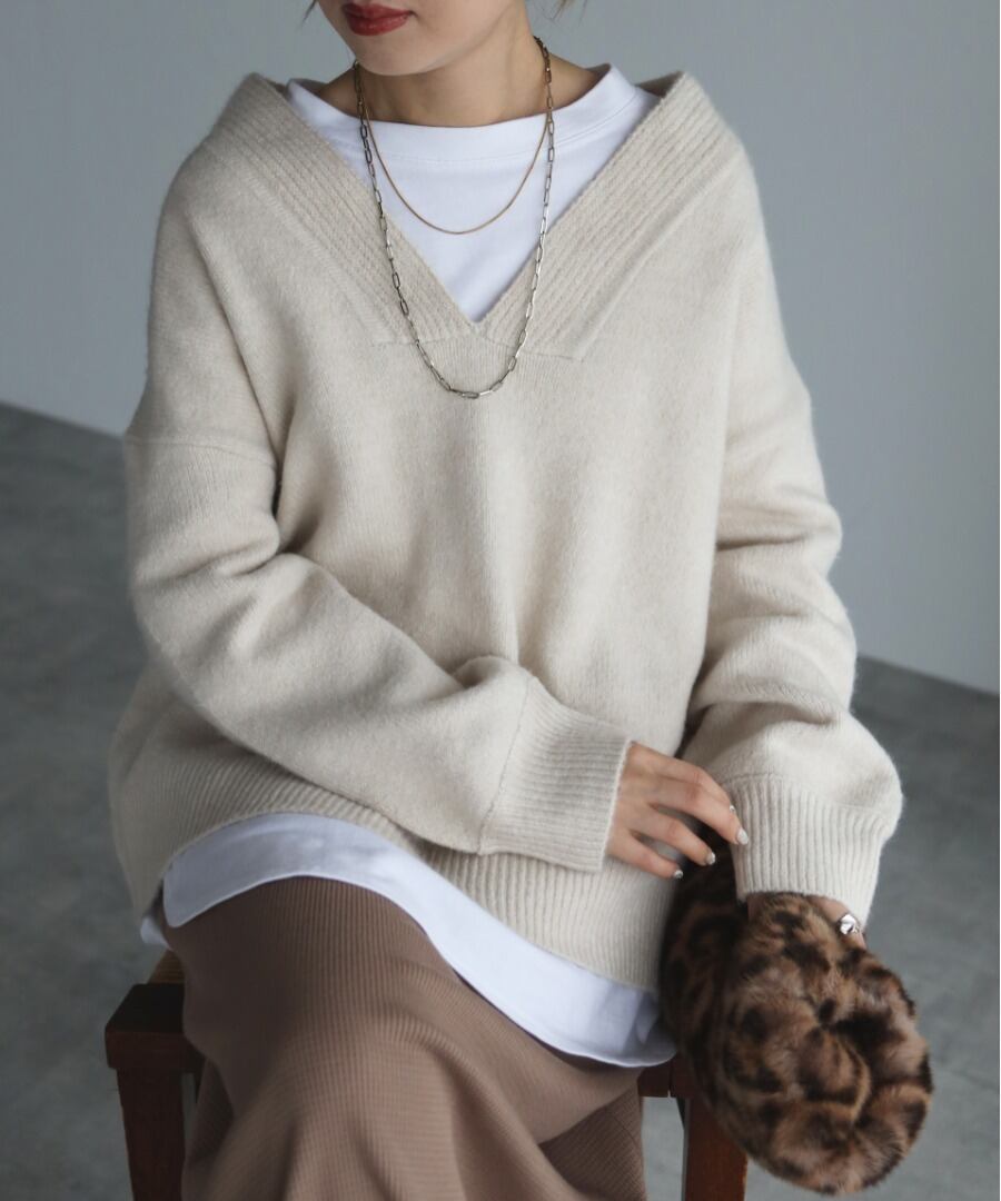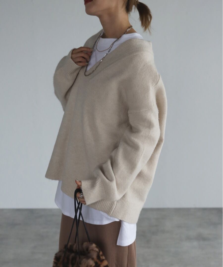 深めのVネック開きでオーバーサイズの抜け感のあるシルエット。